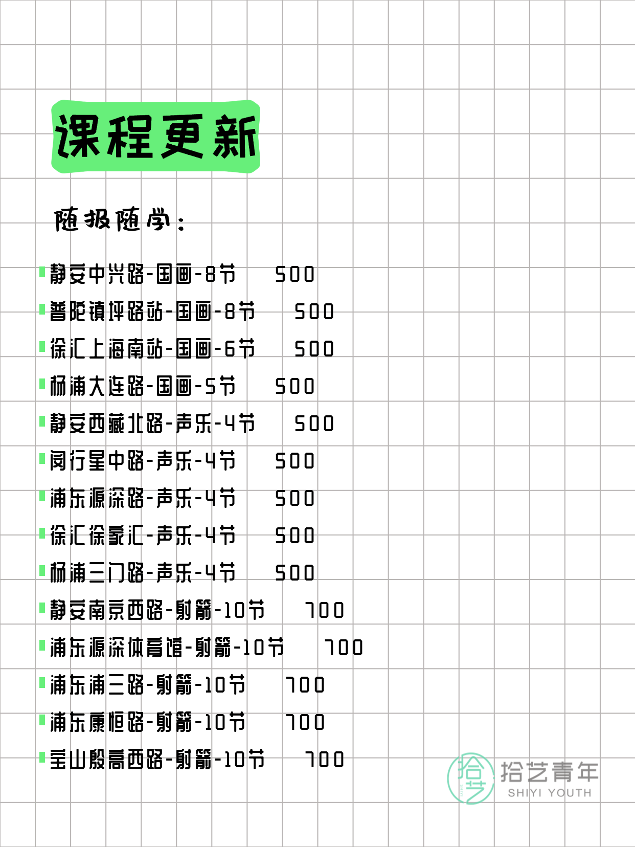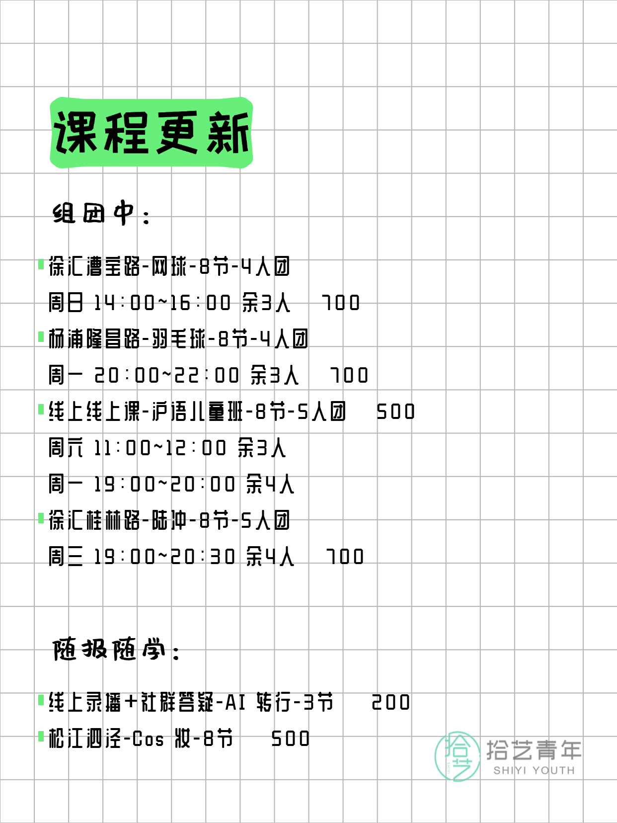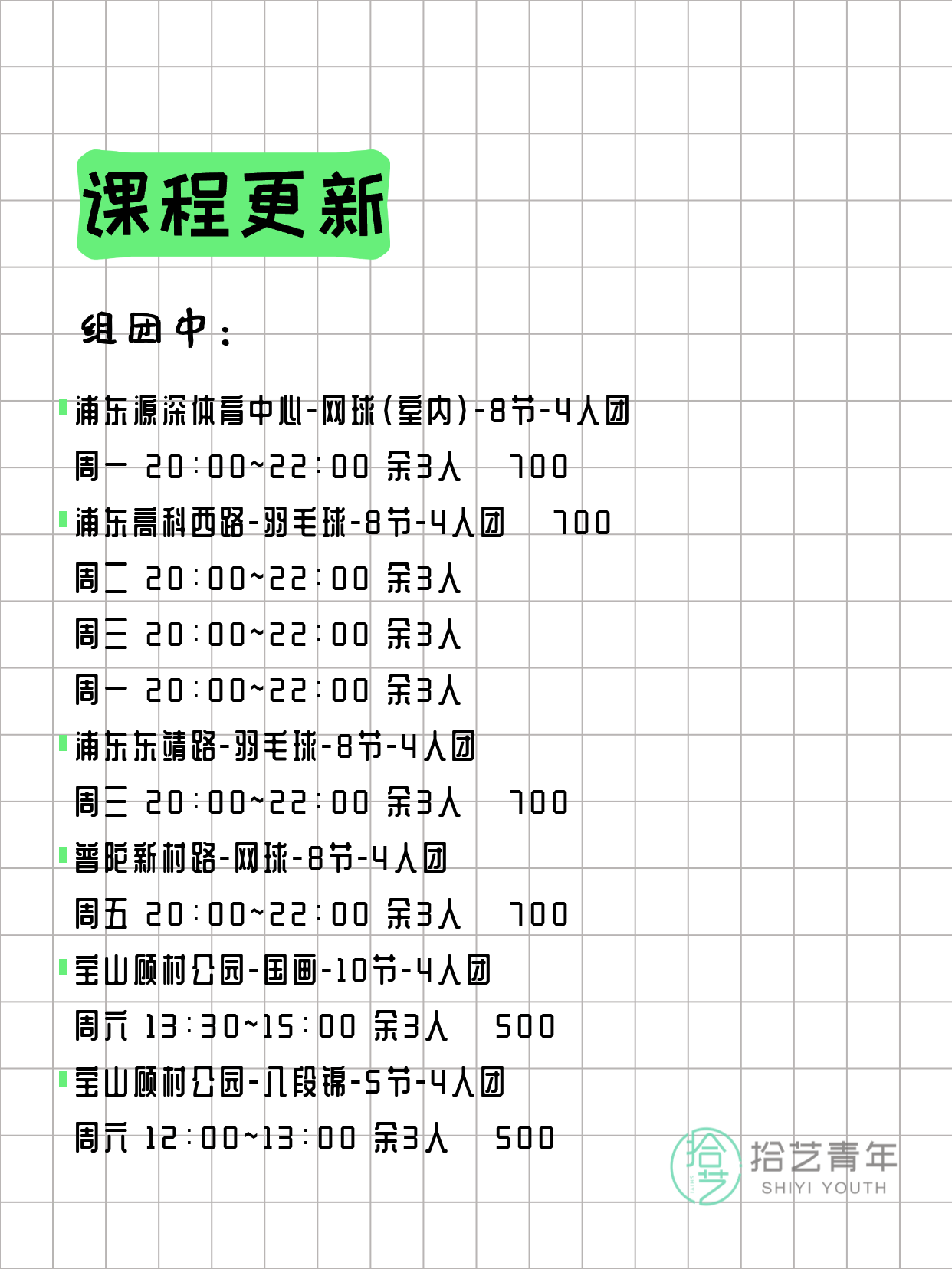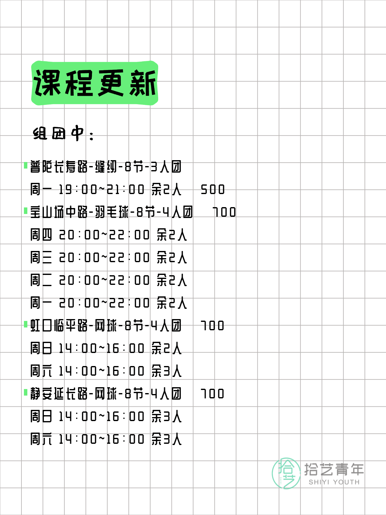 资讯>综合>正文3月24日上海夜校课程合集拾艺青年2026-03-241 / 17📊 本期课程概况• 总课程数:366门• 组团中课程:78门• 覆盖区域:15个区详见图片,欢迎报名咨询。💡 提示:以上课程信息来自拾艺青年小程序,课程可能随报名动态变化,具体以小程序实时信息为准。👉 微信小程序链接:#小程序://拾艺青年/WmfwH22mnQUxZwb