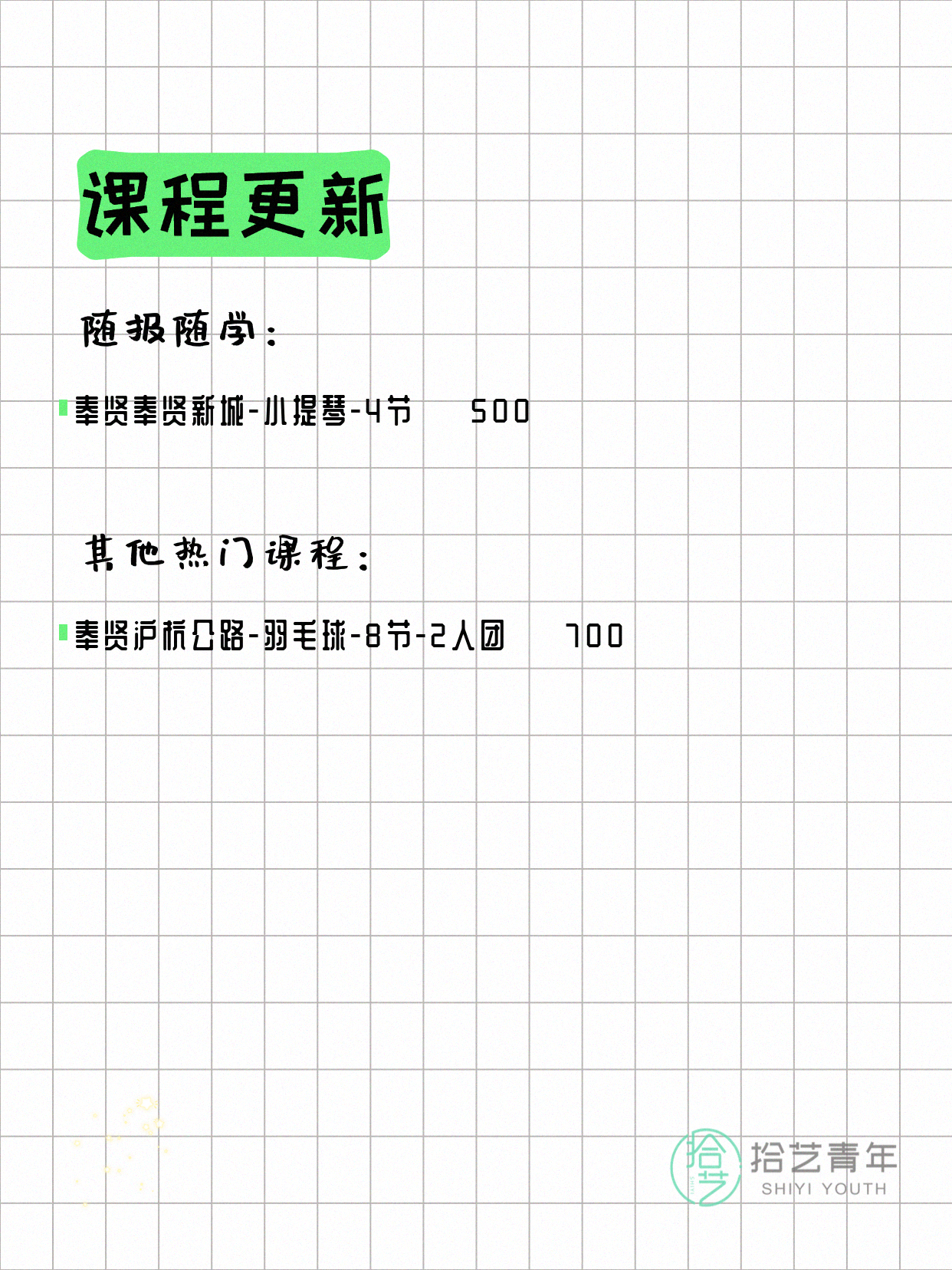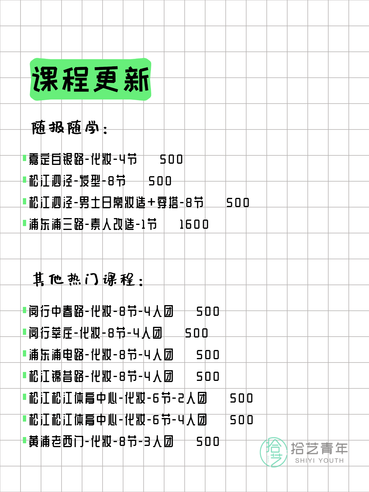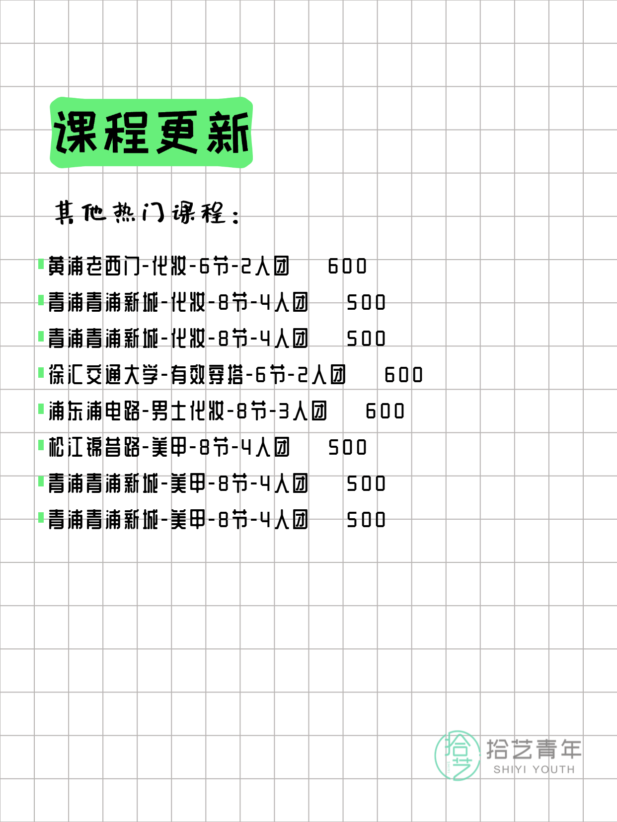 💡 提示:以上课程信息来自拾艺青年小程序,课程可能随报名动态变化,具体以小程序实时信息为准。