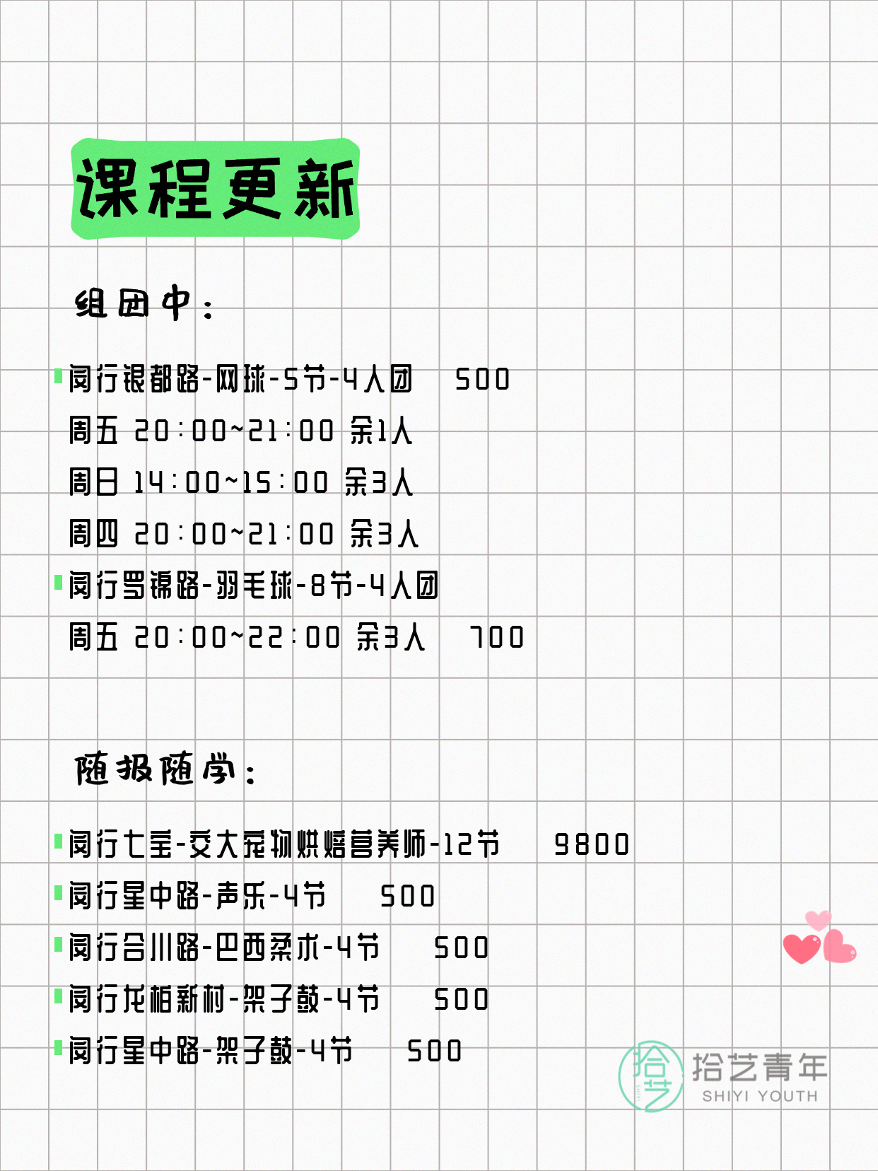 💡 提示:以上课程信息来自拾艺青年小程序,课程可能随报名动态变化,具体以小程序实时信息为准。