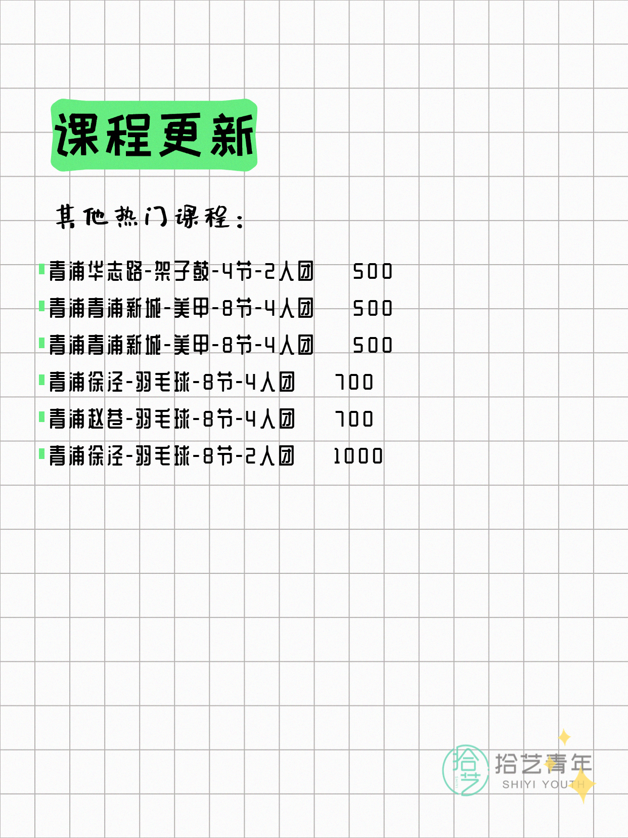 💡 提示:以上课程信息来自拾艺青年小程序,课程可能随报名动态变化,具体以小程序实时信息为准。