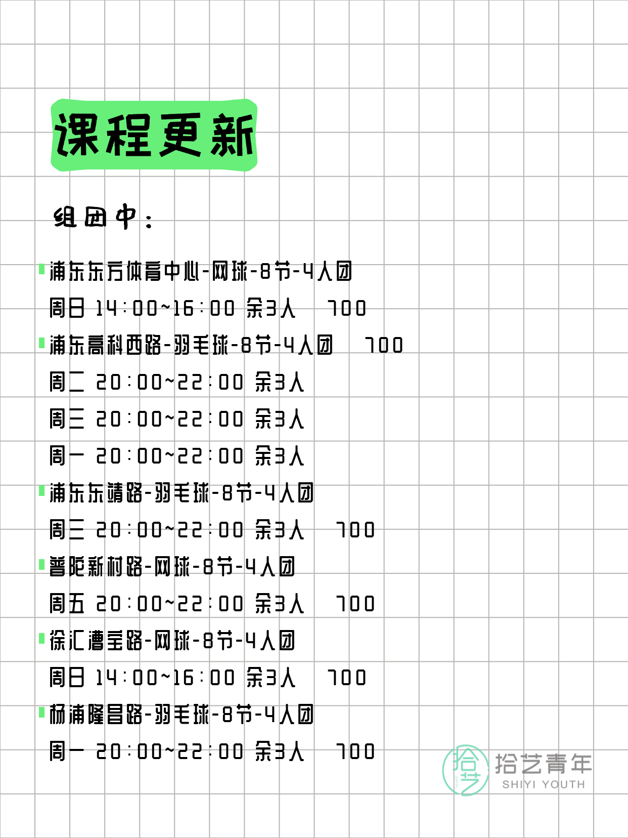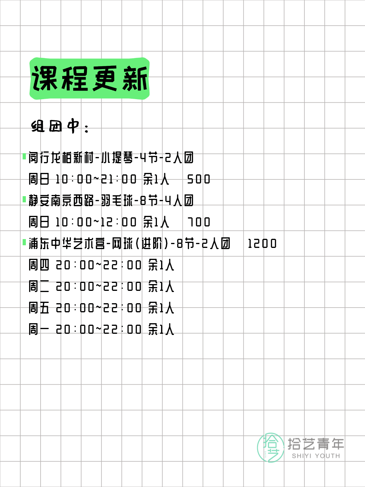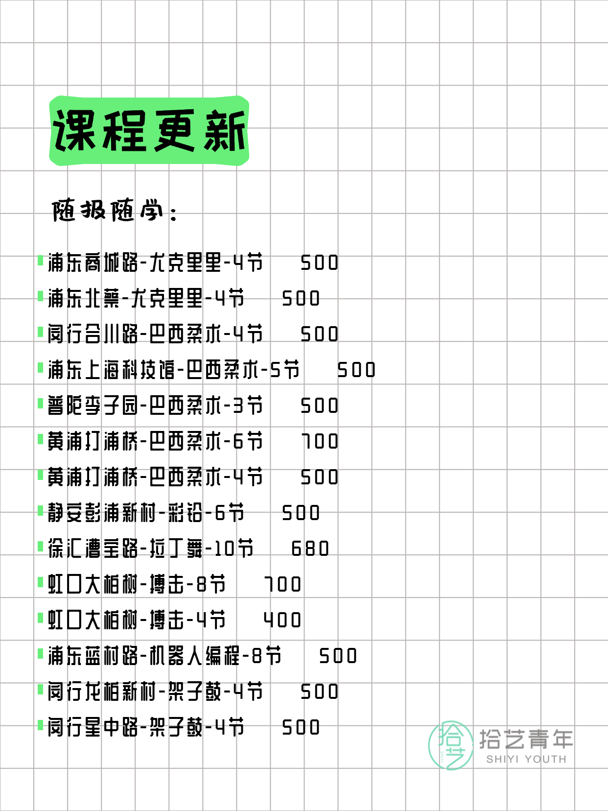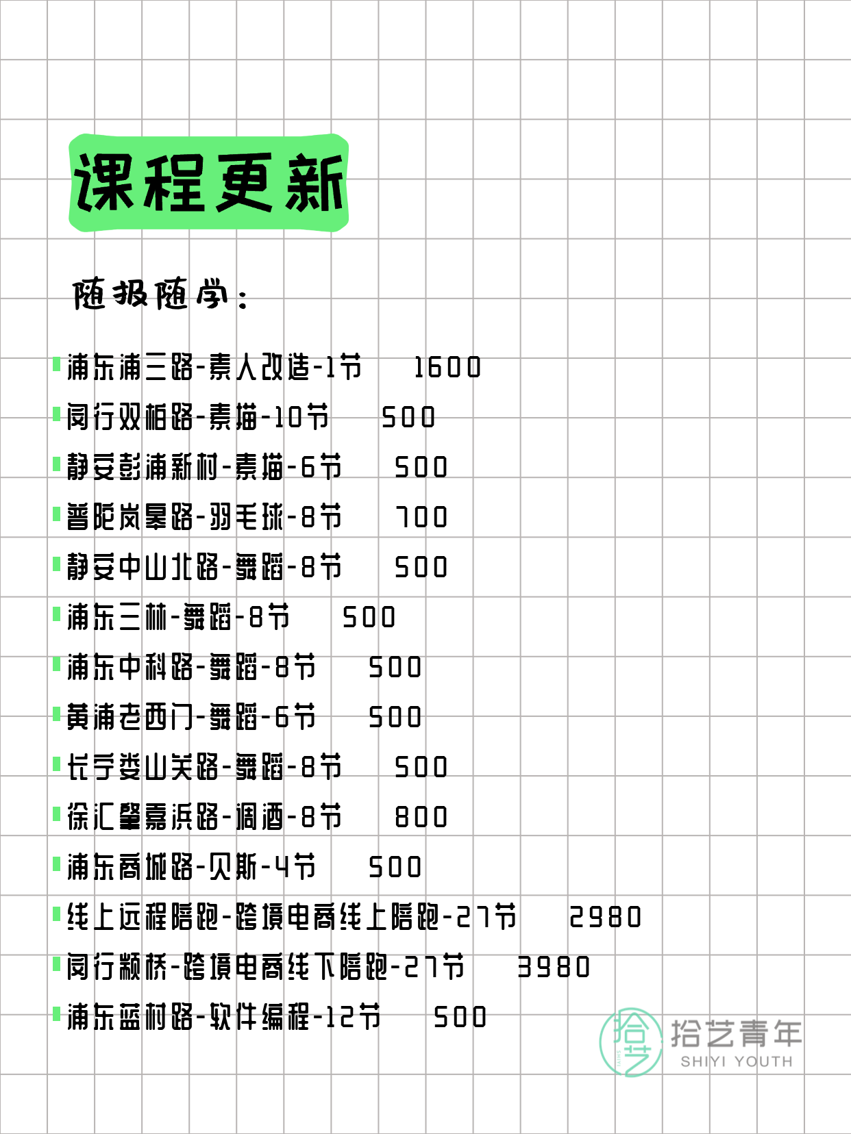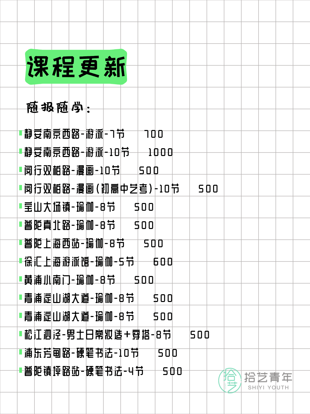 资讯>综合>正文3月25日上海夜校课程合集拾艺青年2026-03-251 / 17📊 本期课程概况• 总课程数:363门• 组团中课程:70门• 覆盖区域:15个区详见图片,欢迎报名咨询。💡 提示:以上课程信息来自拾艺青年小程序,课程可能随报名动态变化,具体以小程序实时信息为准。👉 微信小程序链接:#小程序://拾艺青年/WmfwH22mnQUxZwb