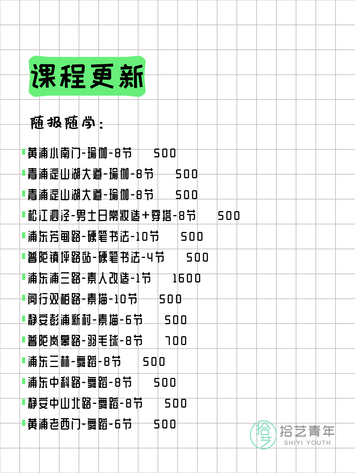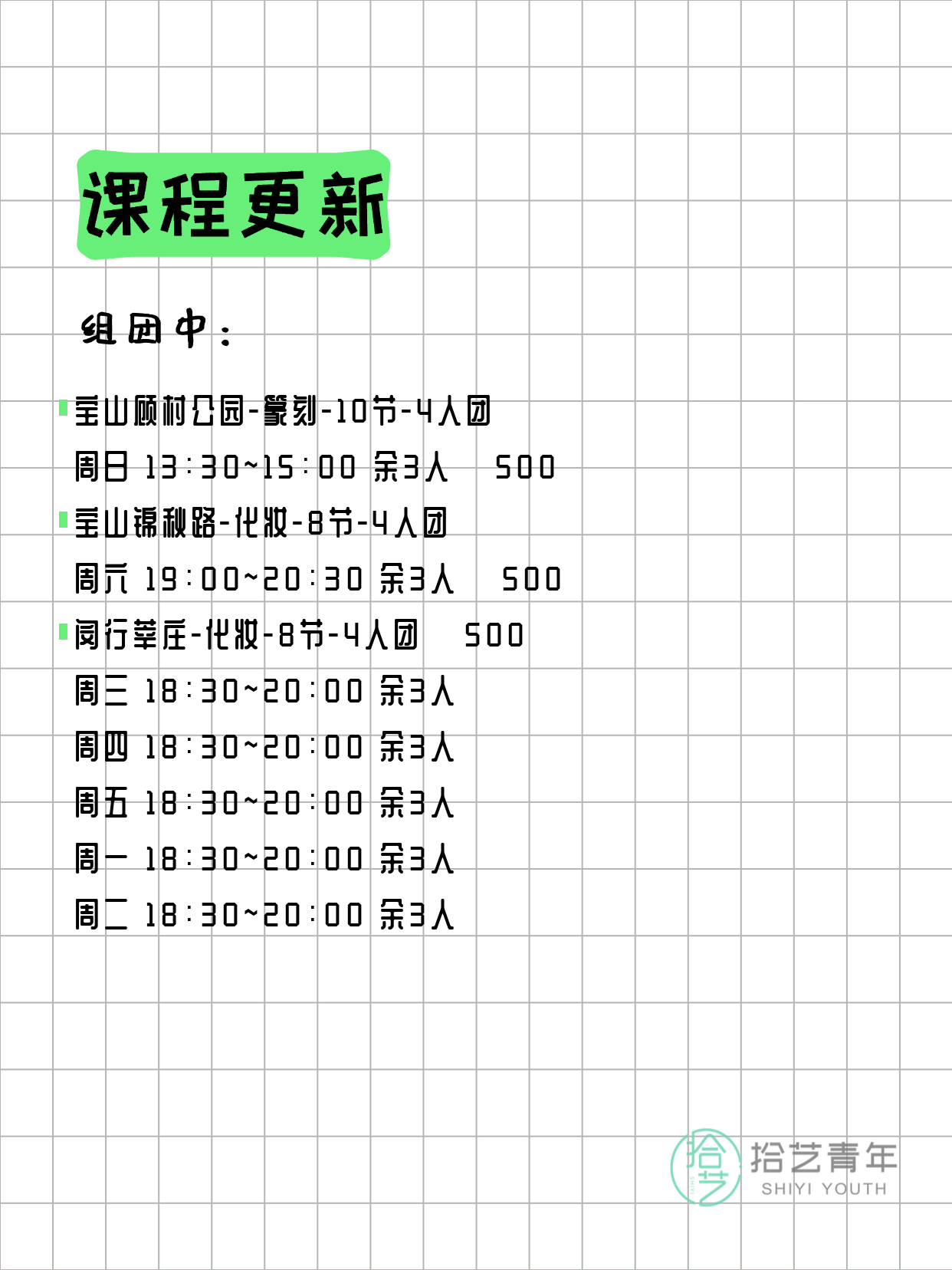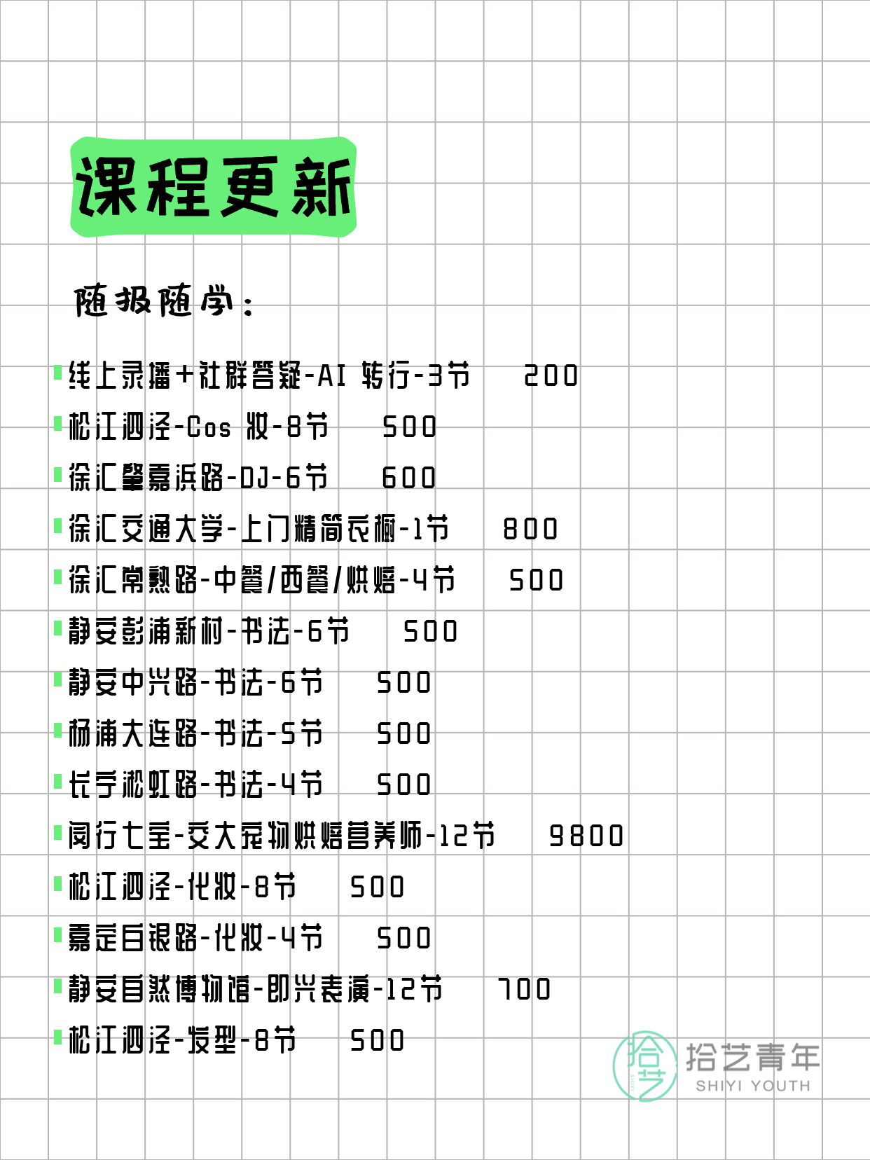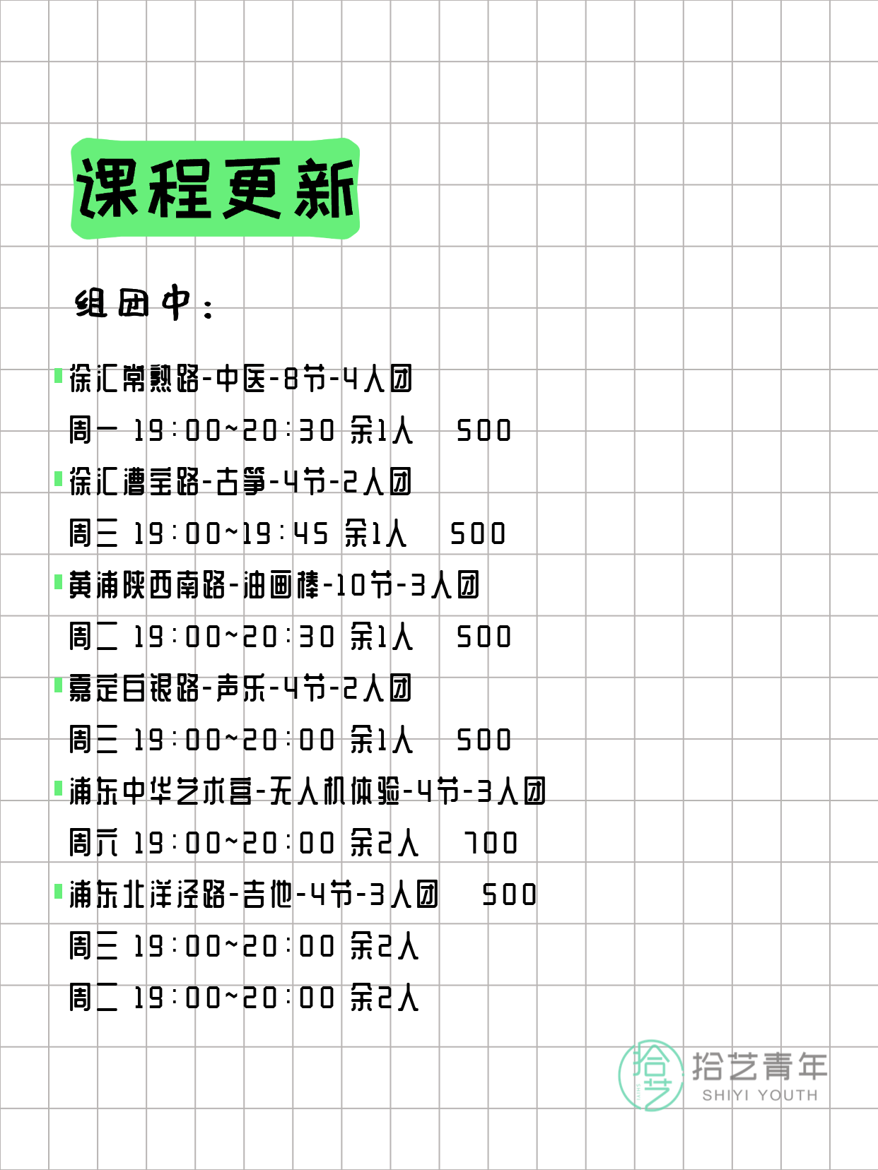 资讯>综合>正文3月26日上海夜校课程合集拾艺青年2026-03-261 / 17📊 本期课程概况• 总课程数:366门• 组团中课程:76门• 覆盖区域:15个区详见图片,欢迎报名咨询。💡 提示:以上课程信息来自拾艺青年小程序,课程可能随报名动态变化,具体以小程序实时信息为准。👉 微信小程序链接:#小程序://拾艺青年/WmfwH22mnQUxZwb