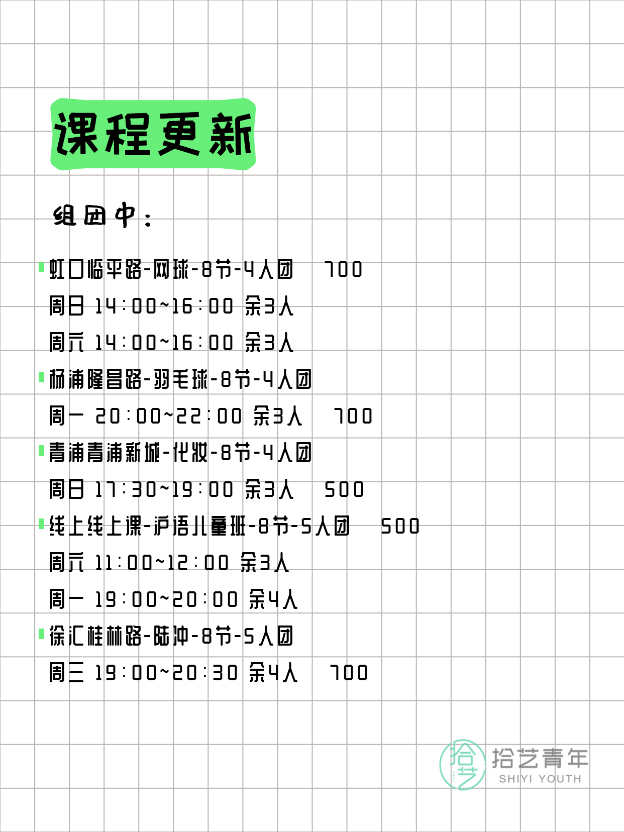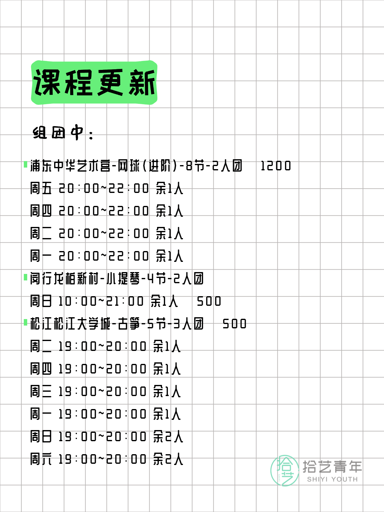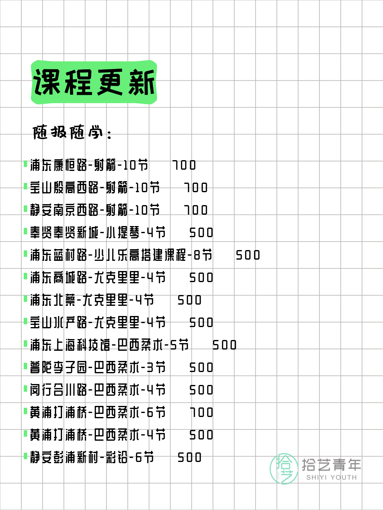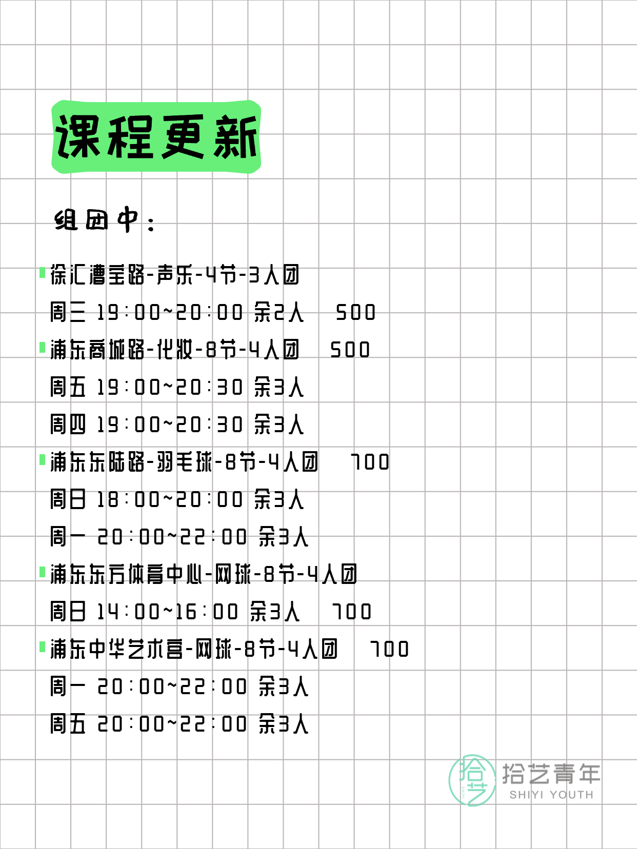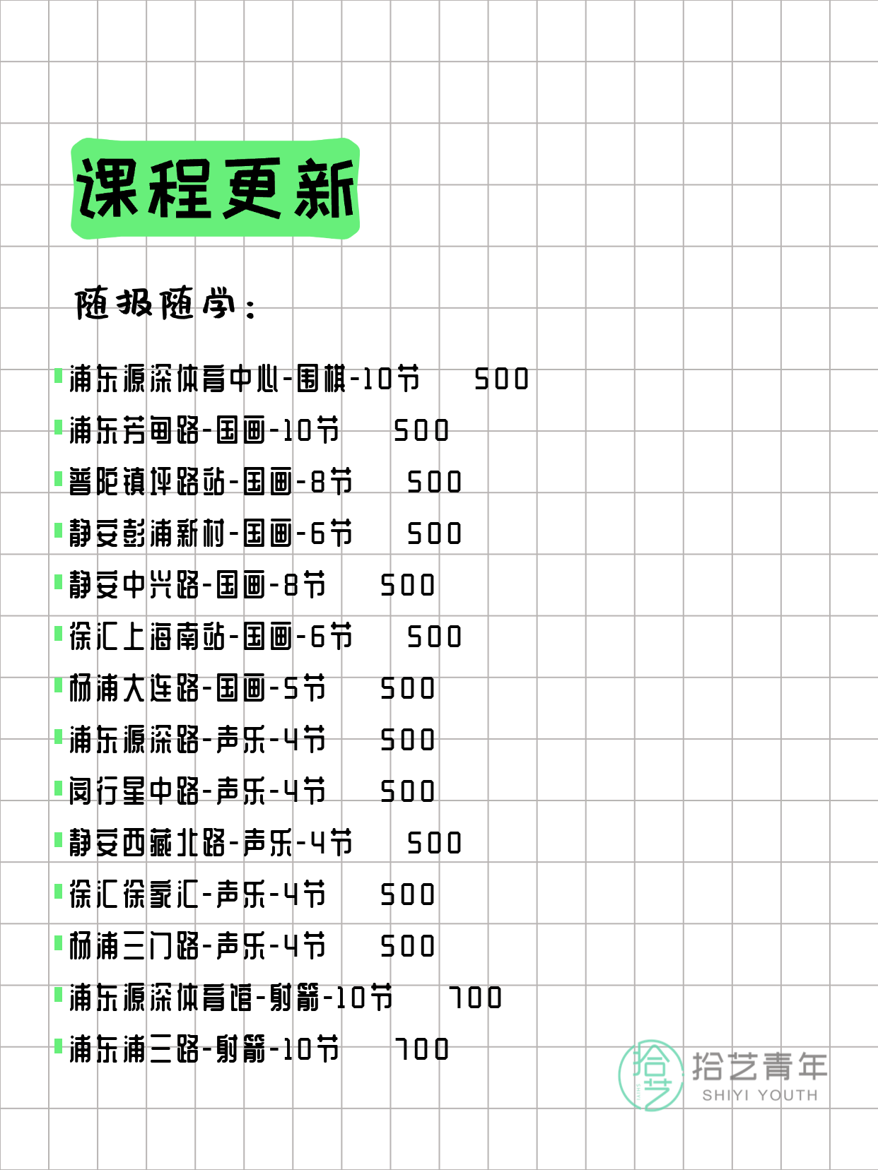 资讯>综合>正文3月26日上海夜校课程合集拾艺青年2026-03-261 / 17📊 本期课程概况• 总课程数:366门• 组团中课程:76门• 覆盖区域:15个区详见图片,欢迎报名咨询。💡 提示:以上课程信息来自拾艺青年小程序,课程可能随报名动态变化,具体以小程序实时信息为准。👉 微信小程序链接:#小程序://拾艺青年/WmfwH22mnQUxZwb
