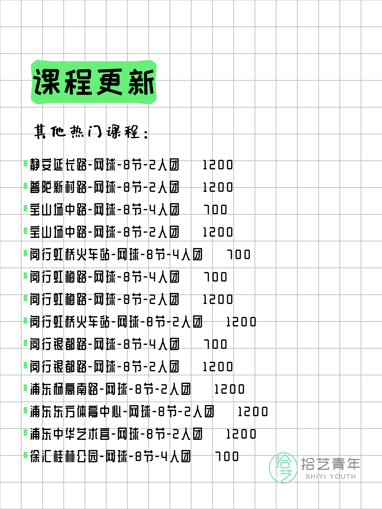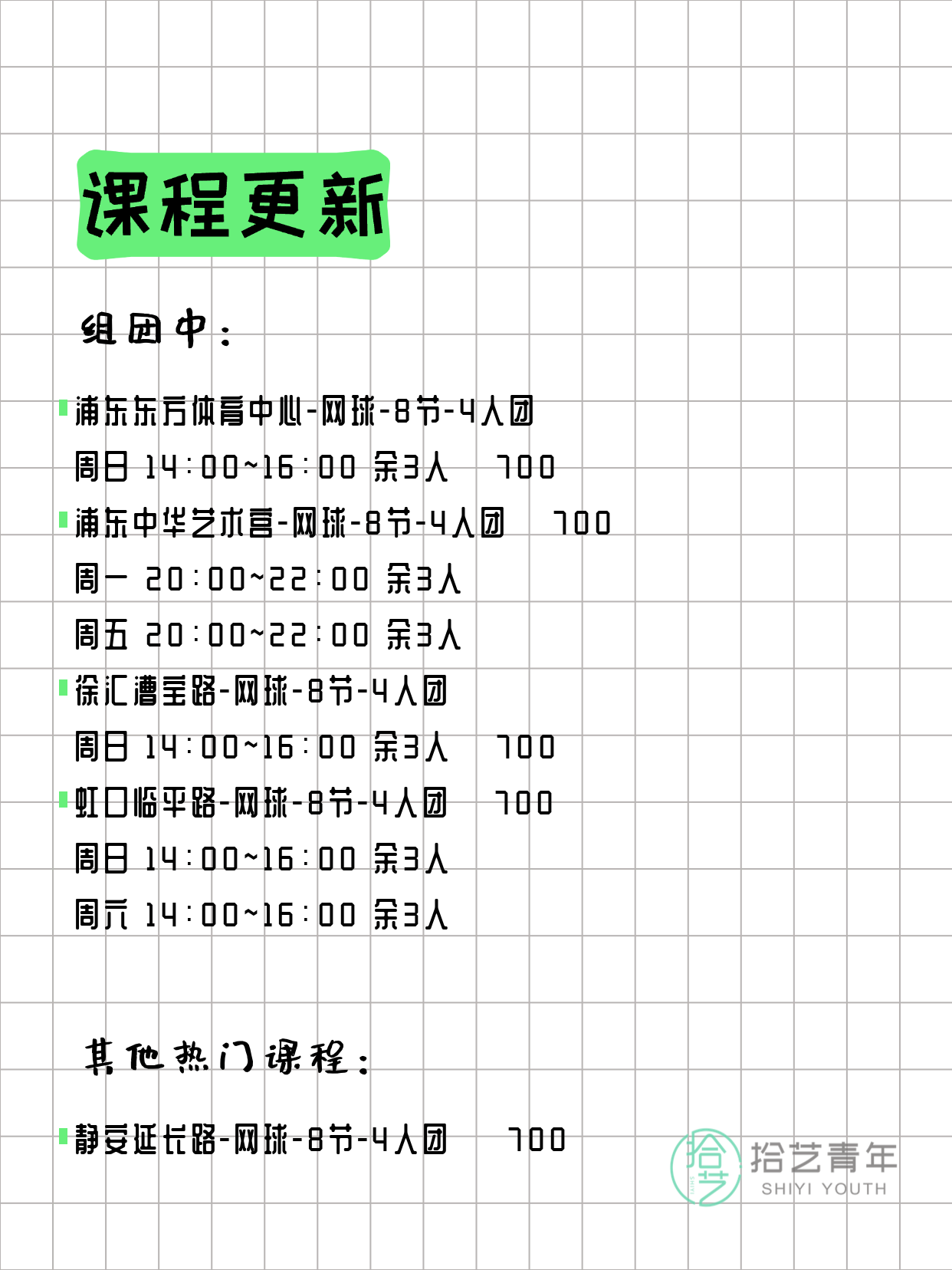 🔥 网球-浦东中华艺术宫-8节-4人团 💰700