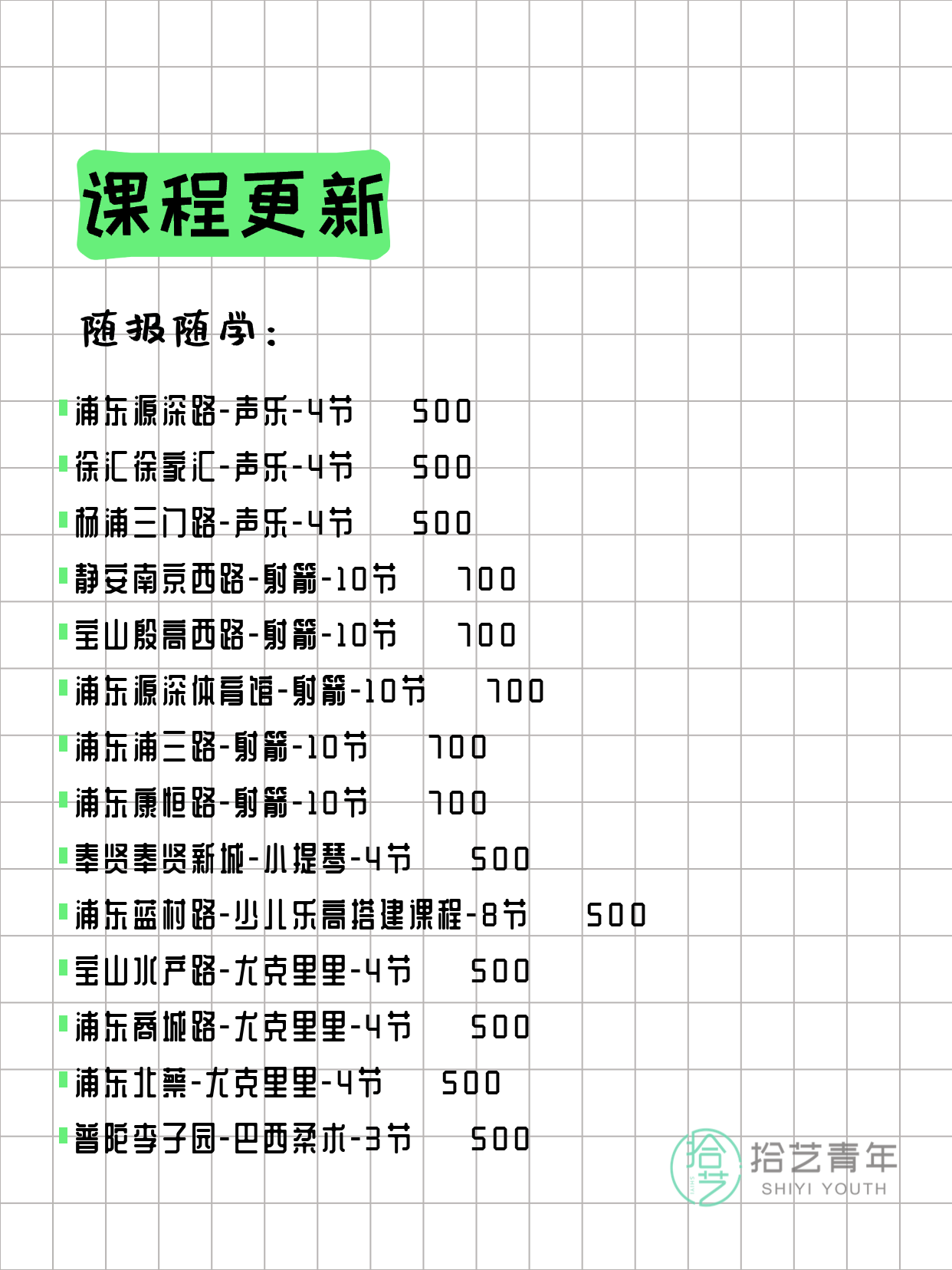 资讯>综合>正文3月27日上海夜校课程合集拾艺青年2026-03-271 / 17📊 本期课程概况• 总课程数:365门• 组团中课程:70门• 覆盖区域:15个区详见图片,欢迎报名咨询。💡 提示:以上课程信息来自拾艺青年小程序,课程可能随报名动态变化,具体以小程序实时信息为准。👉 微信小程序链接:#小程序://拾艺青年/WmfwH22mnQUxZwb