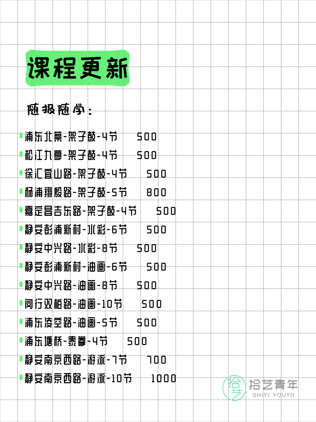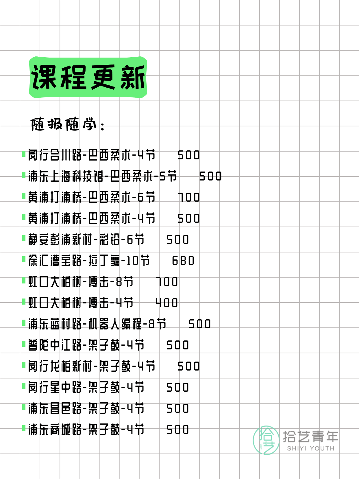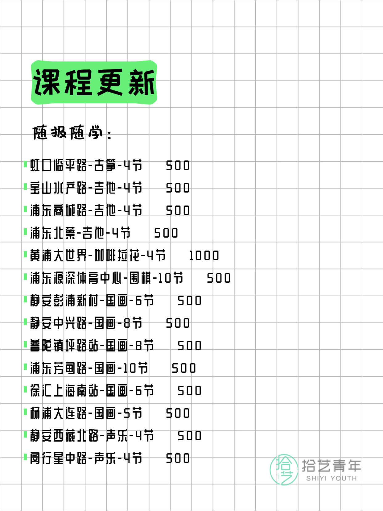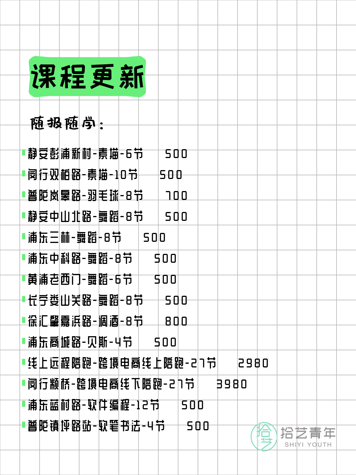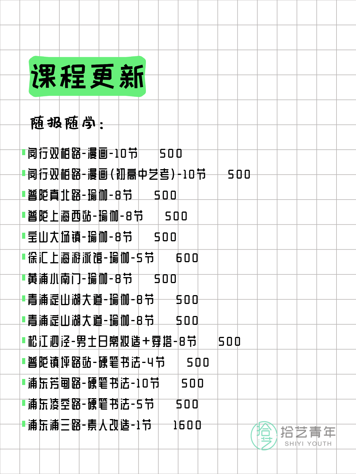 资讯>综合>正文3月28日上海夜校课程合集拾艺青年2026-03-281 / 17📊 本期课程概况• 总课程数:369门• 组团中课程:70门• 覆盖区域:15个区详见图片,欢迎报名咨询。💡 提示:以上课程信息来自拾艺青年小程序,课程可能随报名动态变化,具体以小程序实时信息为准。👉 微信小程序链接:#小程序://拾艺青年/WmfwH22mnQUxZwb
