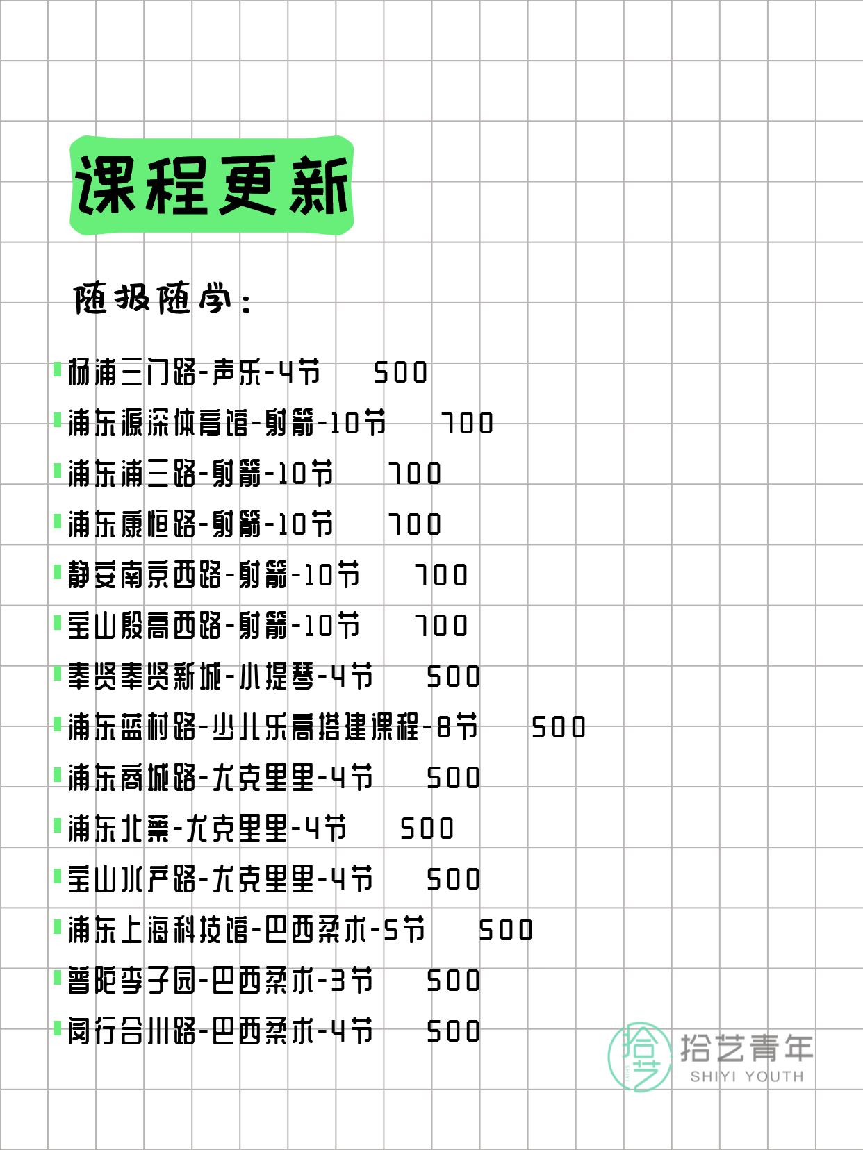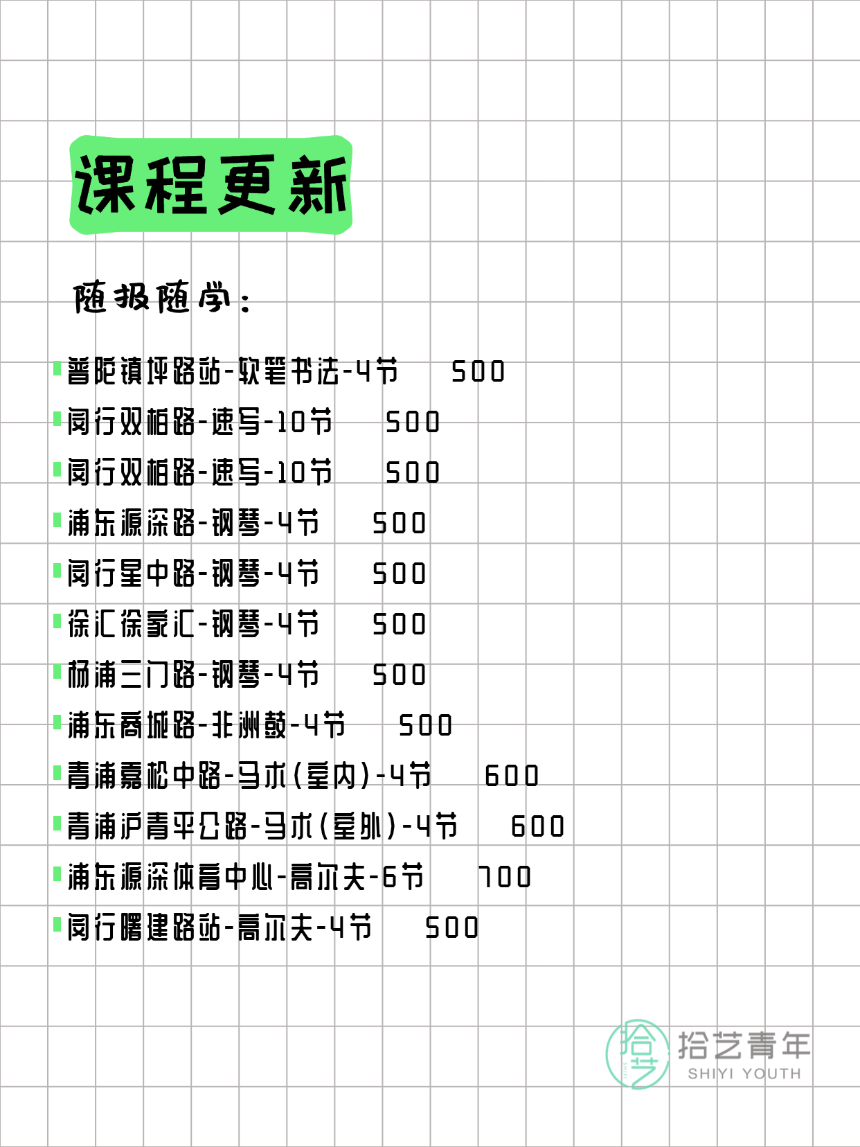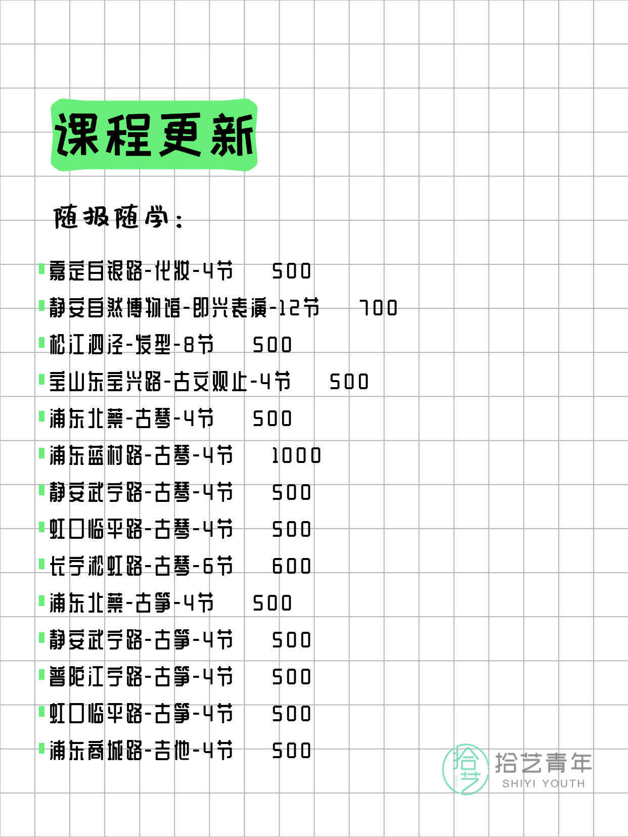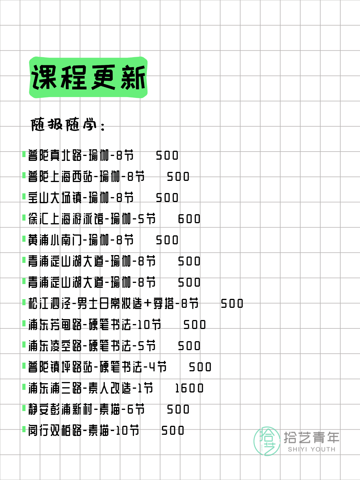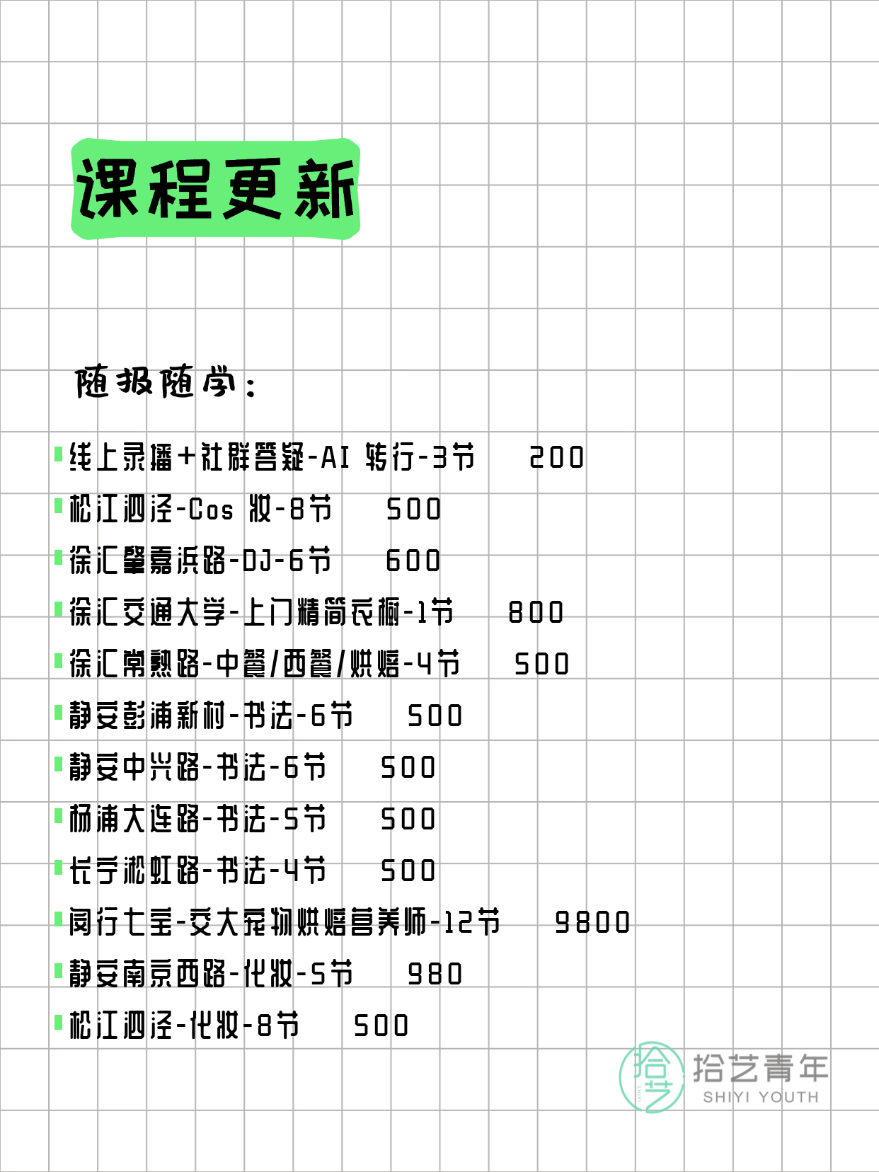 资讯>综合>正文3月31日上海夜校课程合集拾艺青年2026-03-311 / 17📊 本期课程概况• 总课程数:361门• 组团中课程:59门• 覆盖区域:15个区详见图片,欢迎报名咨询。💡 提示:以上课程信息来自拾艺青年小程序,课程可能随报名动态变化,具体以小程序实时信息为准。👉 微信小程序链接:#小程序://拾艺青年/WmfwH22mnQUxZwb