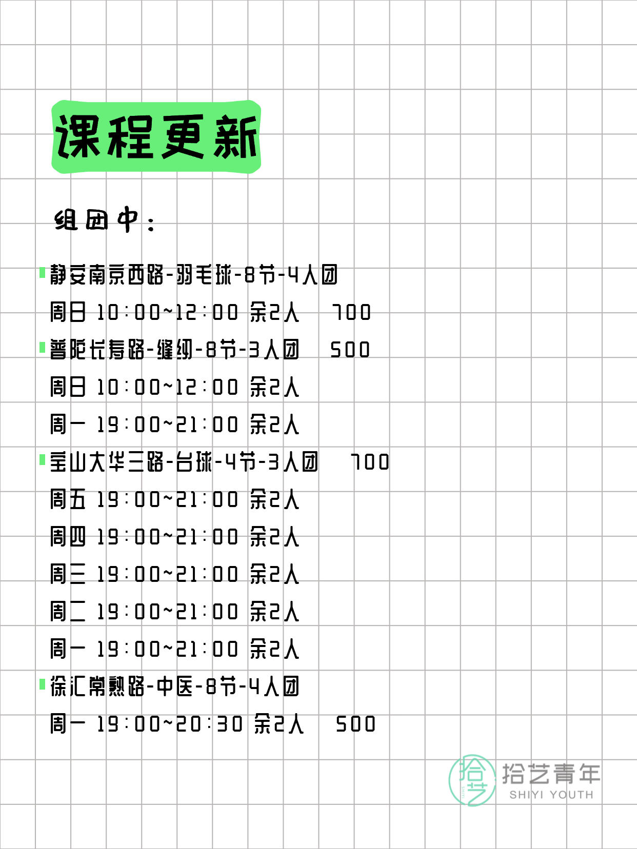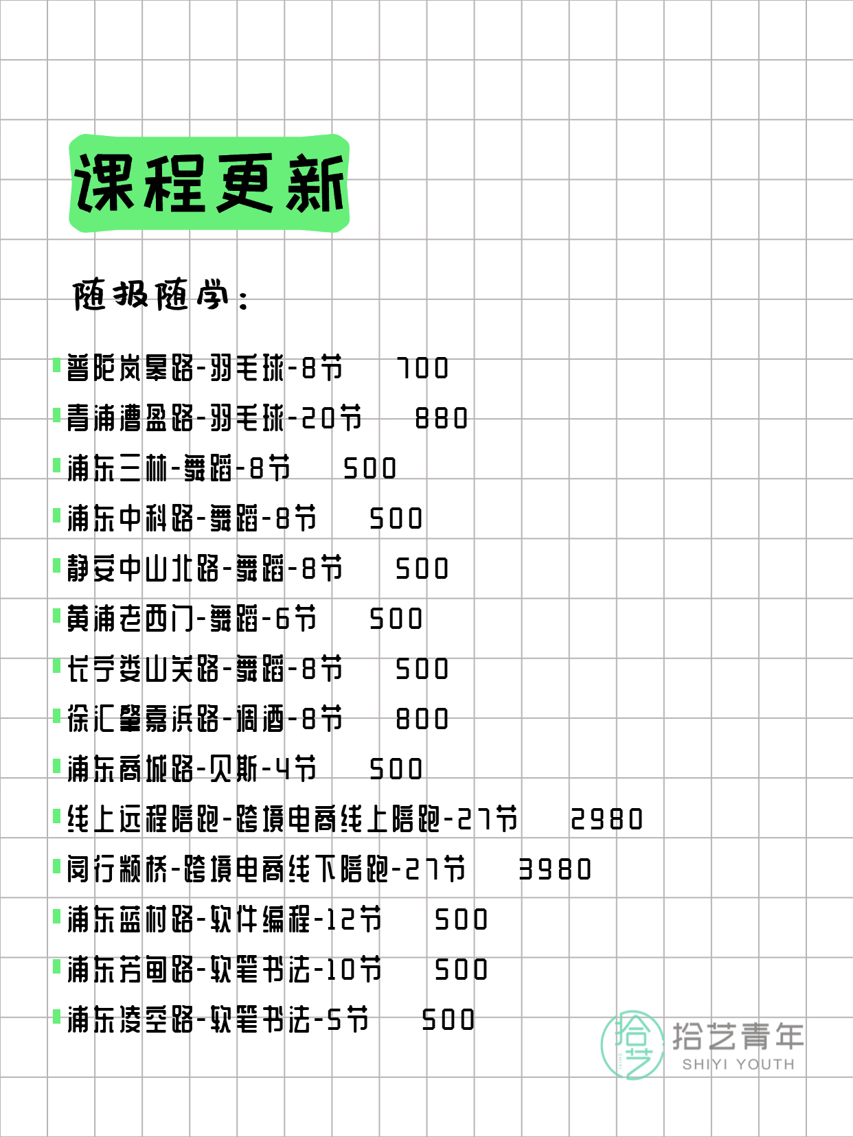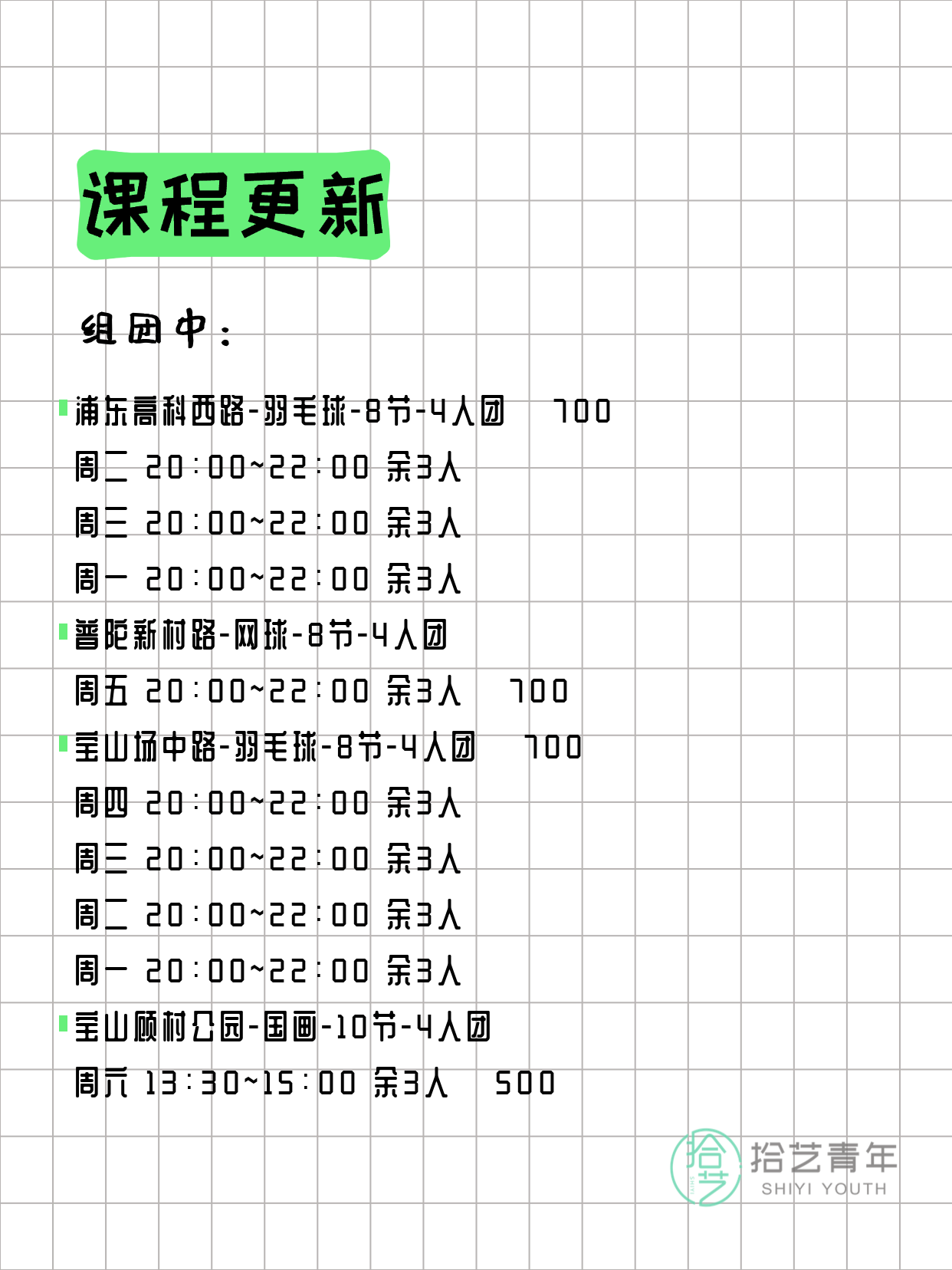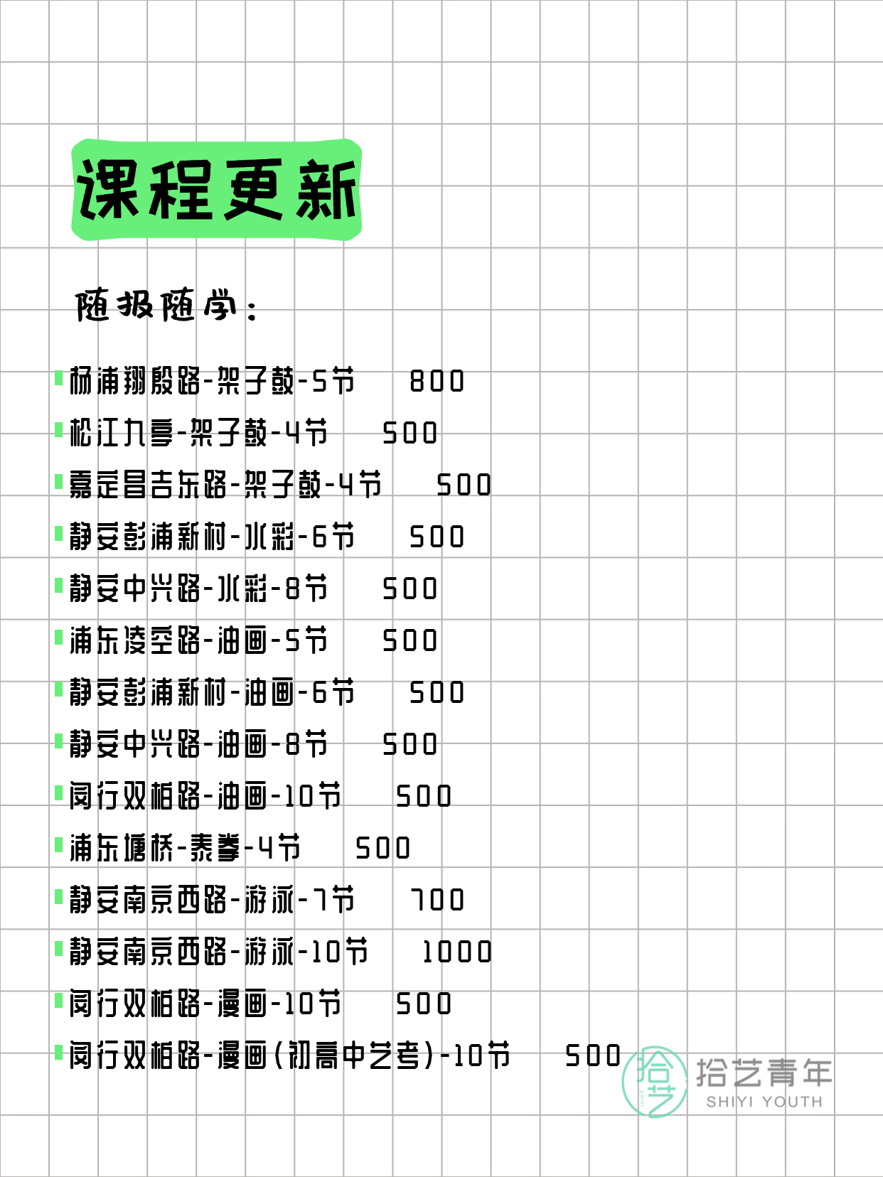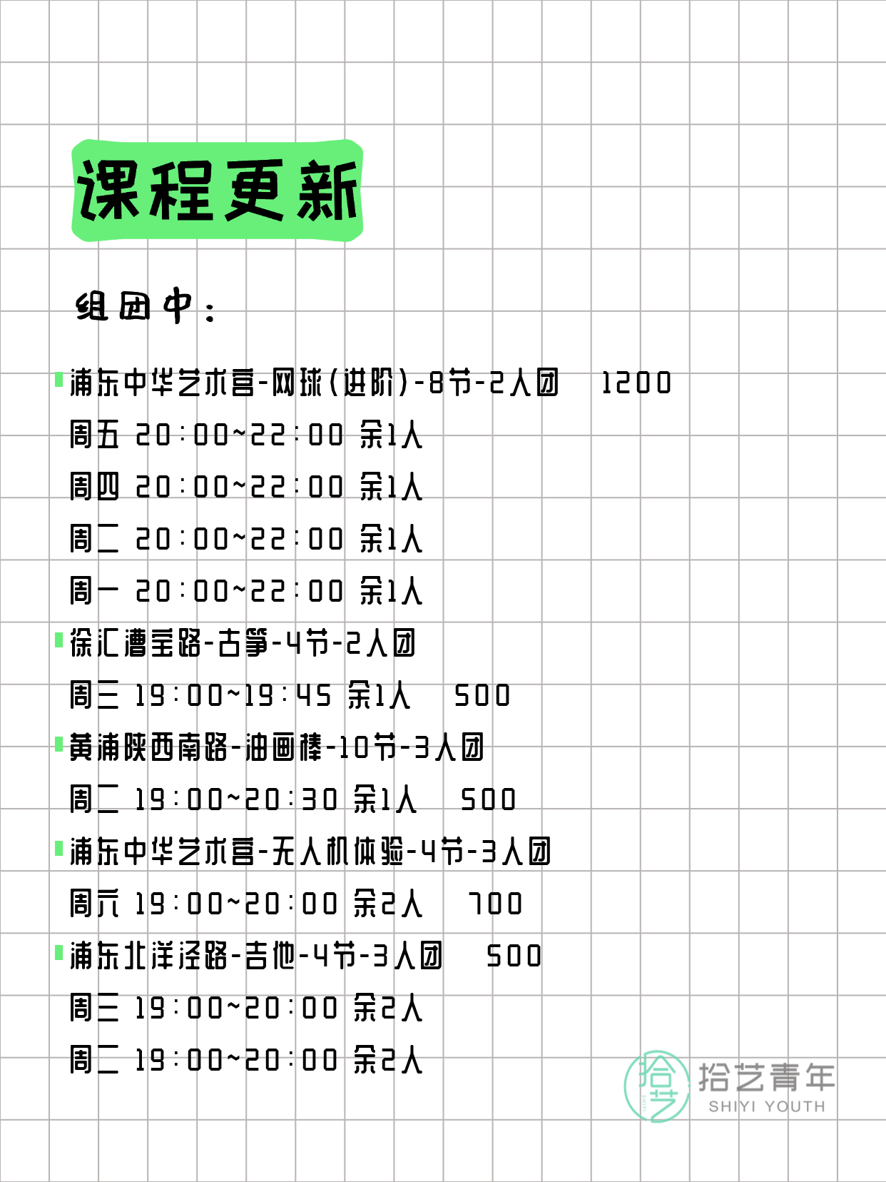 资讯>综合>正文3月31日上海夜校课程合集拾艺青年2026-03-311 / 17📊 本期课程概况• 总课程数:361门• 组团中课程:59门• 覆盖区域:15个区详见图片,欢迎报名咨询。💡 提示:以上课程信息来自拾艺青年小程序,课程可能随报名动态变化,具体以小程序实时信息为准。👉 微信小程序链接:#小程序://拾艺青年/WmfwH22mnQUxZwb
