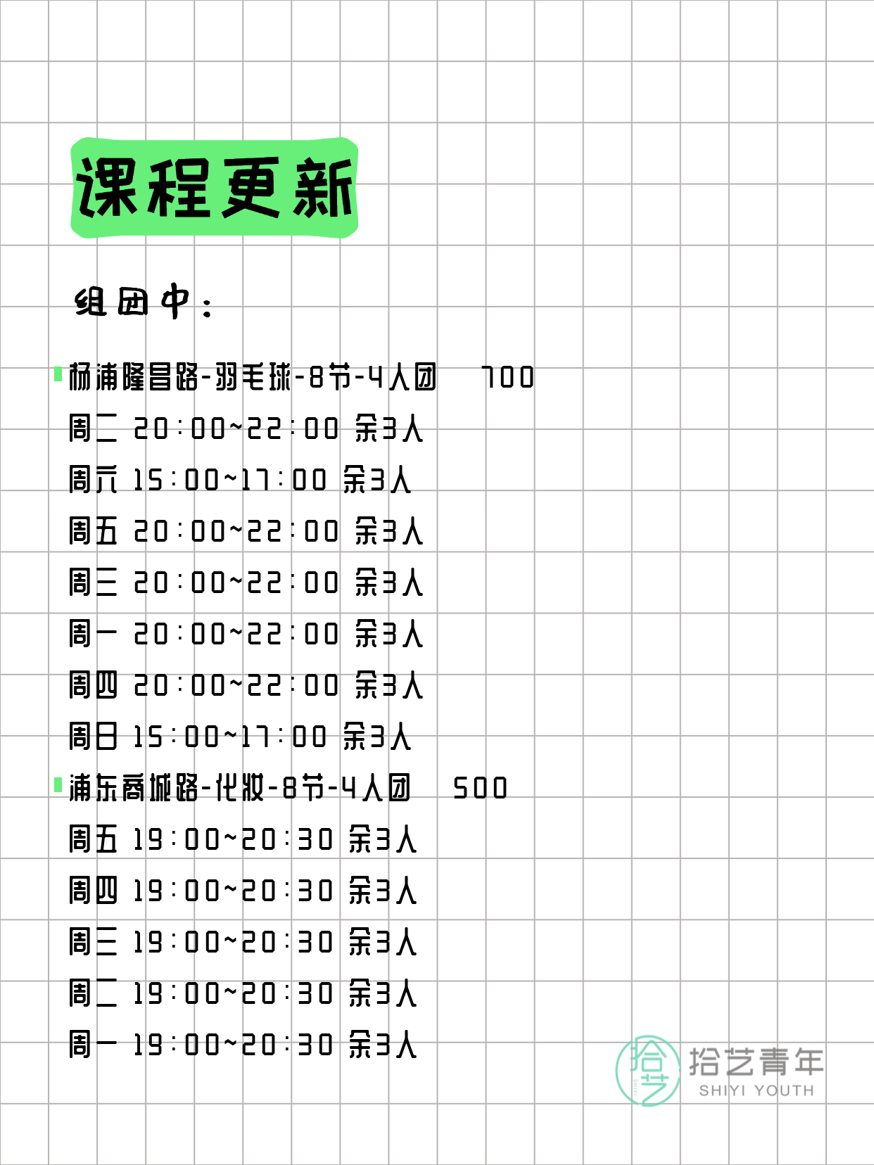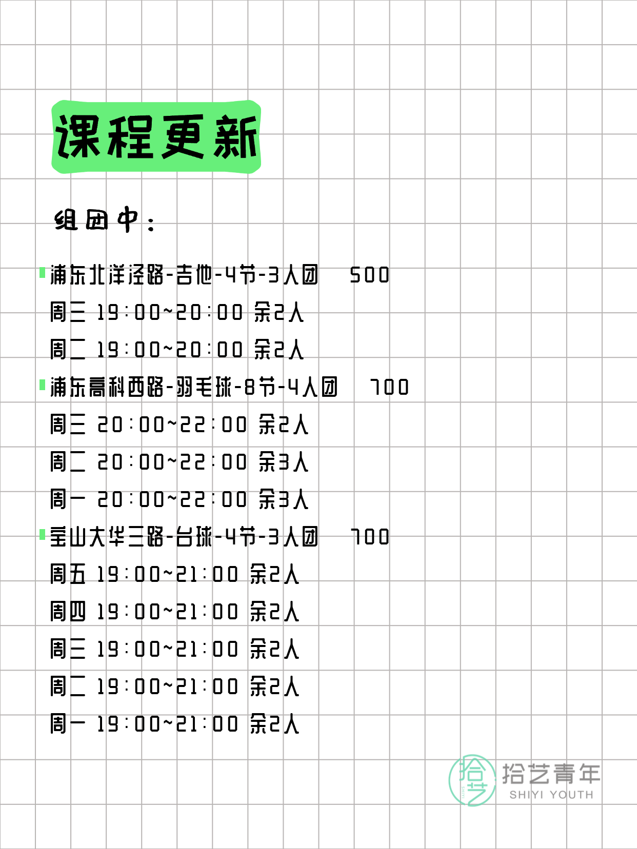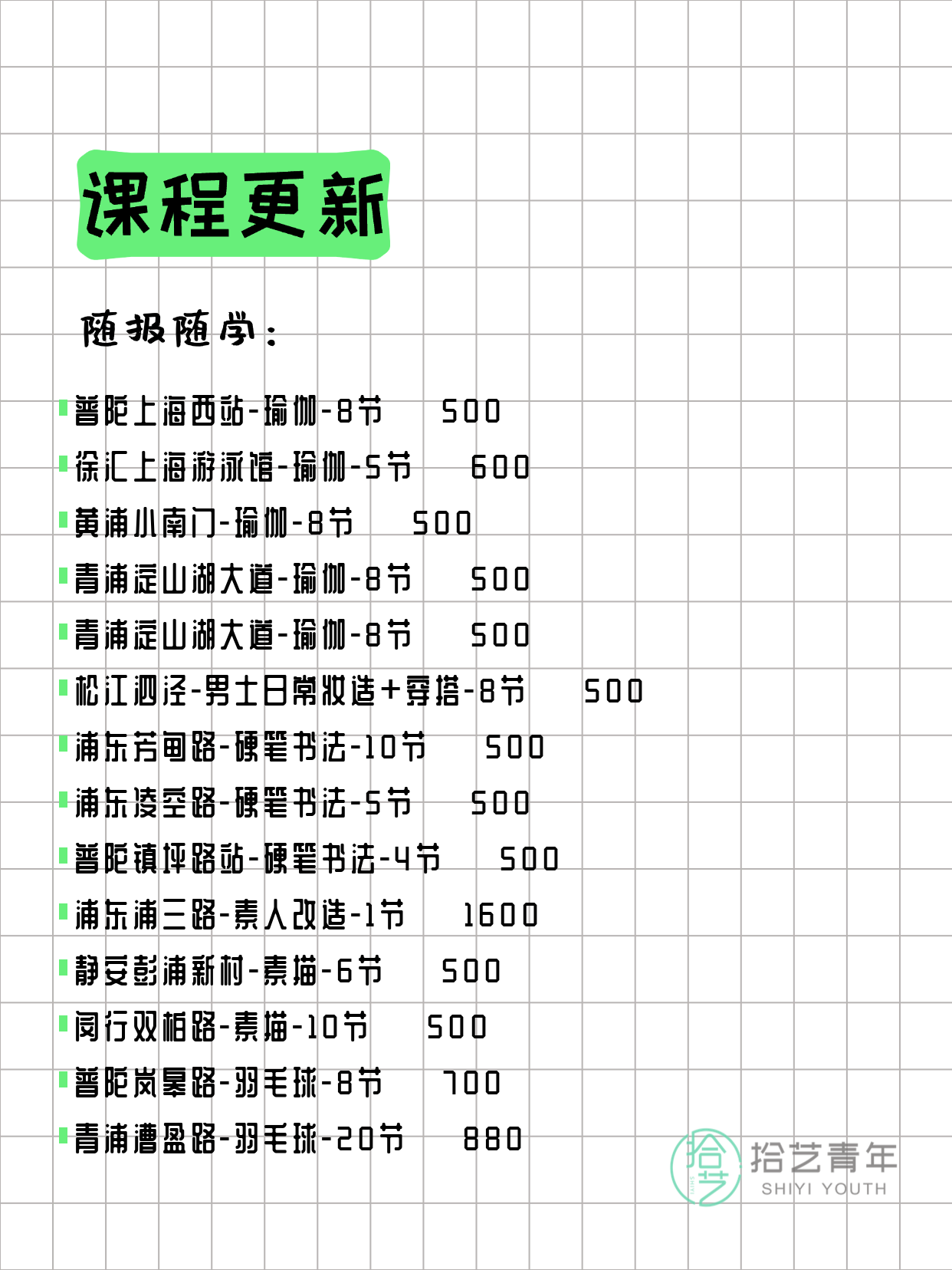 资讯>综合>正文4月1日上海夜校课程合集拾艺青年2026-04-011 / 17📊 本期课程概况• 总课程数:372门• 组团中课程:71门• 覆盖区域:15个区详见图片,欢迎报名咨询。💡 提示:以上课程信息来自拾艺青年小程序,课程可能随报名动态变化,具体以小程序实时信息为准。👉 微信小程序链接:#小程序://拾艺青年/WmfwH22mnQUxZwb