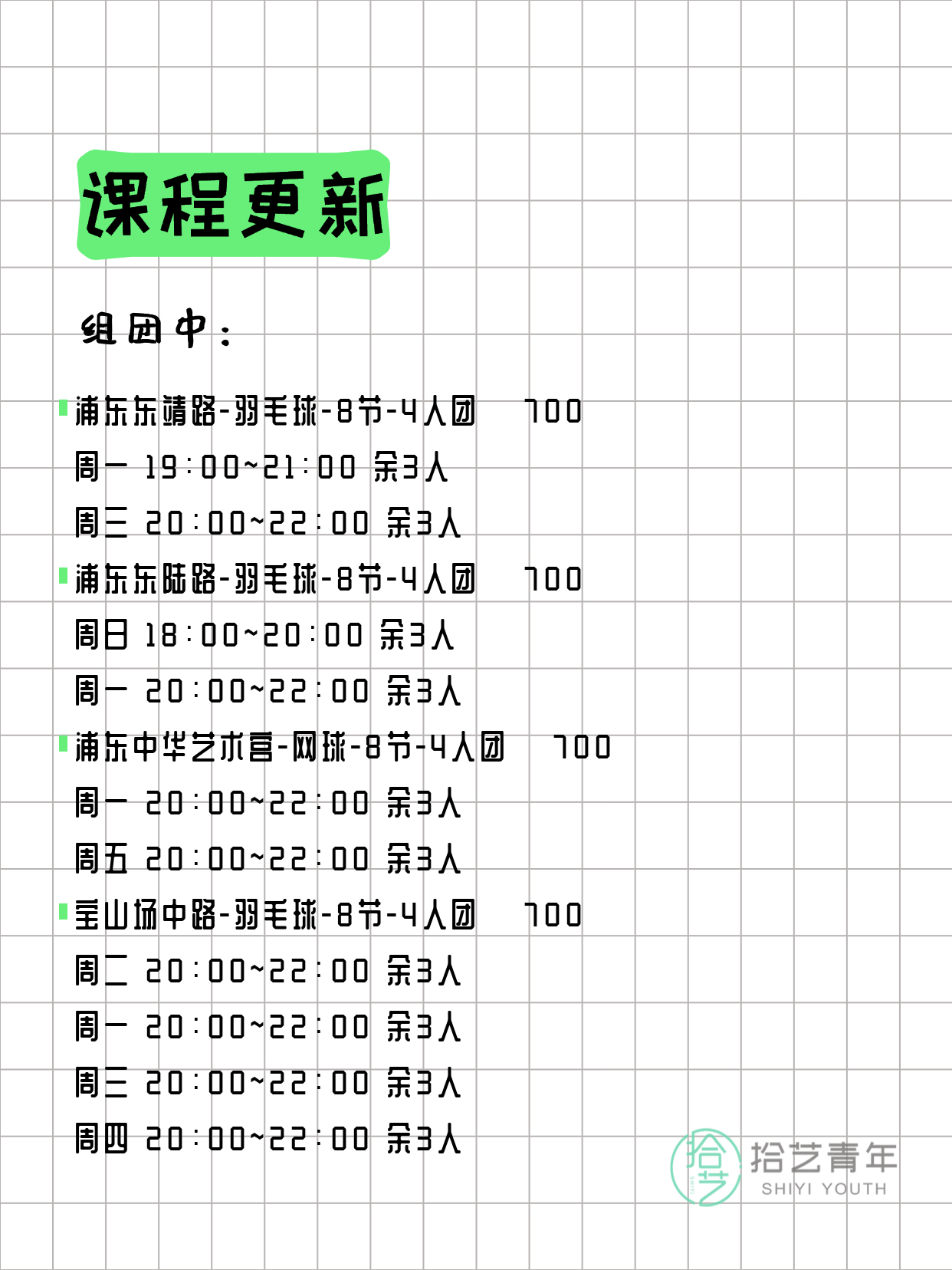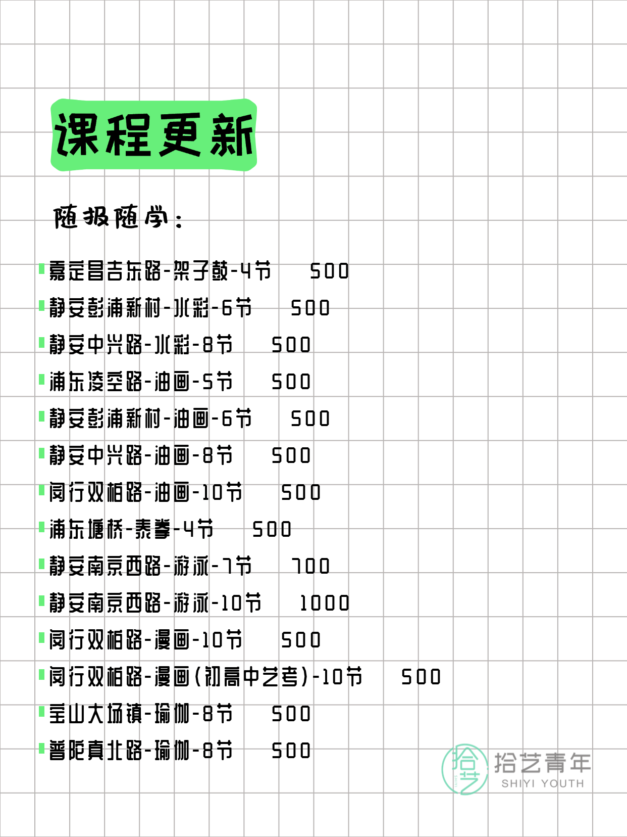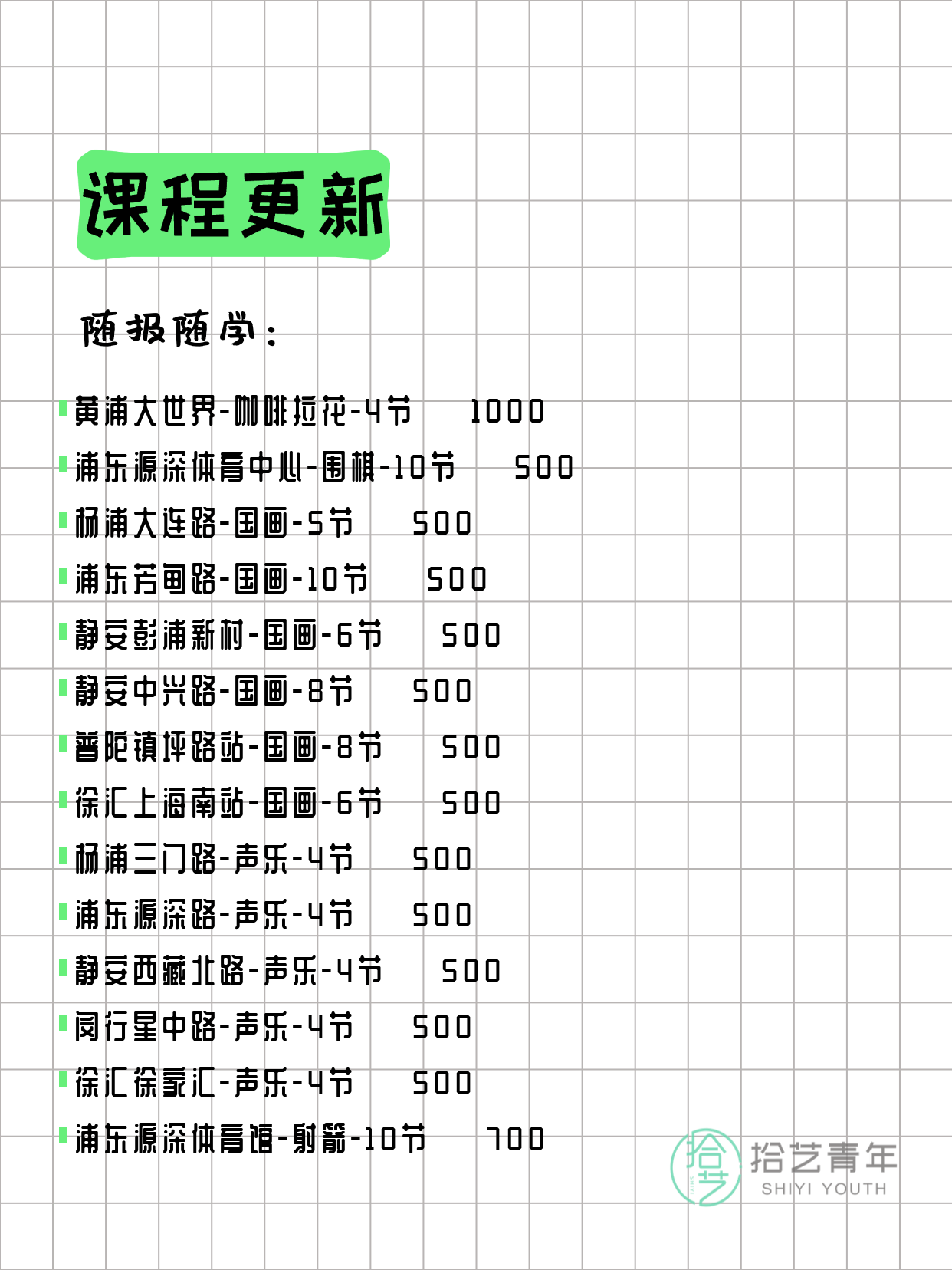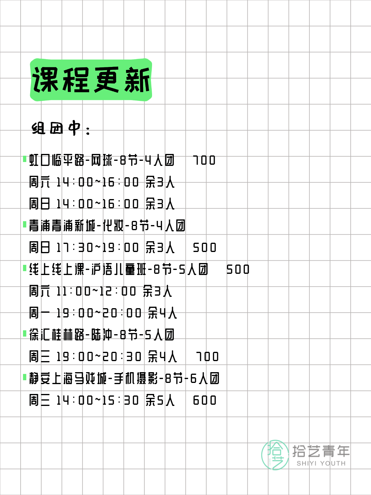 资讯>综合>正文4月1日上海夜校课程合集拾艺青年2026-04-011 / 17📊 本期课程概况• 总课程数:372门• 组团中课程:71门• 覆盖区域:15个区详见图片,欢迎报名咨询。💡 提示:以上课程信息来自拾艺青年小程序,课程可能随报名动态变化,具体以小程序实时信息为准。👉 微信小程序链接:#小程序://拾艺青年/WmfwH22mnQUxZwb