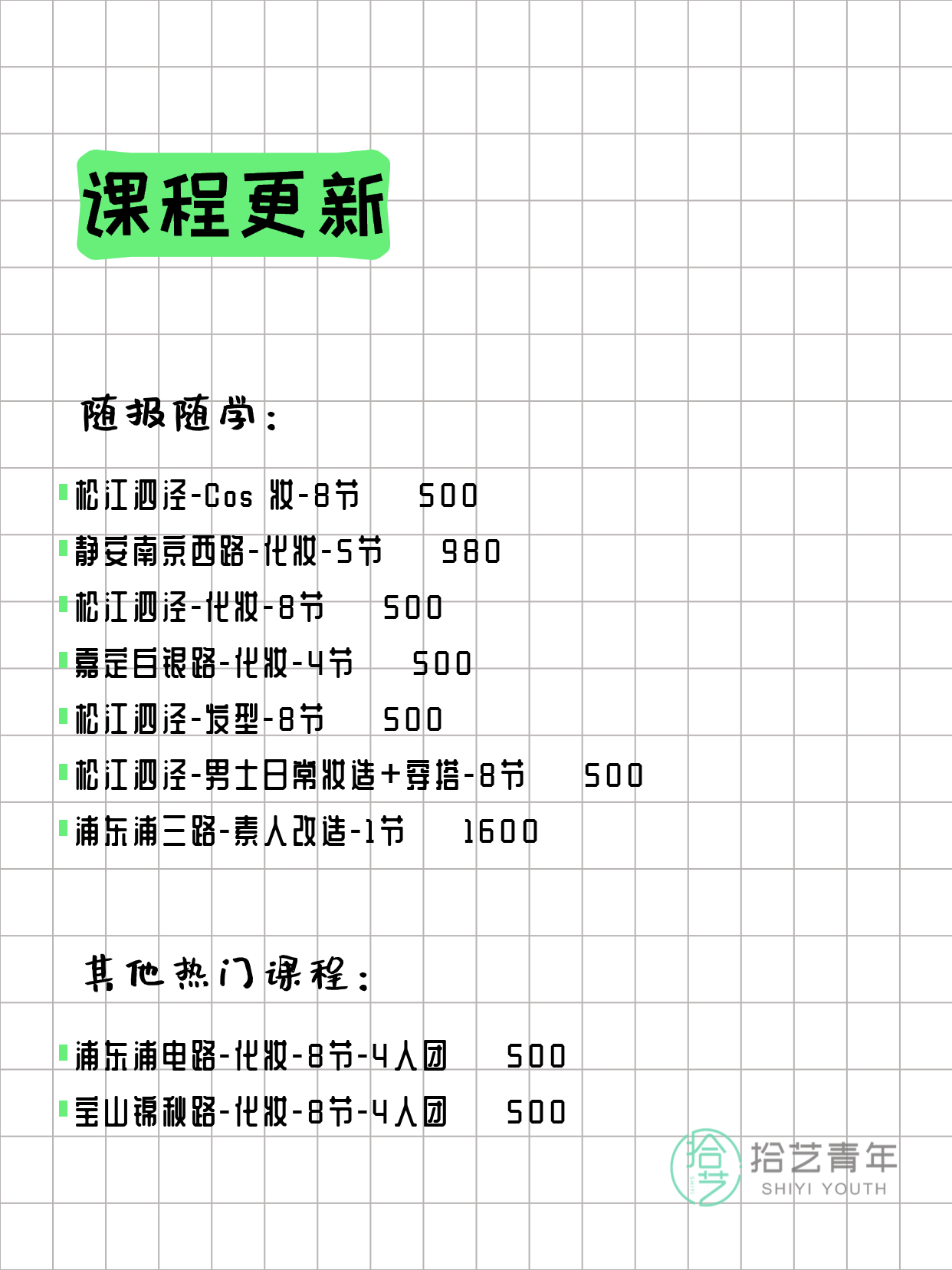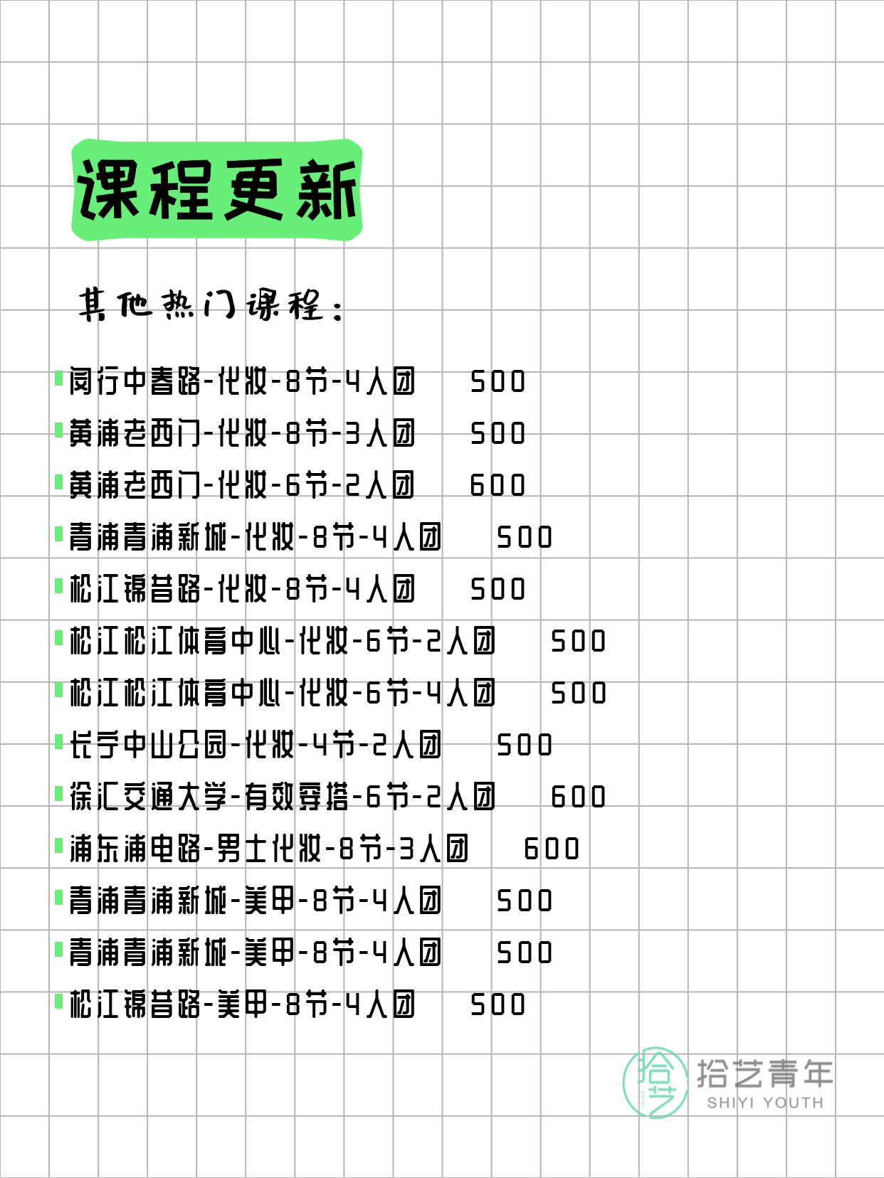 💡 提示:以上课程信息来自拾艺青年小程序,课程可能随报名动态变化,具体以小程序实时信息为准。