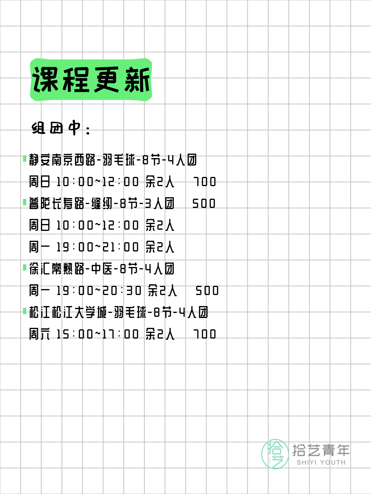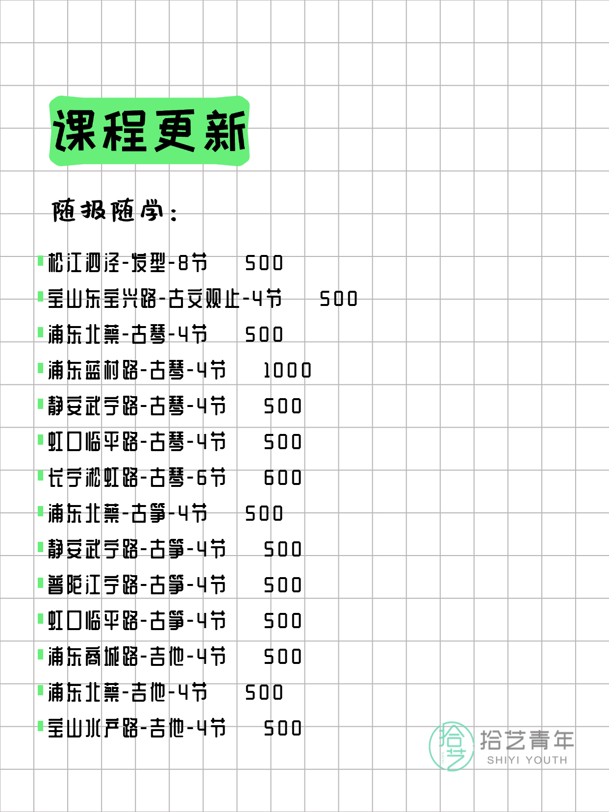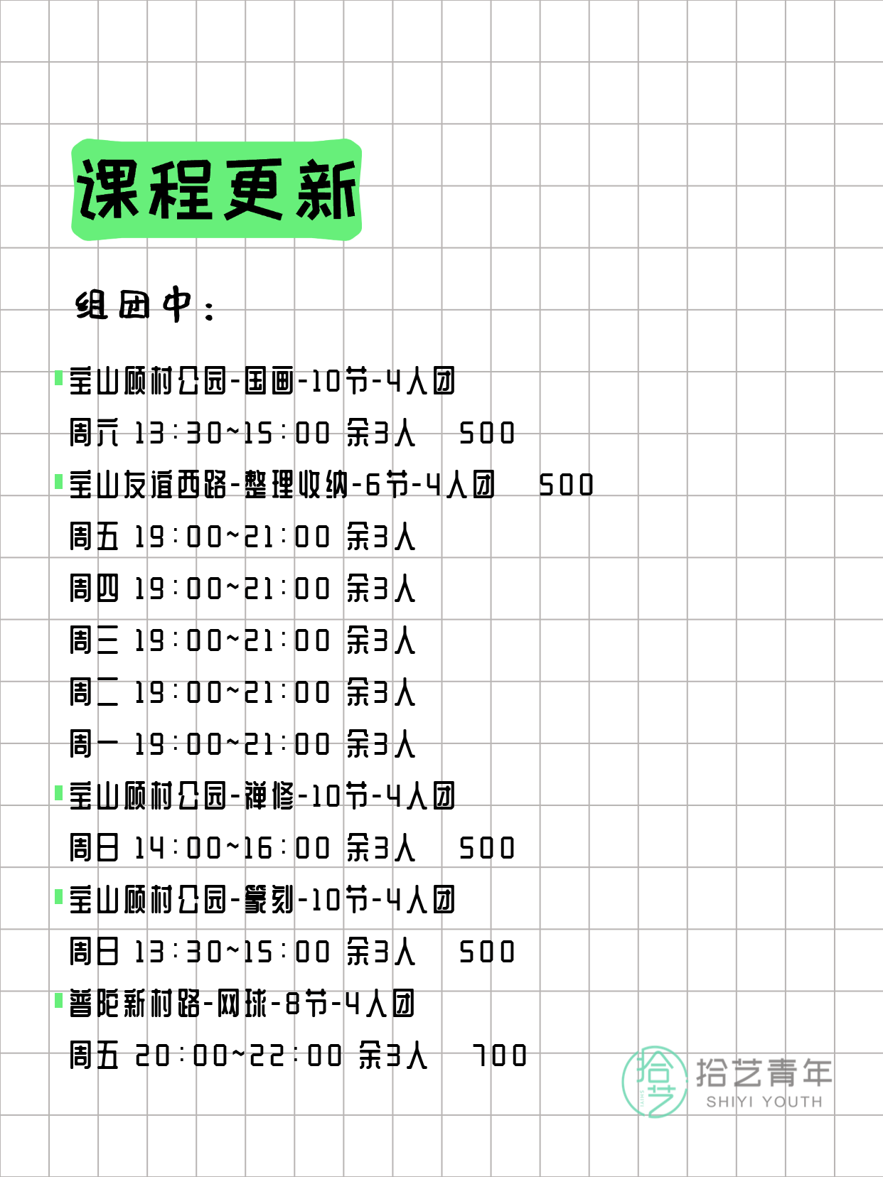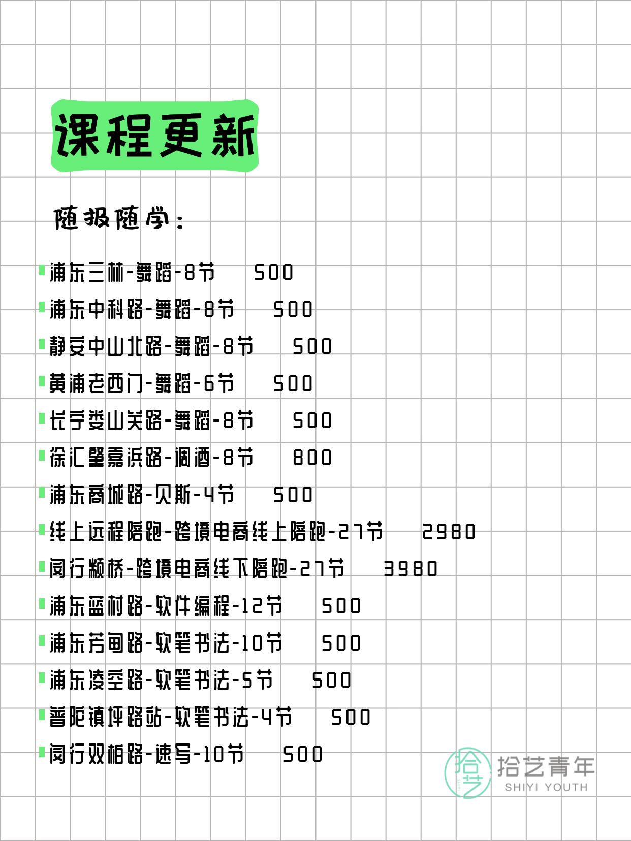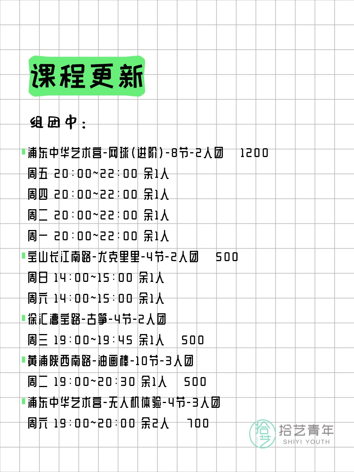 资讯>综合>正文4月1日上海夜校课程合集拾艺青年2026-04-011 / 17📊 本期课程概况• 总课程数:372门• 组团中课程:71门• 覆盖区域:15个区详见图片,欢迎报名咨询。💡 提示:以上课程信息来自拾艺青年小程序,课程可能随报名动态变化,具体以小程序实时信息为准。👉 微信小程序链接:#小程序://拾艺青年/WmfwH22mnQUxZwb