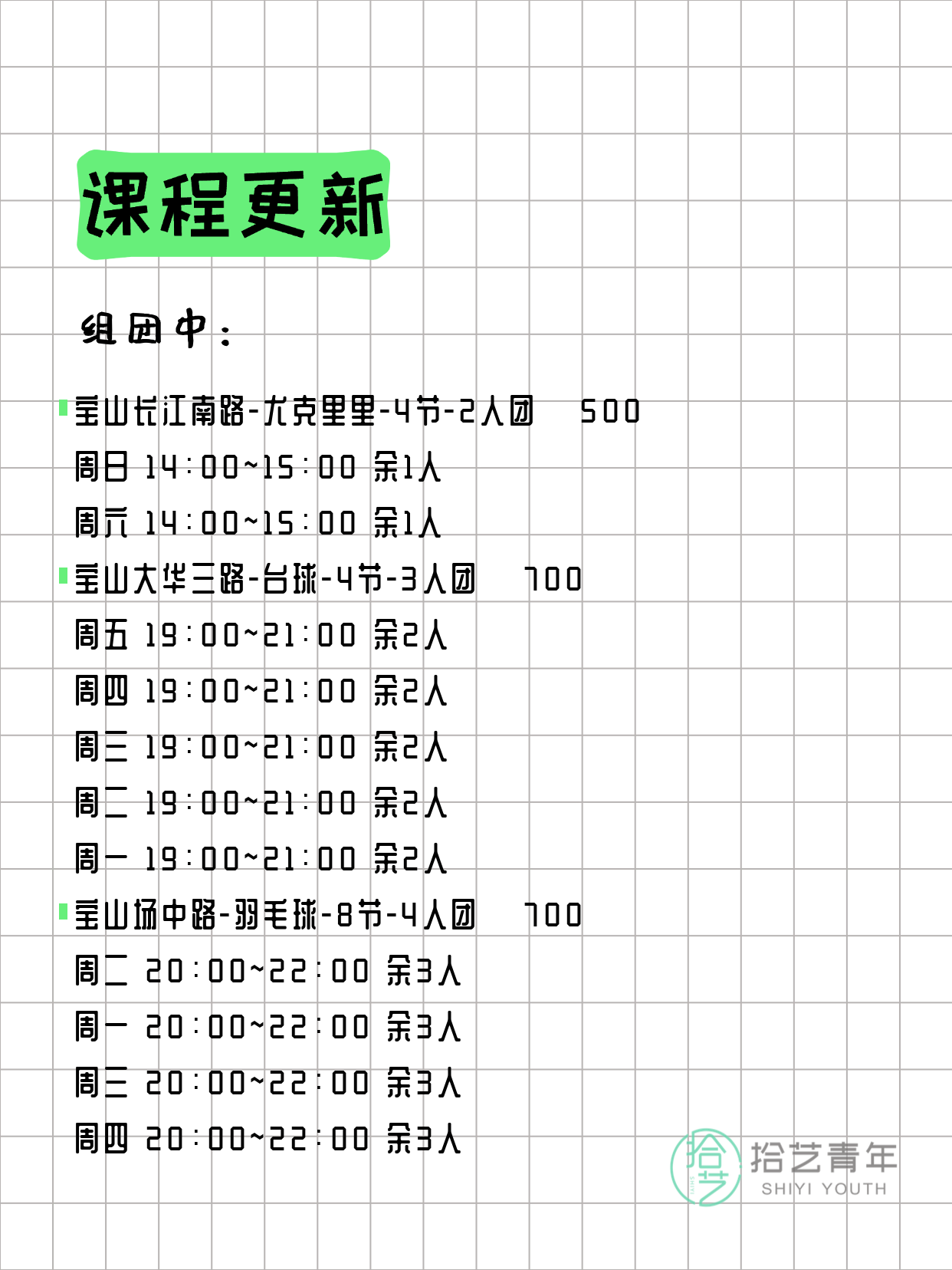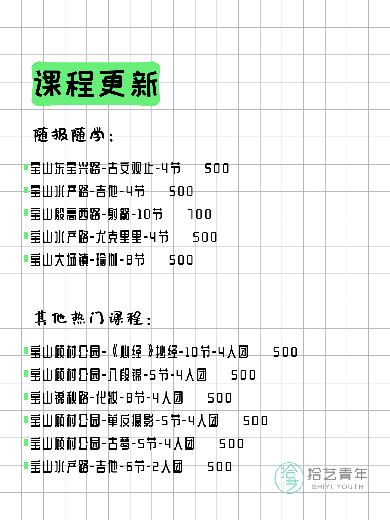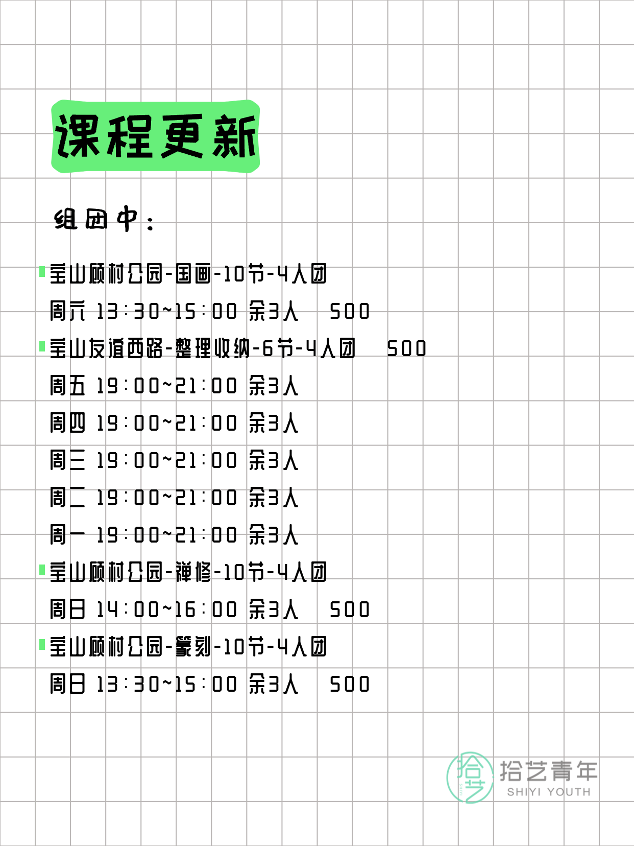 💡 提示:以上课程信息来自拾艺青年小程序,课程可能随报名动态变化,具体以小程序实时信息为准。