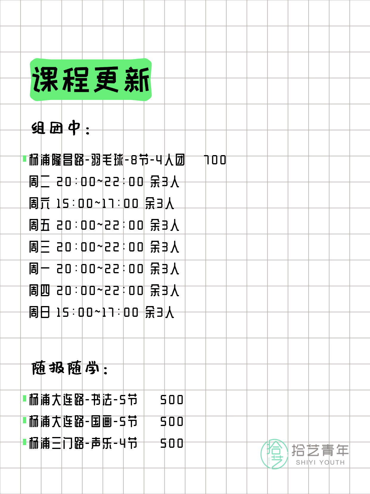⭐ 羽毛球-杨浦江湾体育场-8节-4人团 💰700