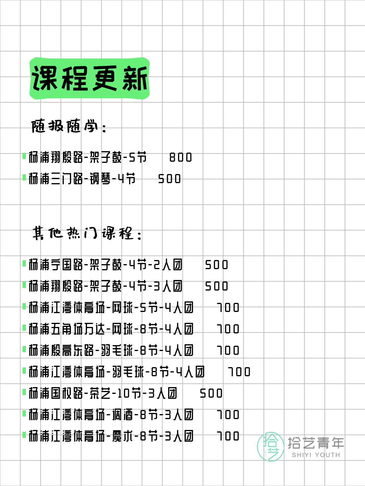 💡 提示:以上课程信息来自拾艺青年小程序,课程可能随报名动态变化,具体以小程序实时信息为准。
