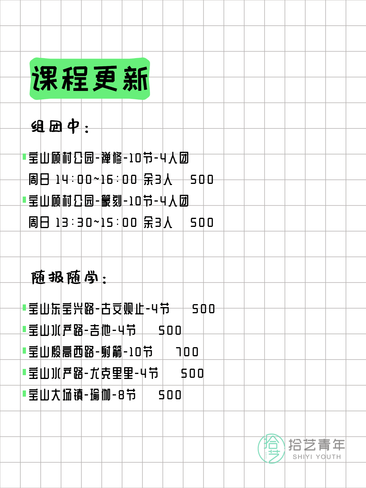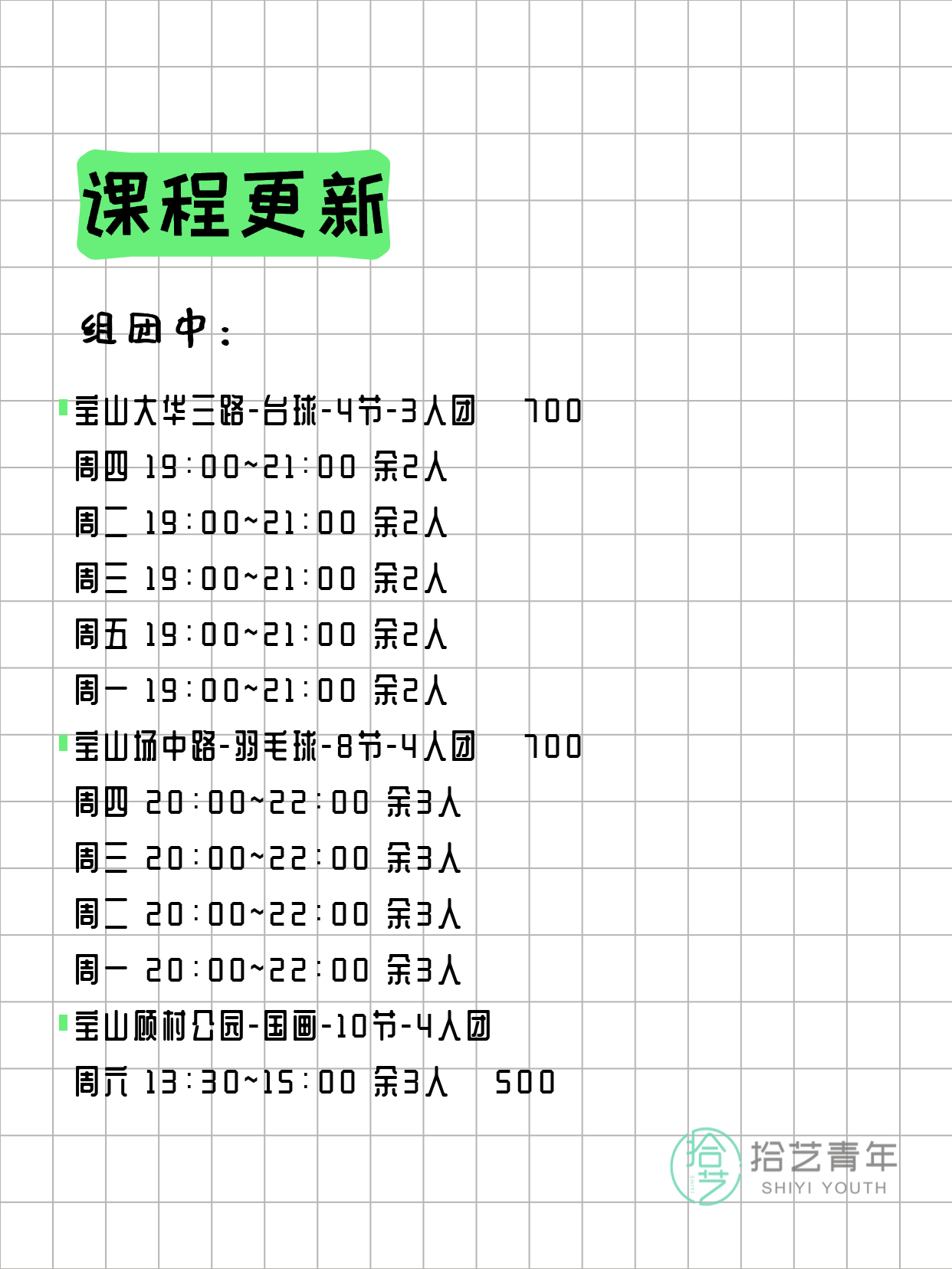 💡 提示:以上课程信息来自拾艺青年小程序,课程可能随报名动态变化,具体以小程序实时信息为准。