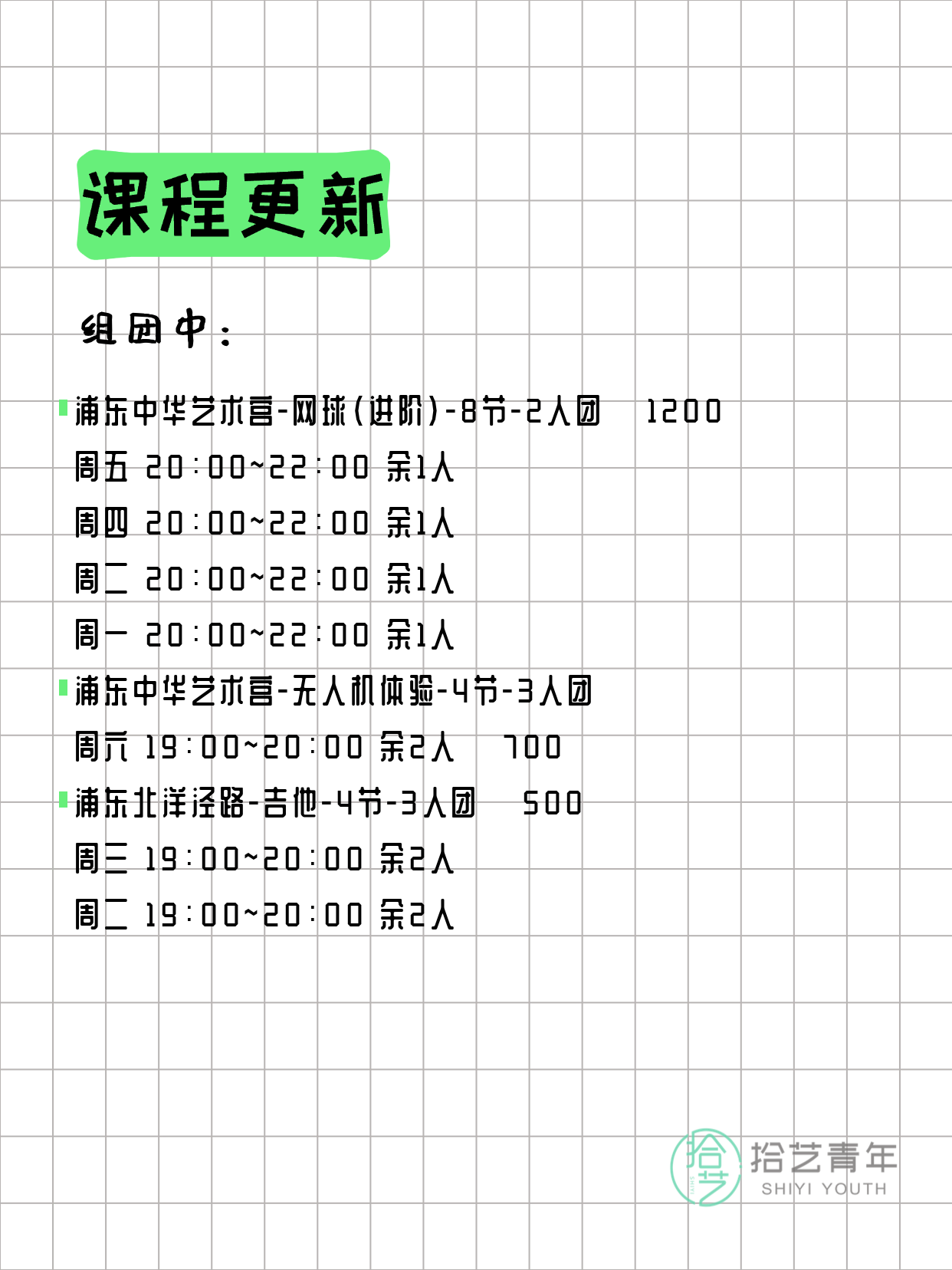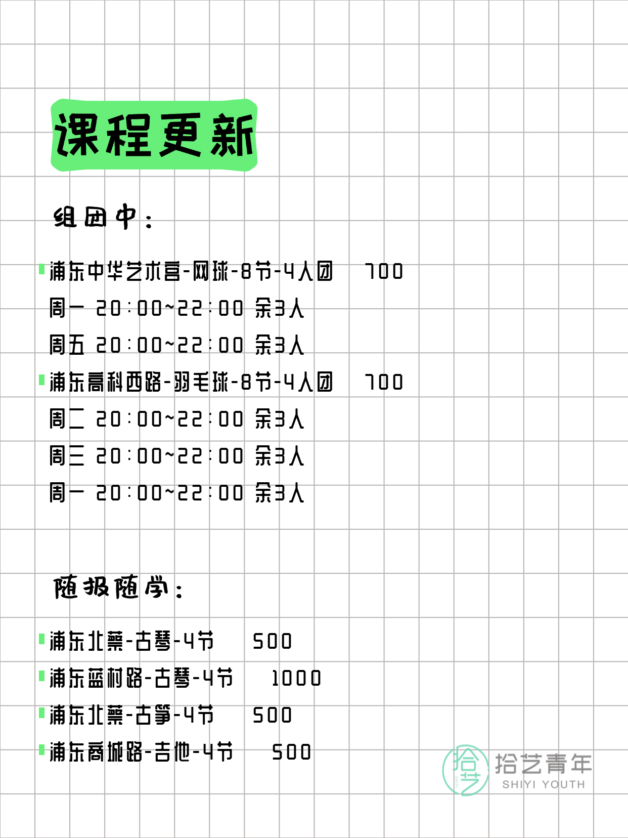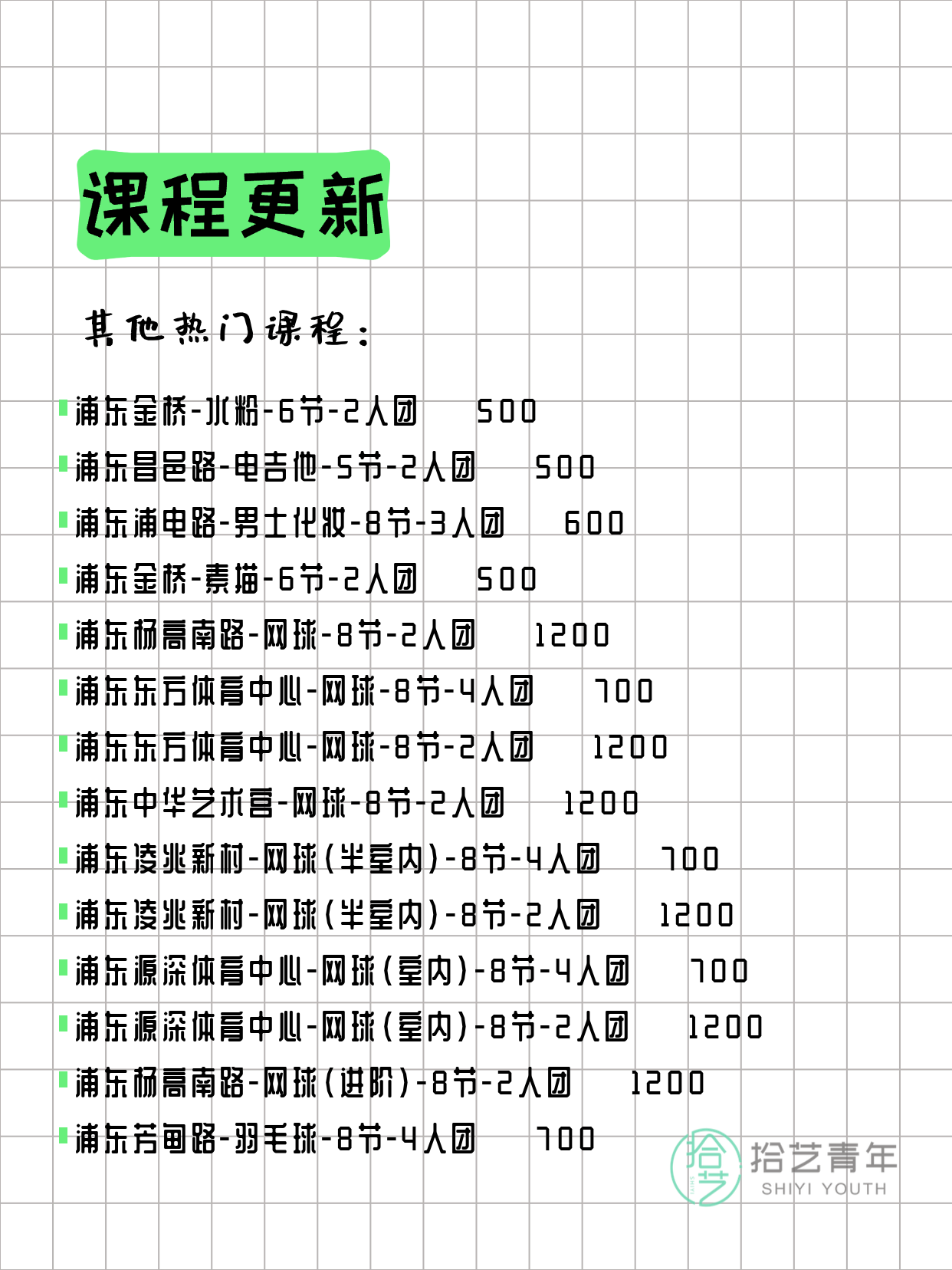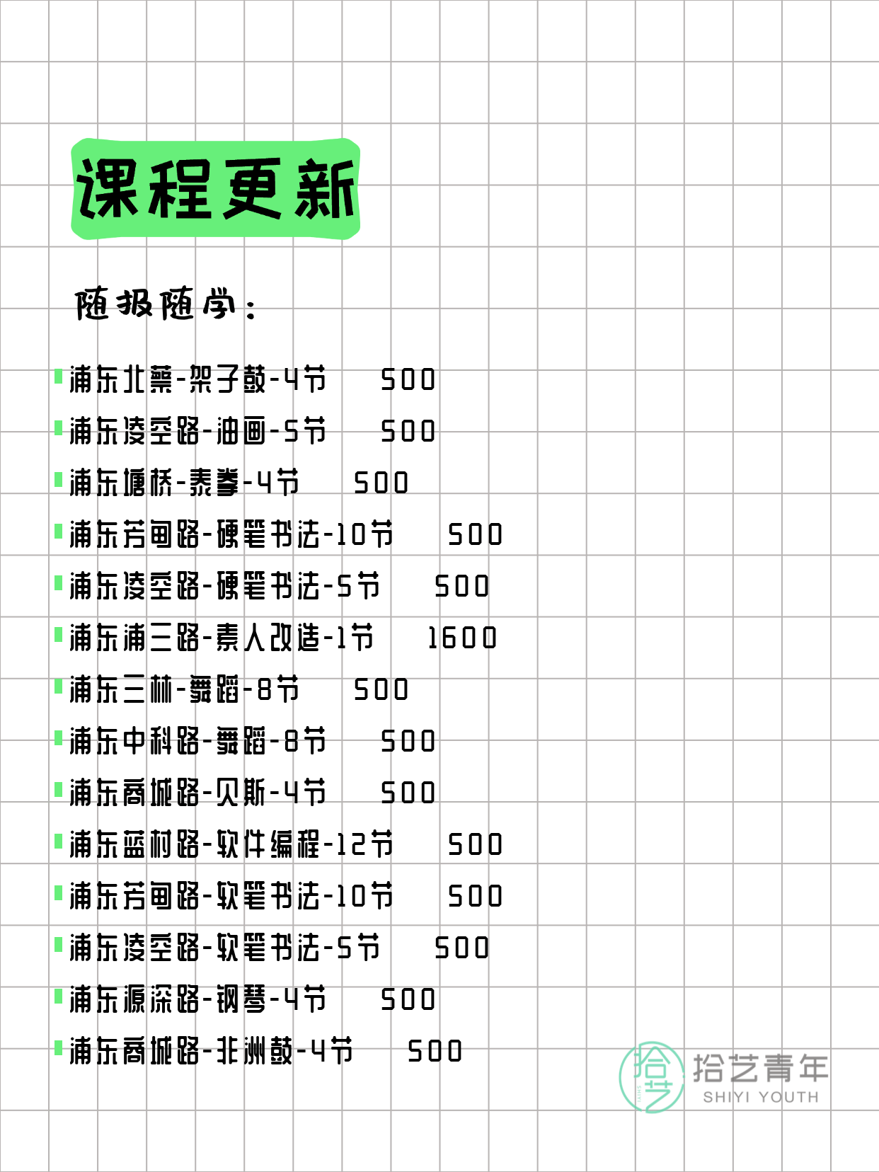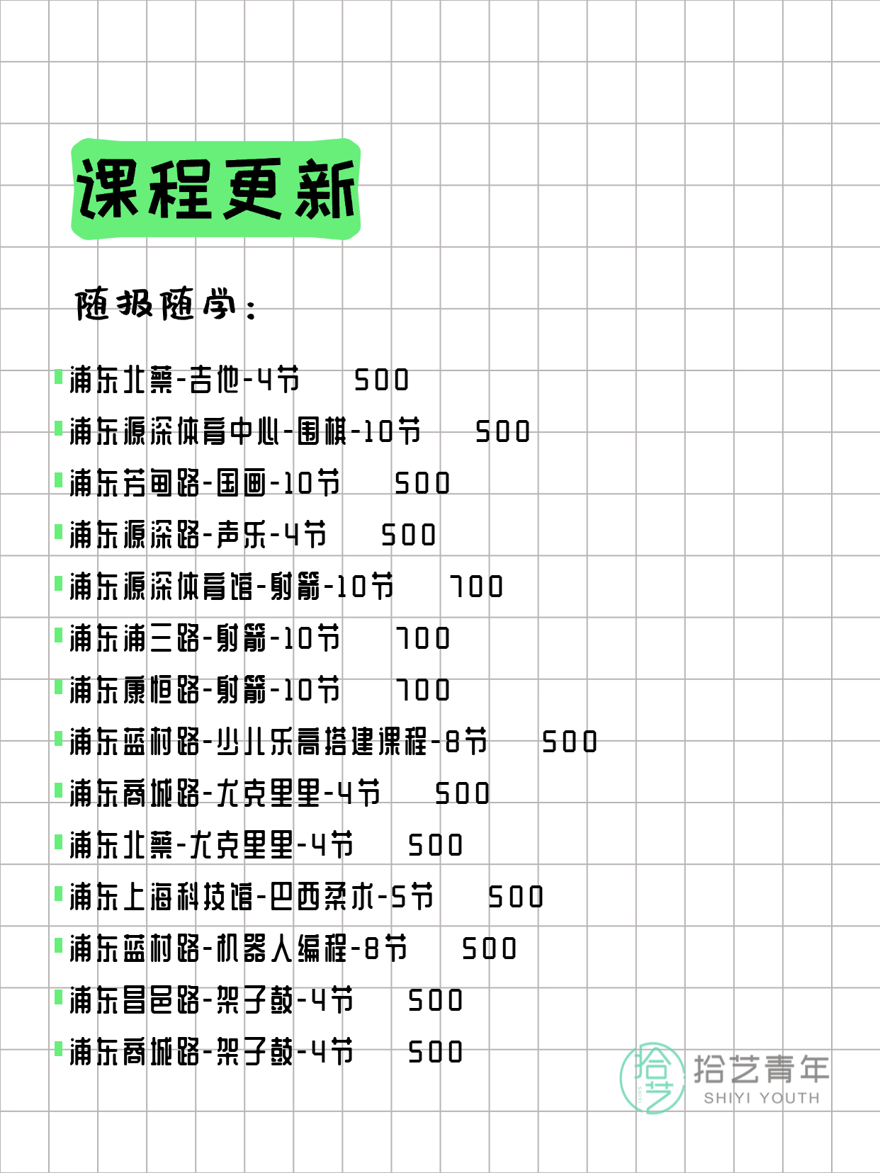 💡 提示:以上课程信息来自拾艺青年小程序,课程可能随报名动态变化,具体以小程序实时信息为准。