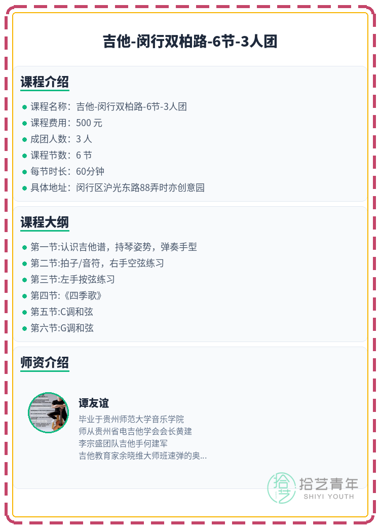 资讯>综合>正文闵行吉他|双柏路附近 缺1人拾艺青年2026-03-041 / 2还差1人就开课啦!吉他的小伙伴们速来~🙋🏫 上课地点:闵行区沪光东路88弄时亦创意园📅 课程安排:共6节 | 周五 19:00-20:00📖 课程大纲:第一节:认识吉他谱,持琴姿势,弹奏手型第二节:拍子/音符,右手空弦练习第三节:左手按弦练习第四节:《四季歌》第五节:C调和弦第六节:G调和弦👥 3人团 | 已报2人 | 还差1人开课#上海夜校 #闵行夜校 #吉他课程 #夜校拼团 #上海线下课相关标签#上海夜校#闵行夜校#吉他课程#夜校拼团#上海线下课