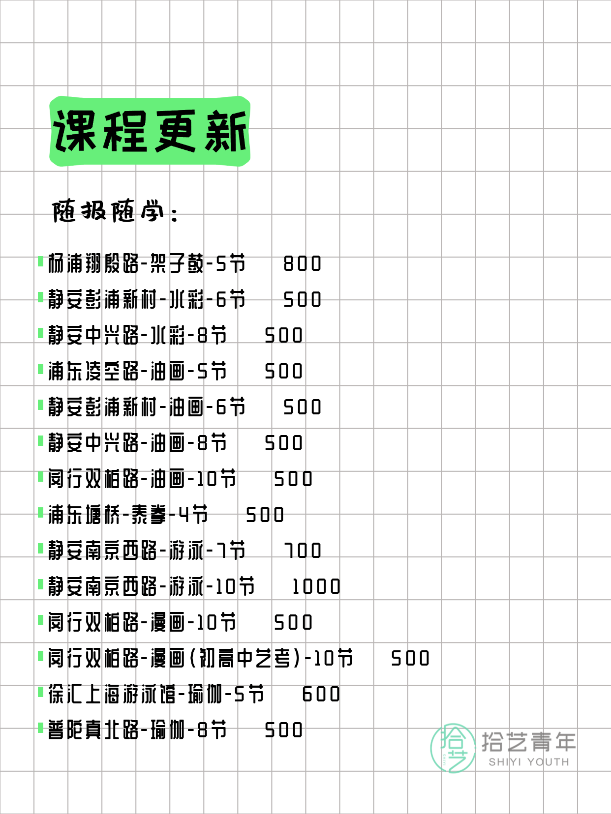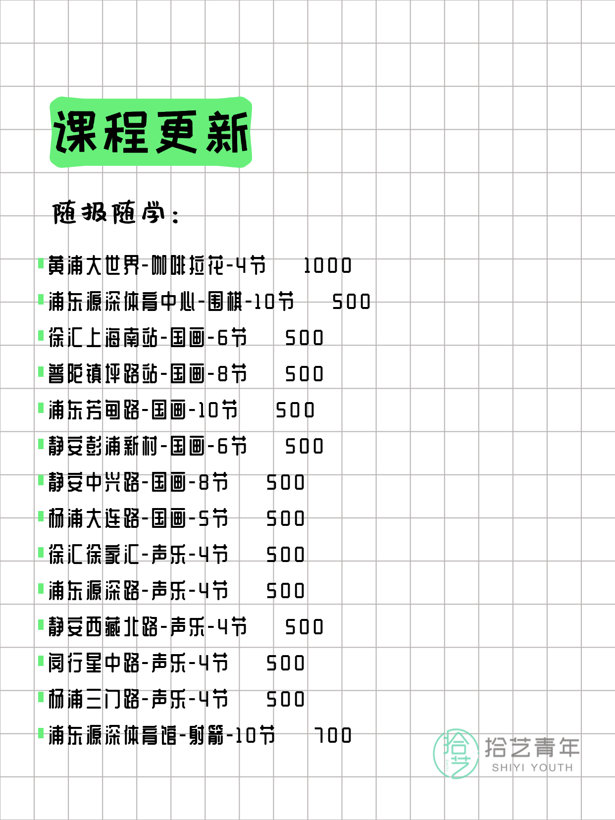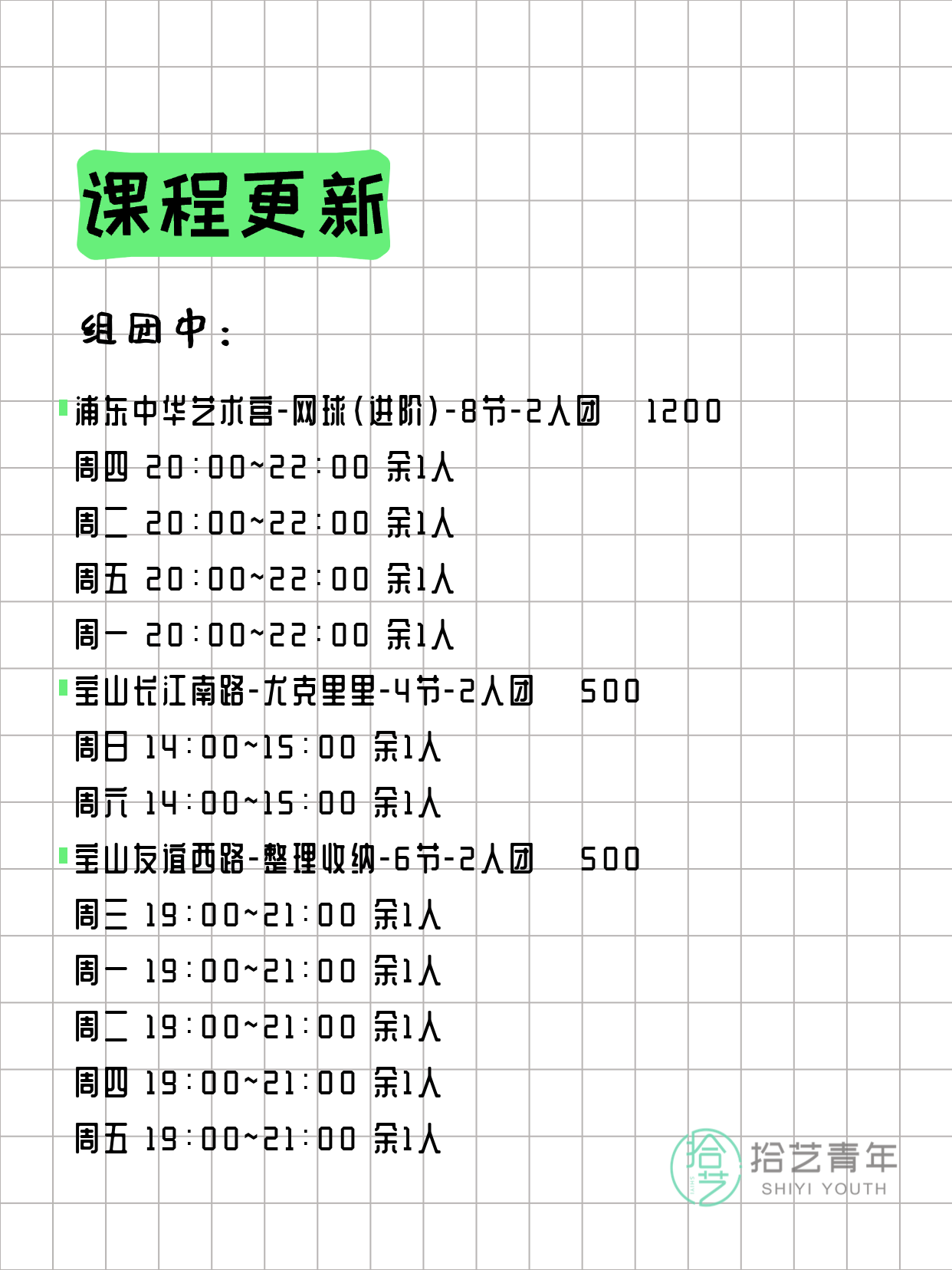 资讯>综合>正文4月4日上海夜校课程合集拾艺青年2026-04-041 / 17📊 本期课程概况• 总课程数:372门• 组团中课程:66门• 覆盖区域:15个区详见图片,欢迎报名咨询。💡 提示:以上课程信息来自拾艺青年小程序,课程可能随报名动态变化,具体以小程序实时信息为准。👉 微信小程序链接:#小程序://拾艺青年/WmfwH22mnQUxZwb