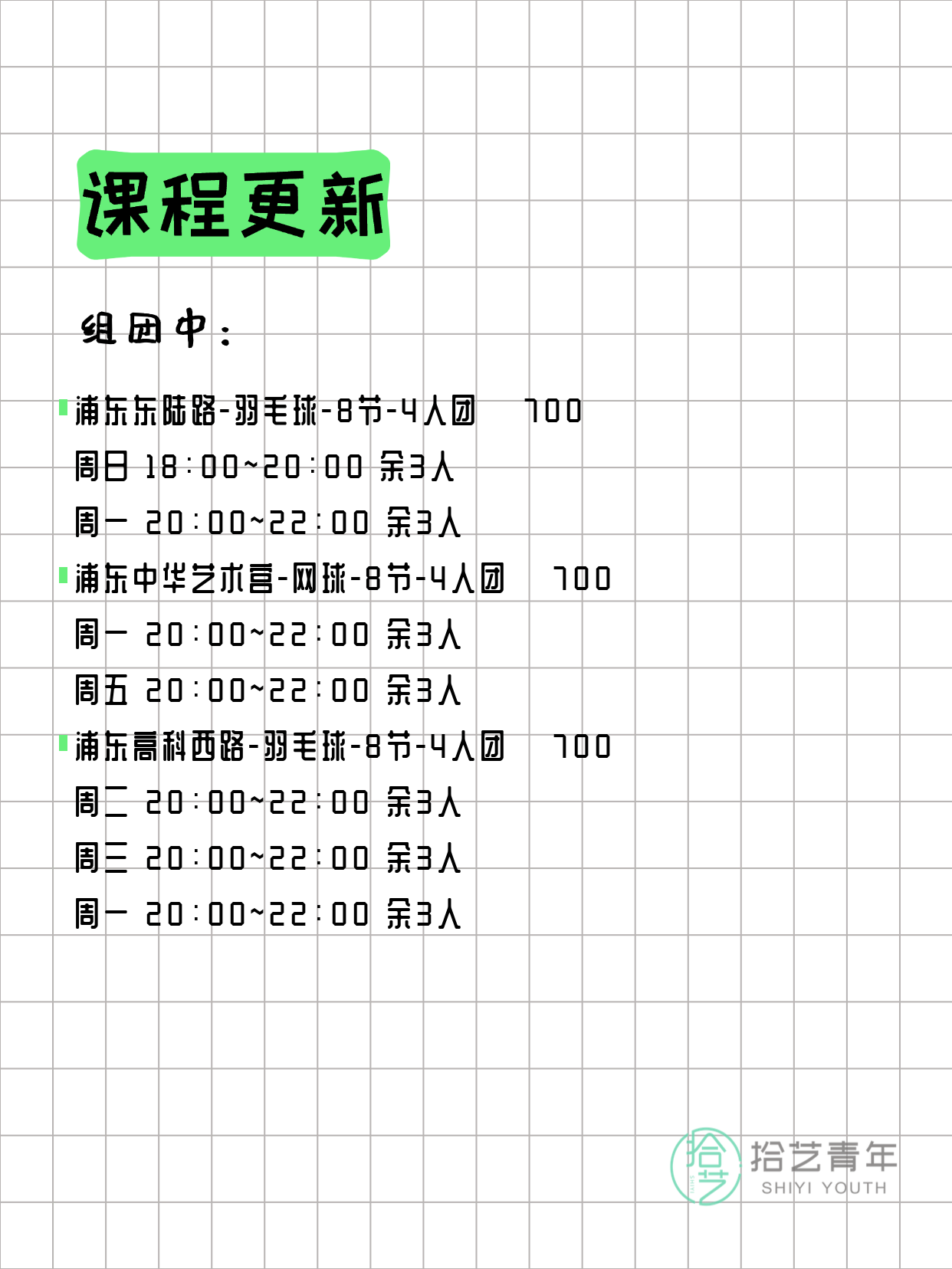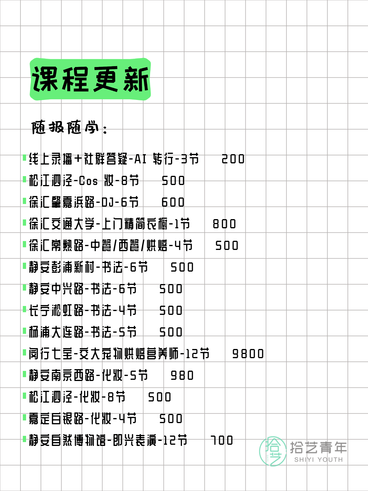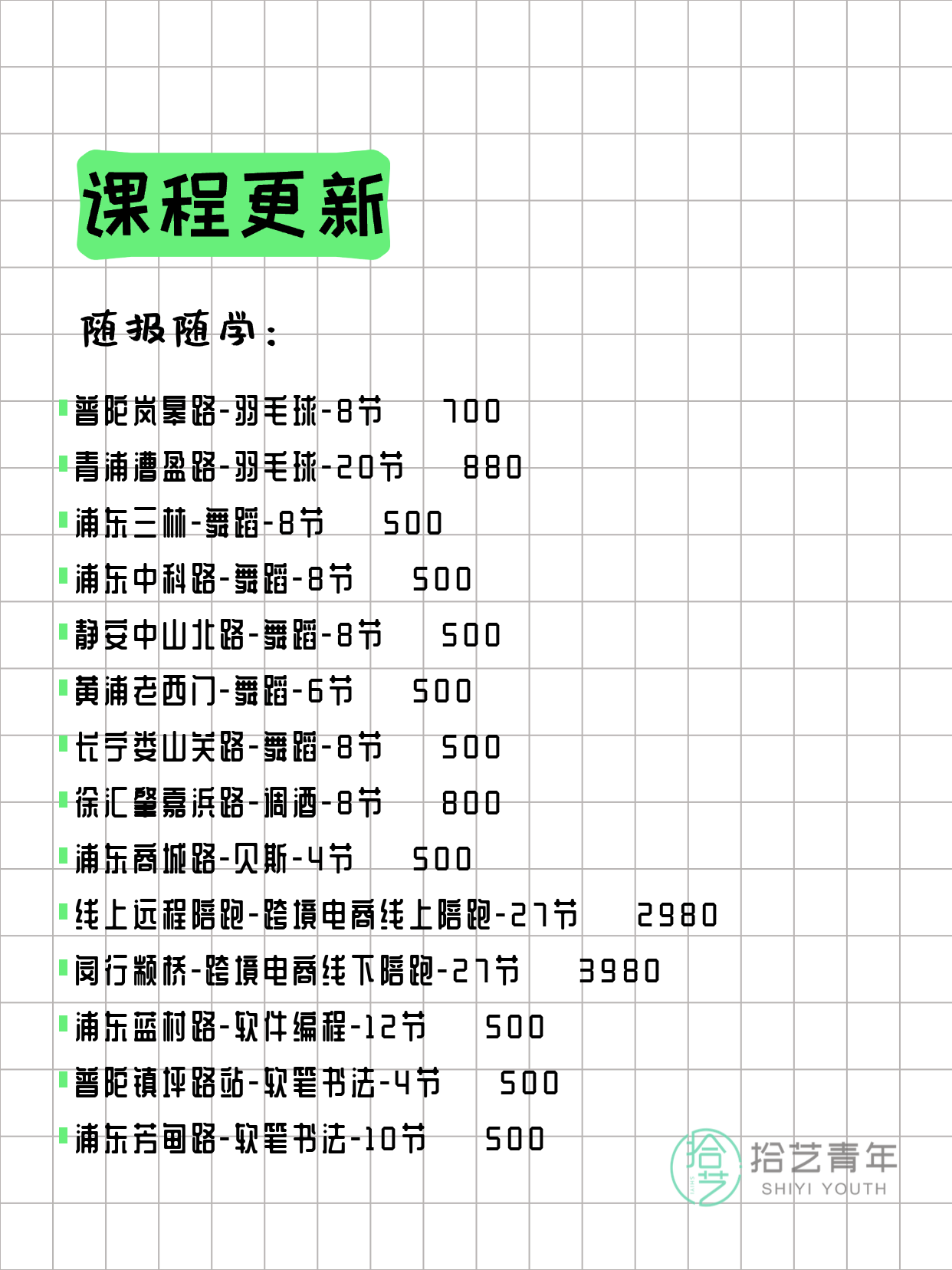 资讯>综合>正文4月4日上海夜校课程合集拾艺青年2026-04-041 / 17📊 本期课程概况• 总课程数:372门• 组团中课程:66门• 覆盖区域:15个区详见图片,欢迎报名咨询。💡 提示:以上课程信息来自拾艺青年小程序,课程可能随报名动态变化,具体以小程序实时信息为准。👉 微信小程序链接:#小程序://拾艺青年/WmfwH22mnQUxZwb