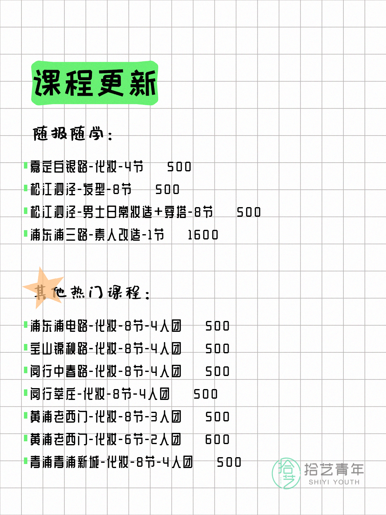 💡 提示:以上课程信息来自拾艺青年小程序,课程可能随报名动态变化,具体以小程序实时信息为准。
