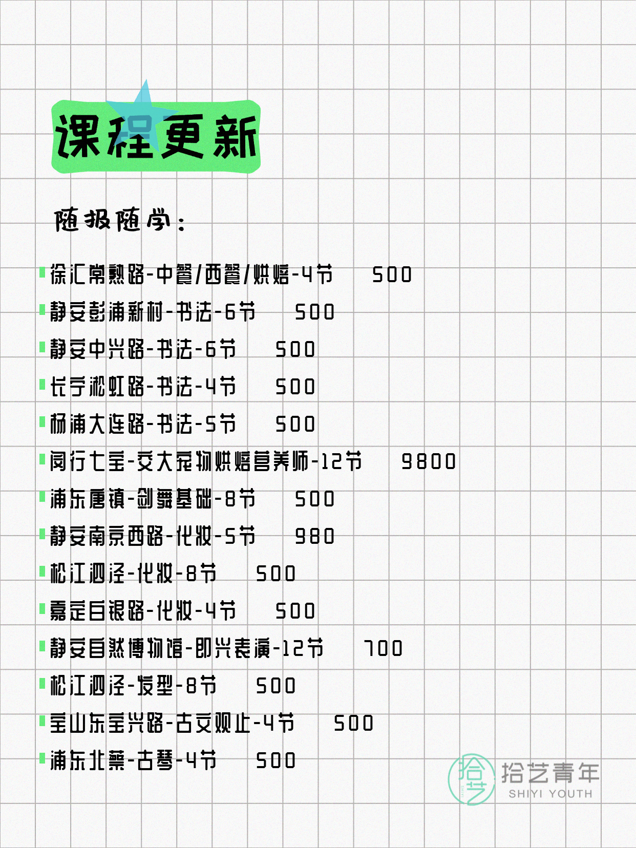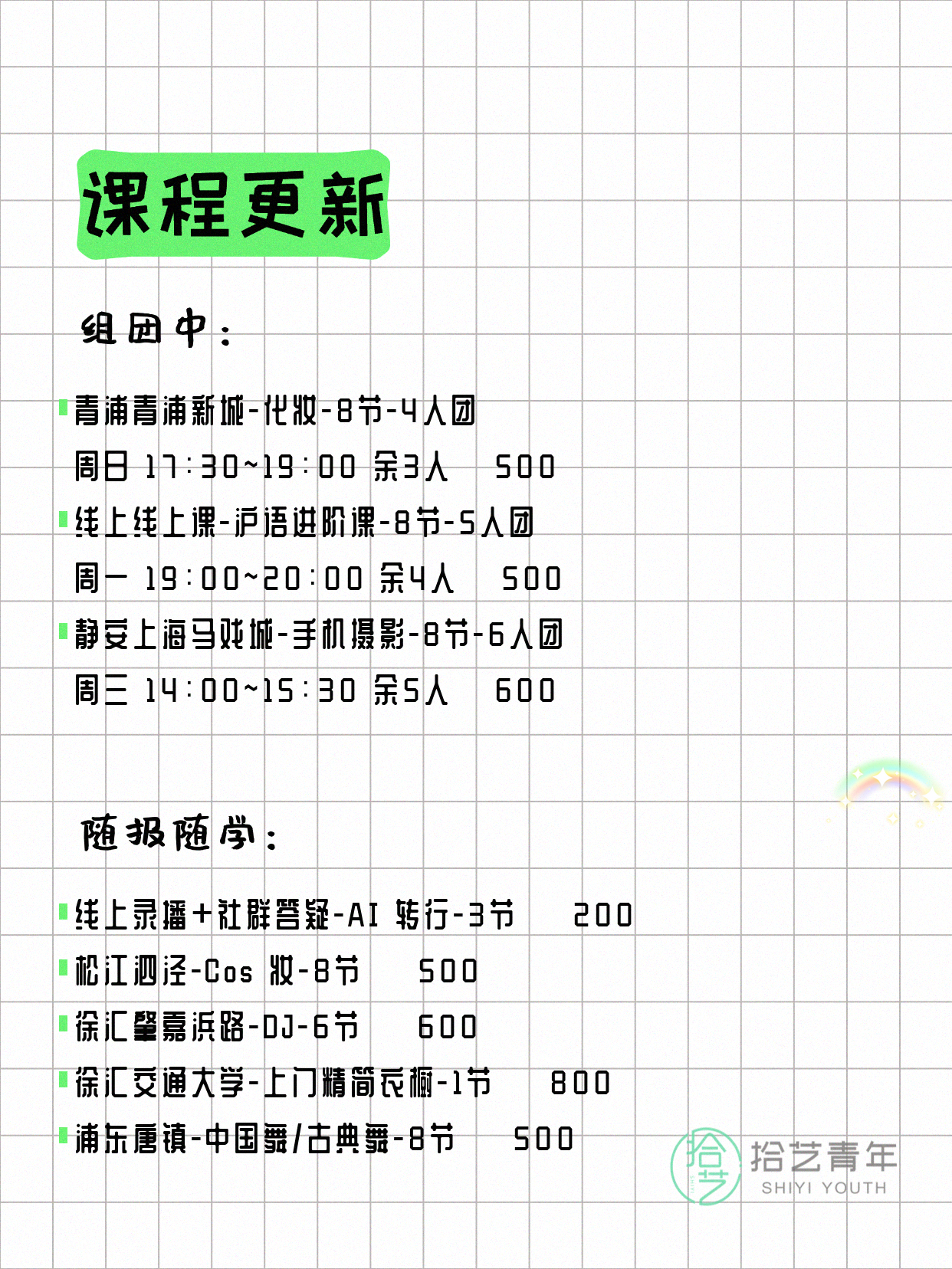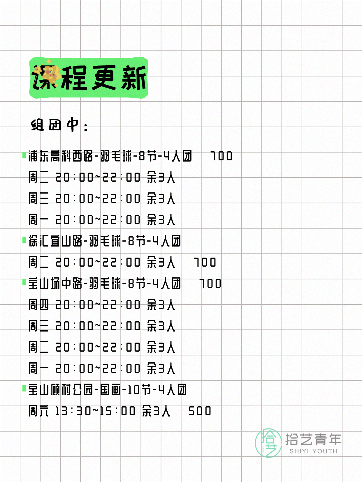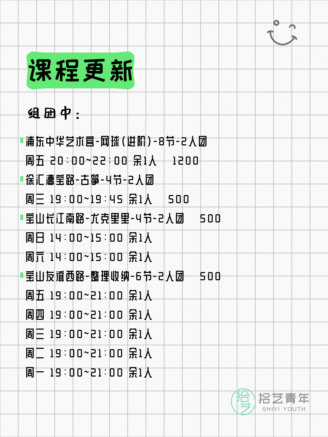 资讯>综合>正文4月6日上海夜校课程合集拾艺青年2026-04-06·2 阅读1 / 17📊 本期课程概况• 总课程数:367门• 组团中课程:61门• 覆盖区域:15个区详见图片,欢迎报名咨询。💡 提示:以上课程信息来自拾艺青年小程序,课程可能随报名动态变化,具体以小程序实时信息为准。👉 微信小程序链接:#小程序://拾艺青年/WmfwH22mnQUxZwb