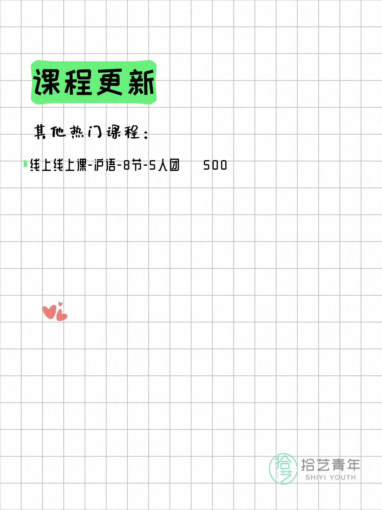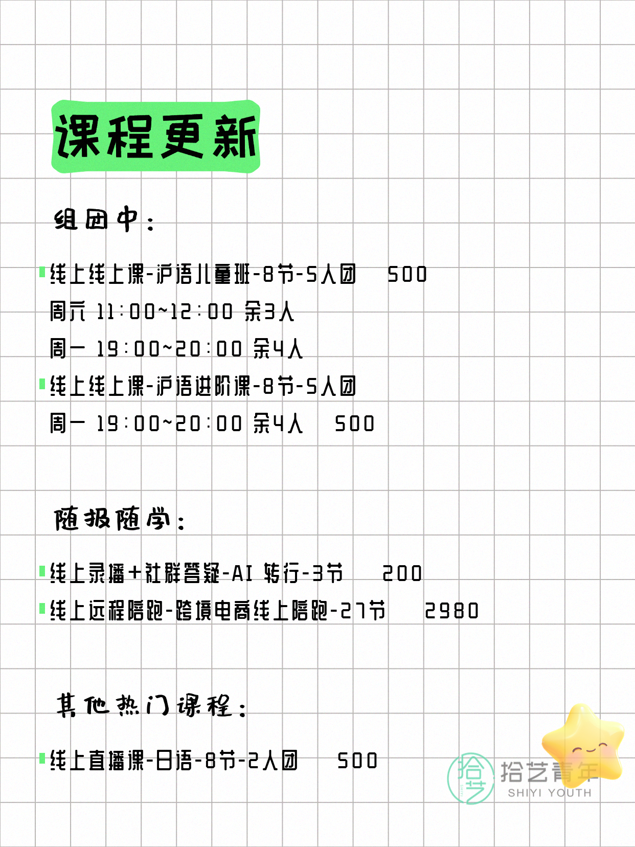 💡 提示:以上课程信息来自拾艺青年小程序,课程可能随报名动态变化,具体以小程序实时信息为准。