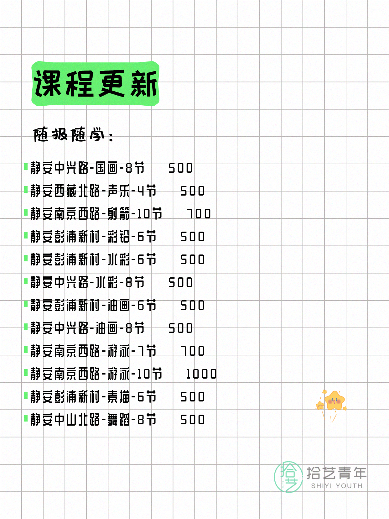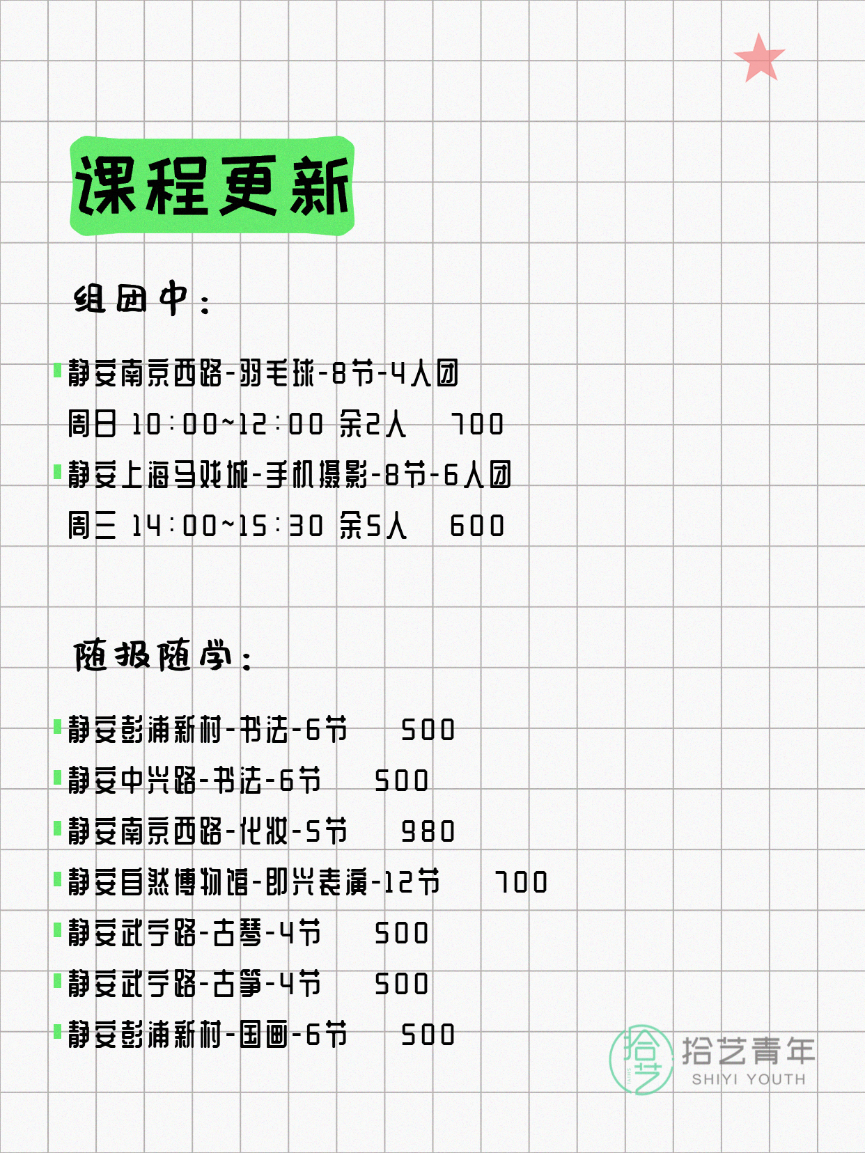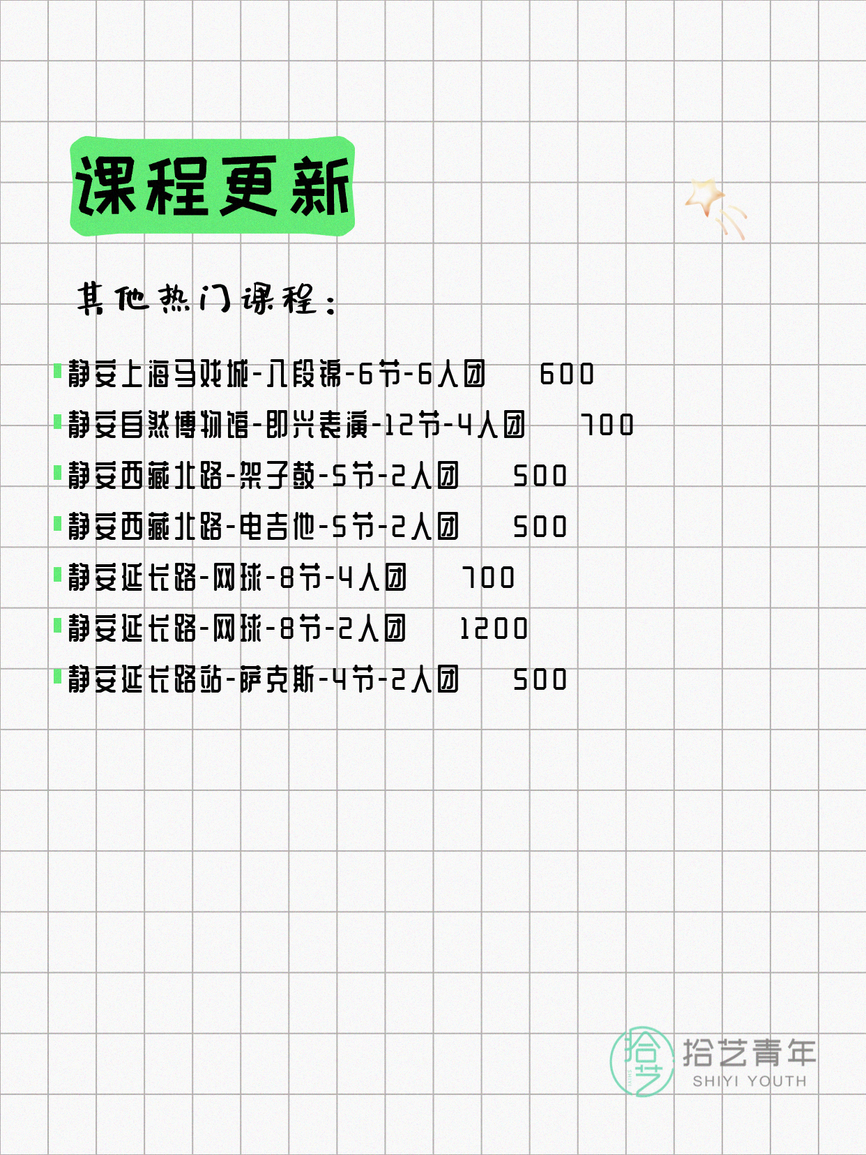 💡 提示:以上课程信息来自拾艺青年小程序,课程可能随报名动态变化,具体以小程序实时信息为准。