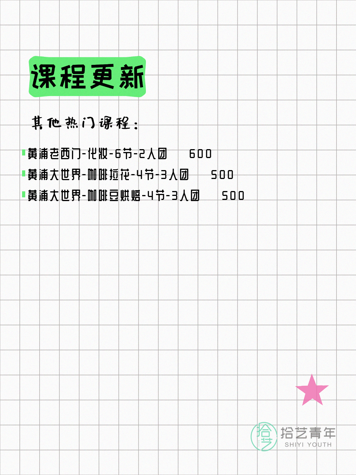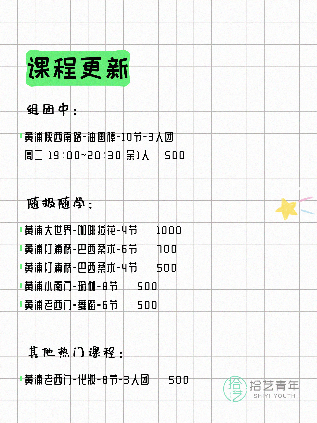 💡 提示:以上课程信息来自拾艺青年小程序,课程可能随报名动态变化,具体以小程序实时信息为准。