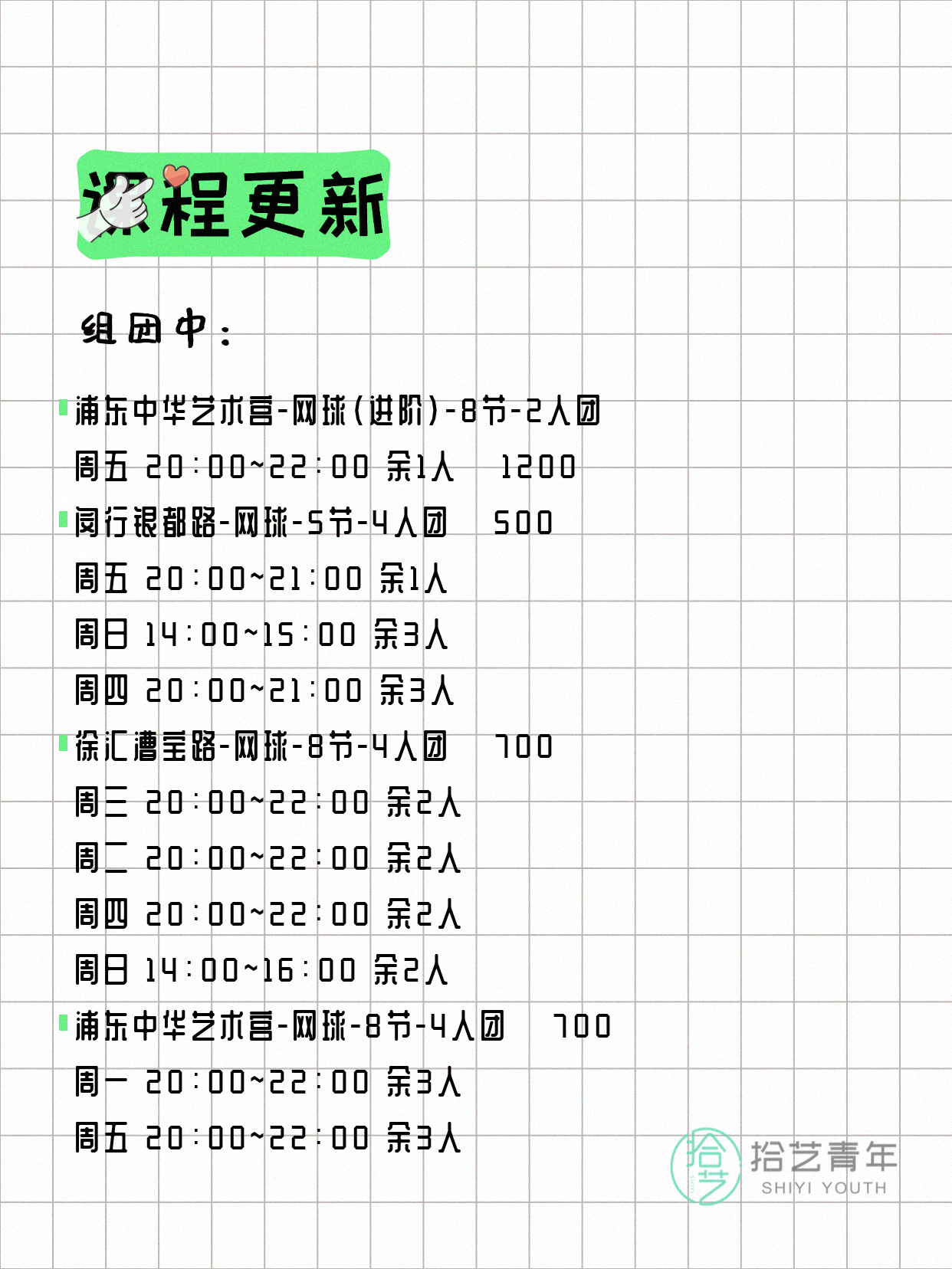 🔥 网球-浦东中华艺术宫-8节-4人团 💰700