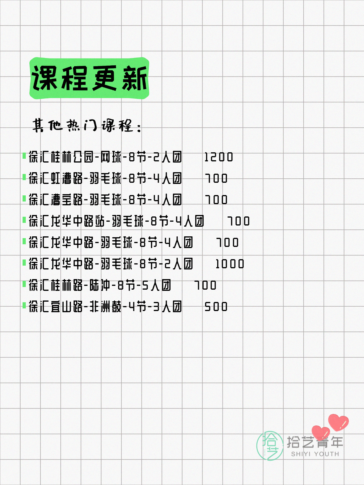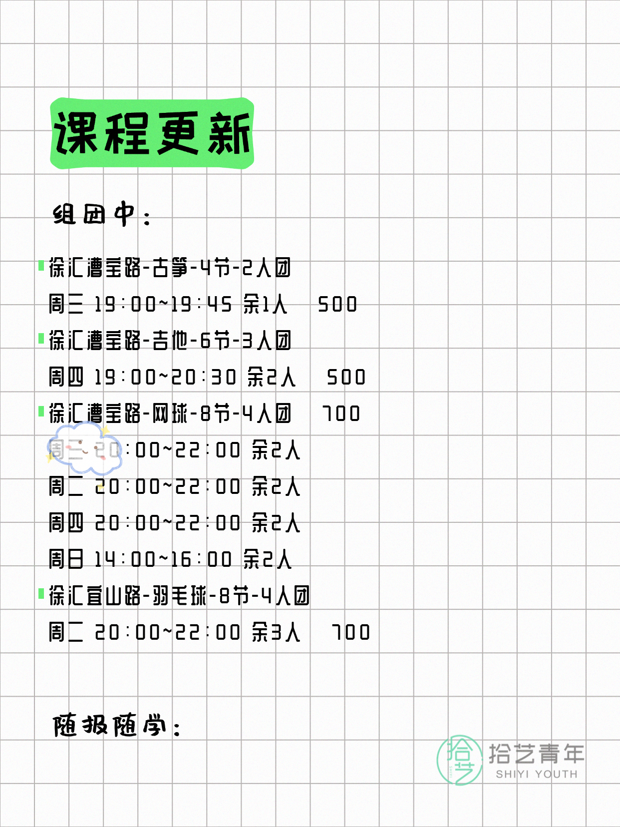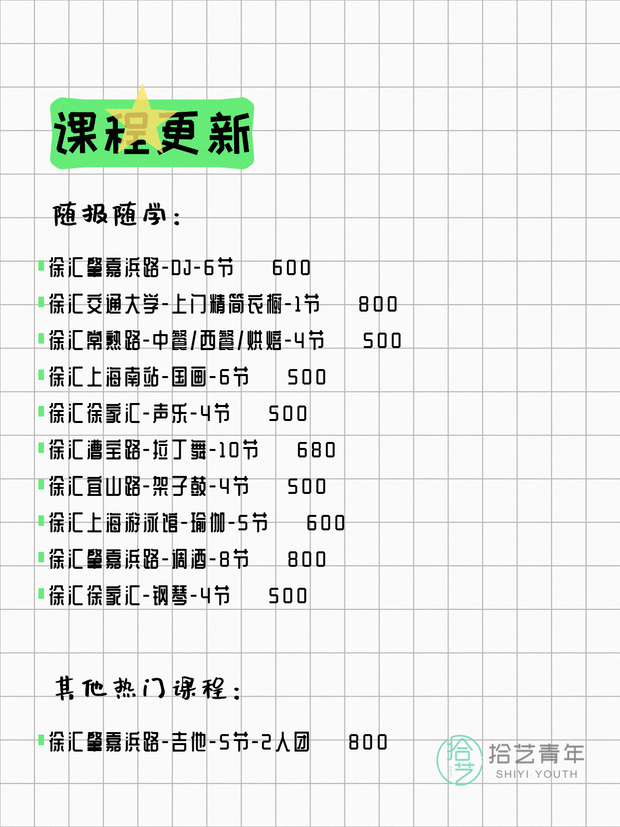 💡 提示:以上课程信息来自拾艺青年小程序,课程可能随报名动态变化,具体以小程序实时信息为准。
