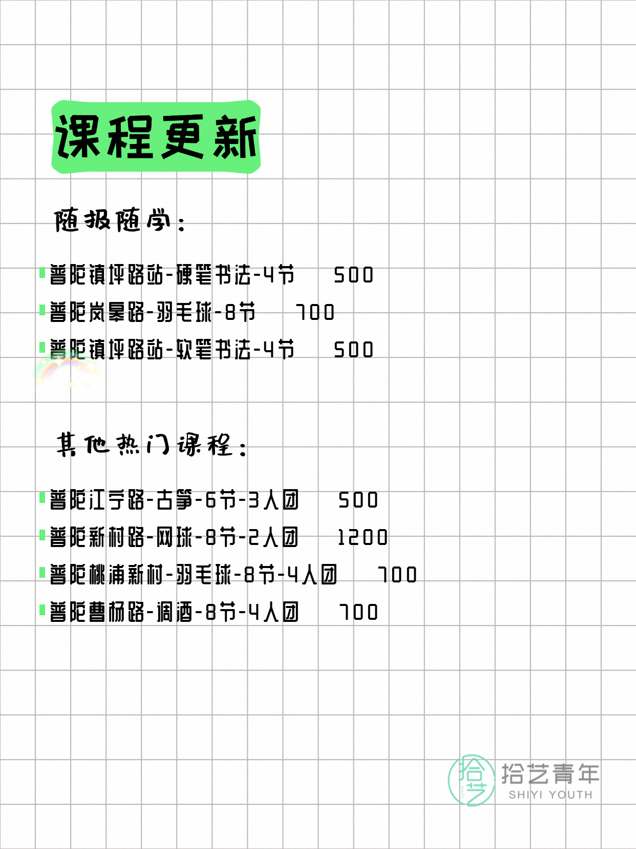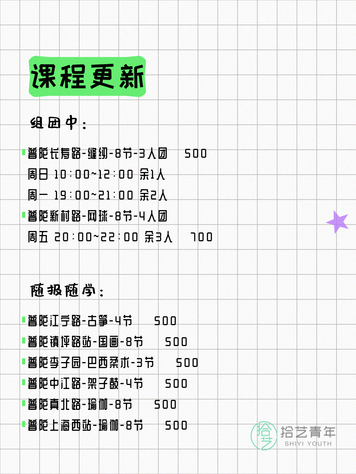 💡 提示:以上课程信息来自拾艺青年小程序,课程可能随报名动态变化,具体以小程序实时信息为准。