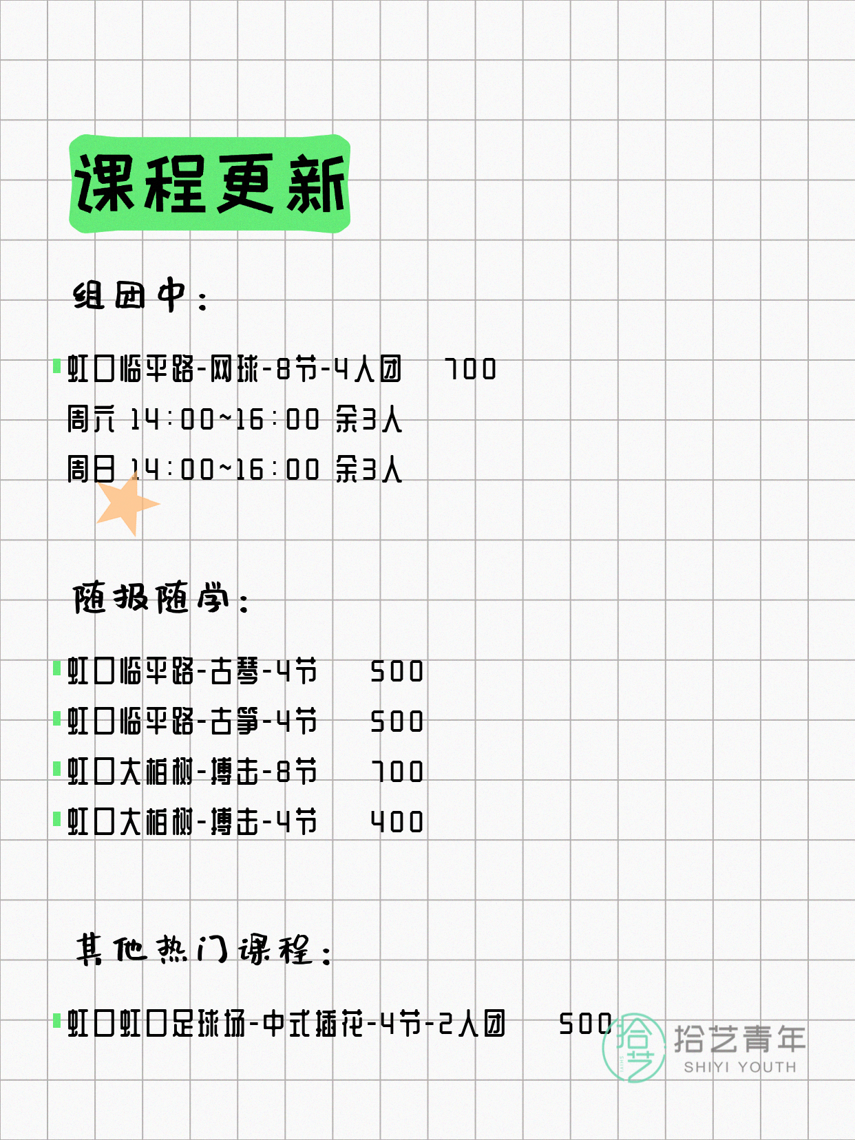 💡 提示:以上课程信息来自拾艺青年小程序,课程可能随报名动态变化,具体以小程序实时信息为准。
