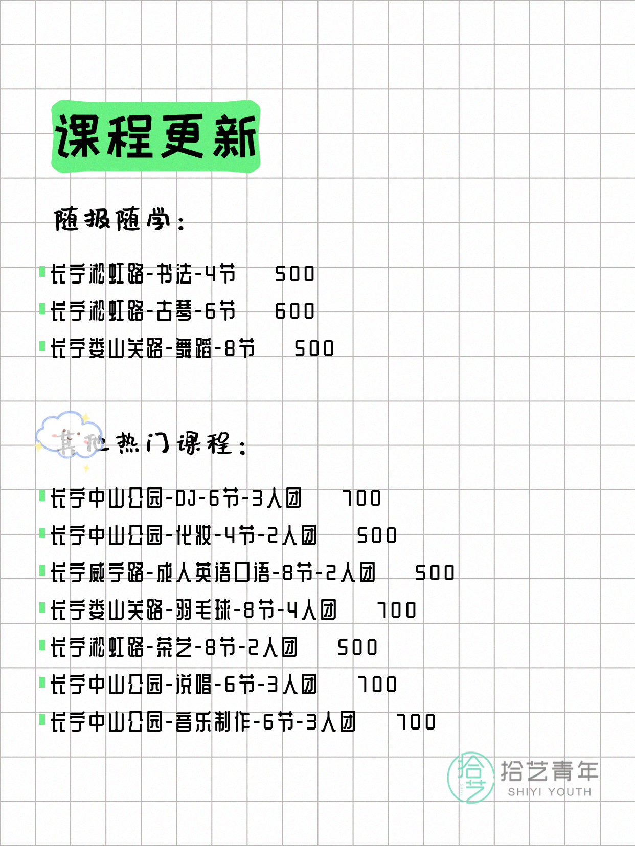 💡 提示:以上课程信息来自拾艺青年小程序,课程可能随报名动态变化,具体以小程序实时信息为准。