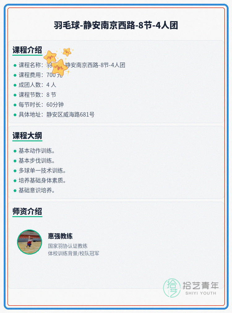 资讯>综合>正文静安南京西路羽毛球差1人 快来拾艺青年2026-04-071 / 2羽毛球课团人差最后1个,早报早开课~🏫 上课地点:静安区威海路681号📅 课程安排:共8节 | 周日 10:00-12:00📖 课程大纲:基本动作训练。基本步伐训练。多球单一技术训练。培养基础身体素质。基础意识培养。👥 4人团 | 已报3人 | 还差1人开课#上海夜校 #静安夜校 #羽毛球课程 #夜校拼团 #上海线下课相关标签#上海夜校#静安夜校#羽毛球课程#夜校拼团#上海线下课