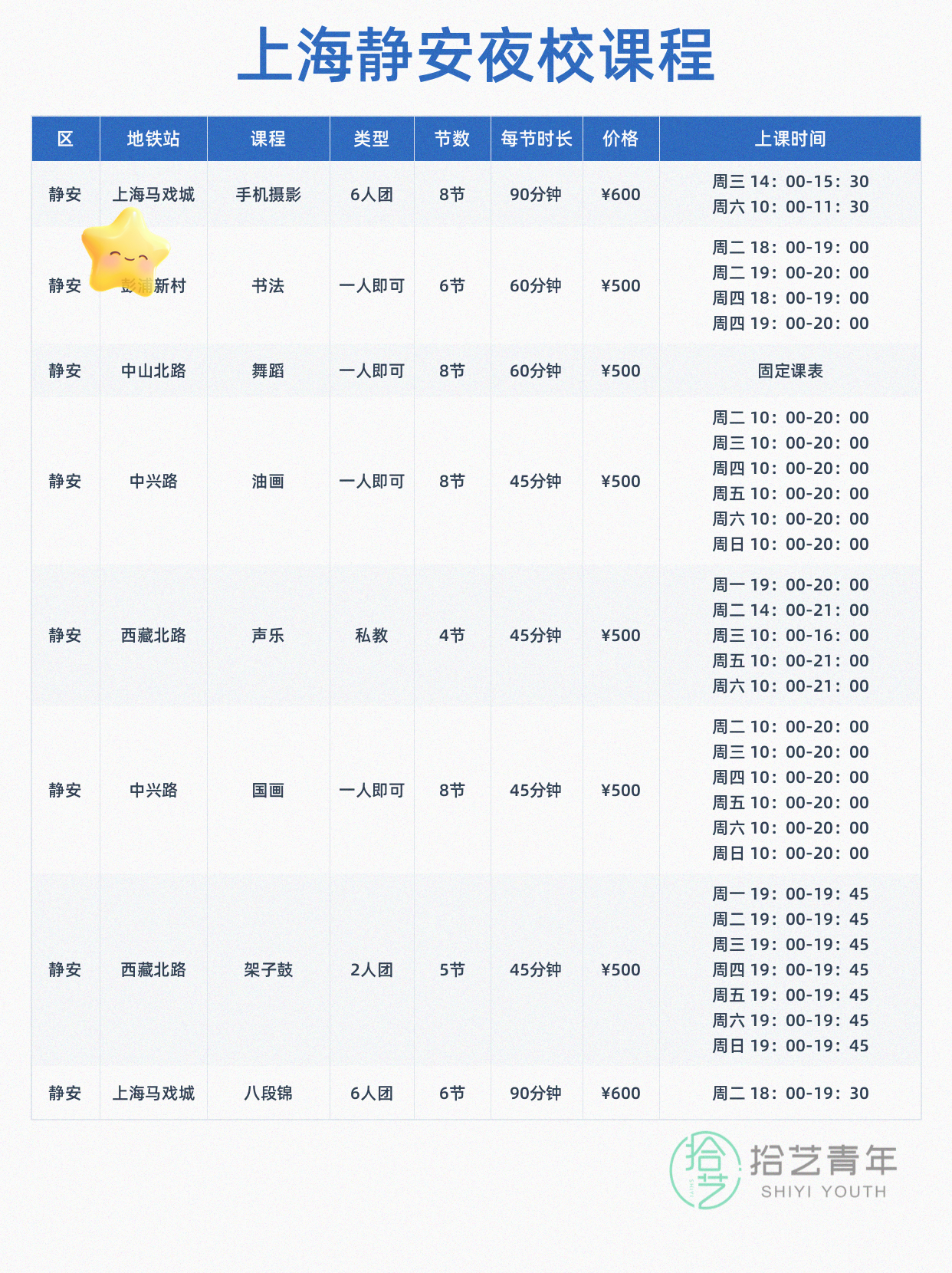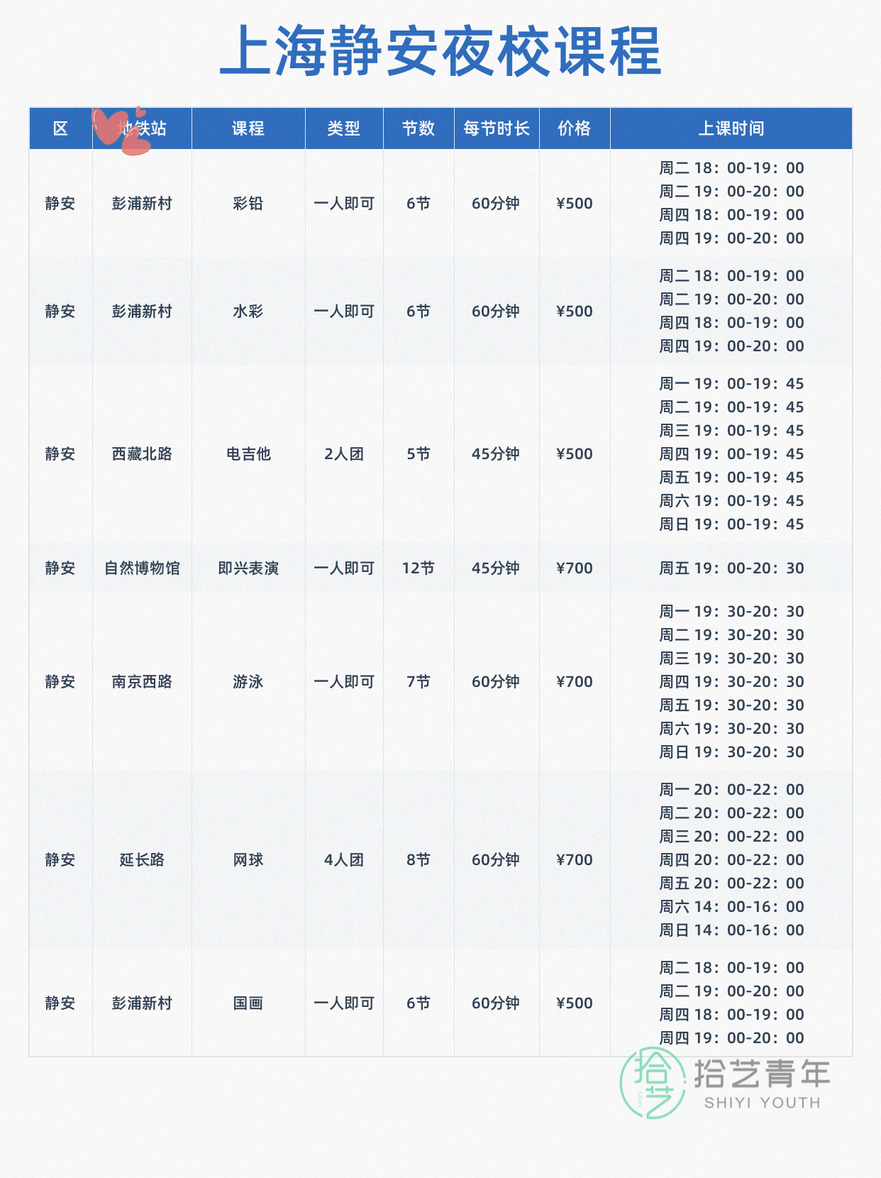 资讯>综合>正文家人们静安有宝藏!拾艺青年2026-04-111 / 3周末挖到宝!静安夜校课程超丰富📌即兴表演 🥁架子鼓 ✏️素描,地铁直达,下班就能去,太适合打发时间啦~相关标签##上海夜校##静安##打工人周末日常##兴趣爱好培养##城市休闲好去处