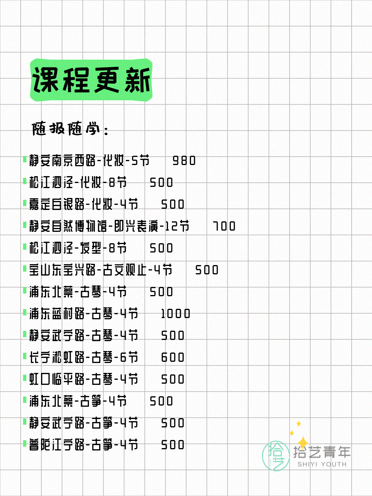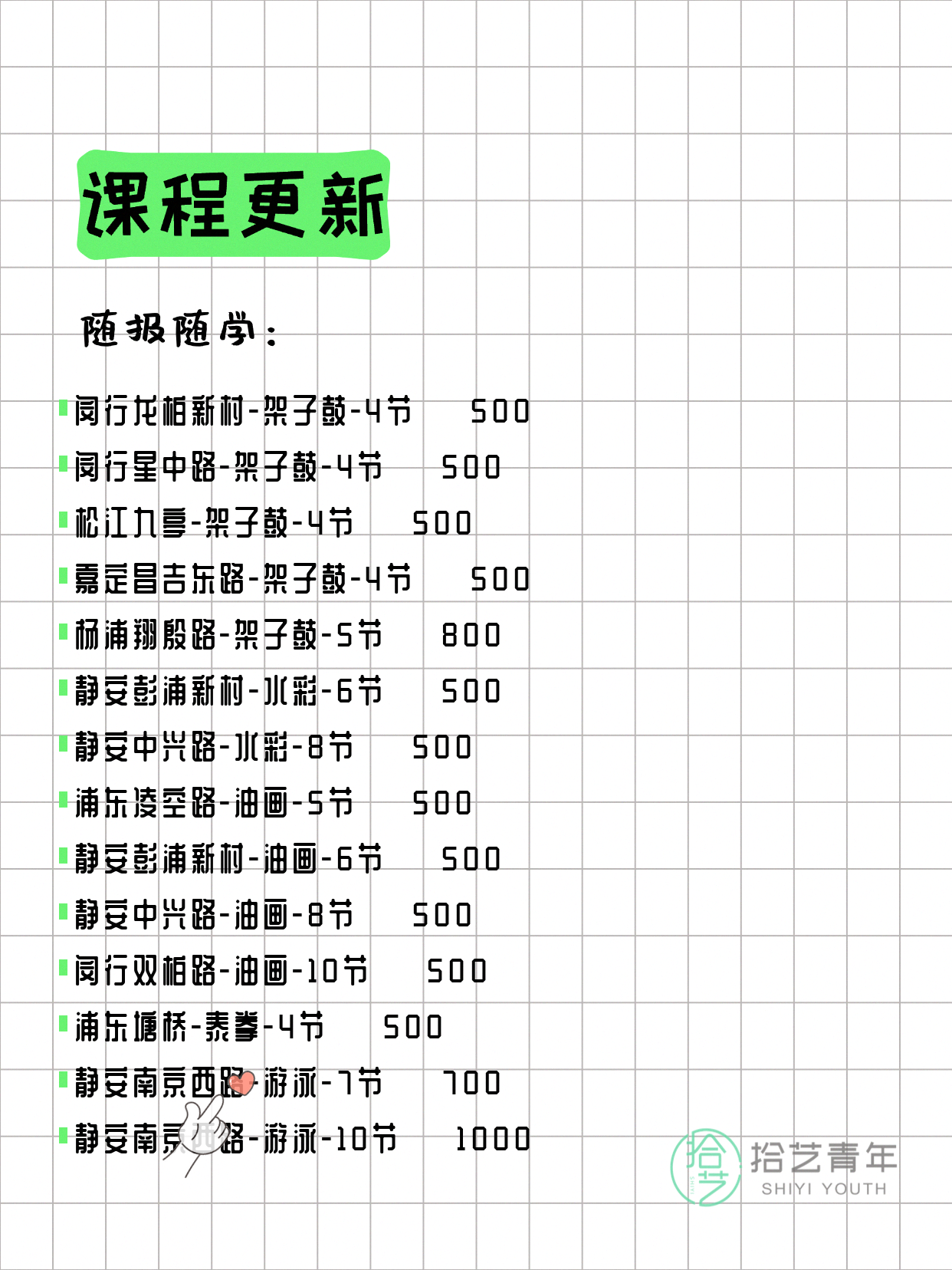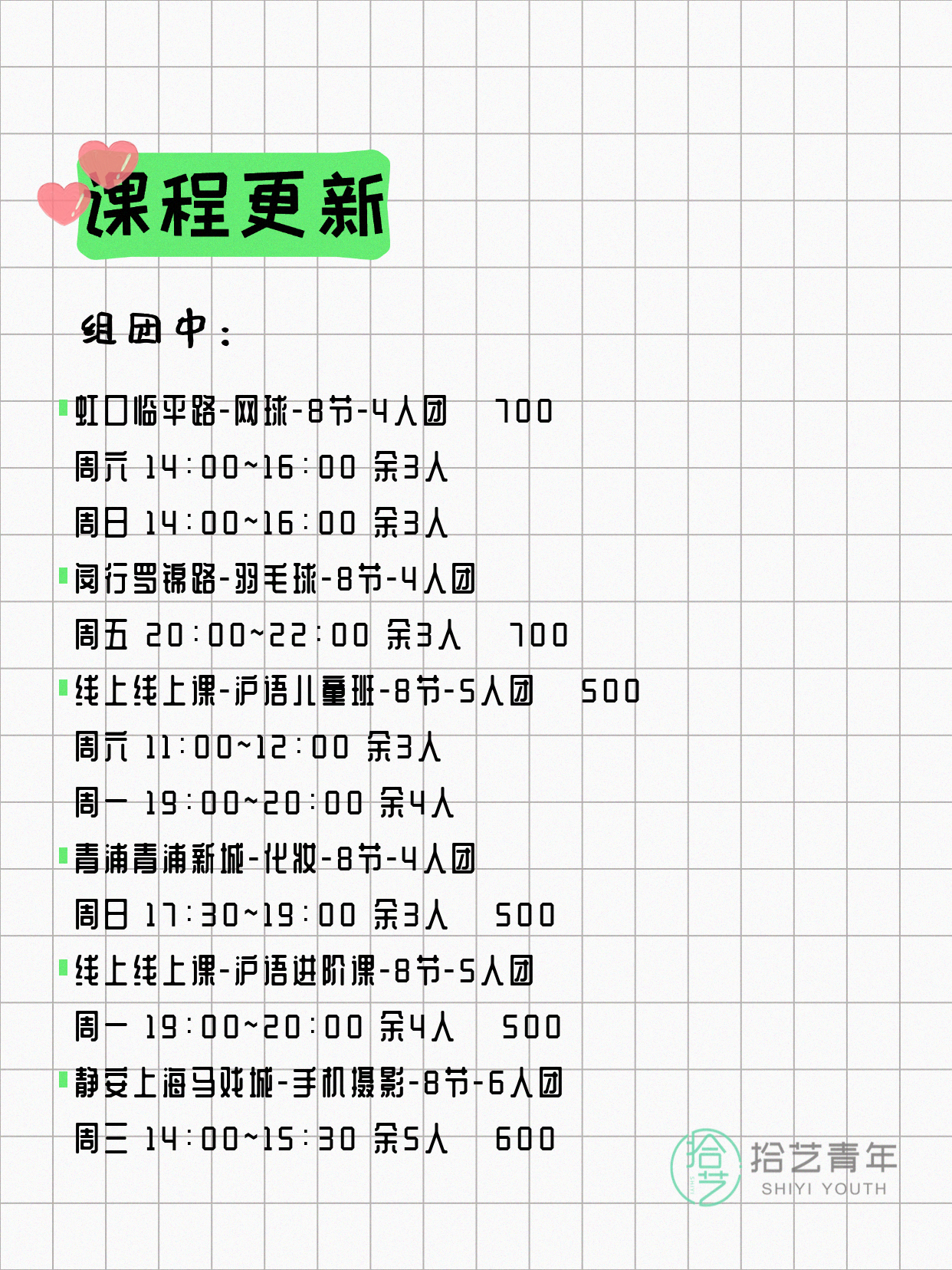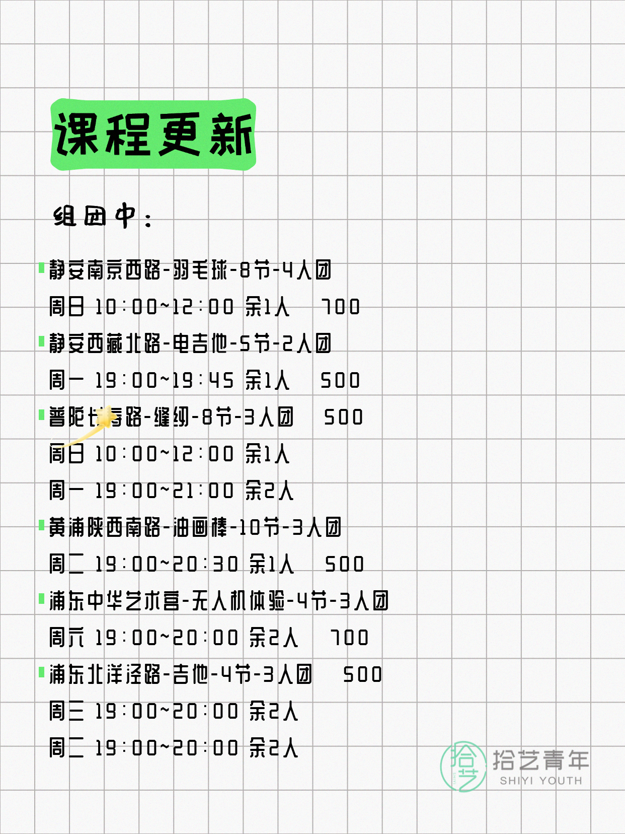 资讯>综合>正文4月8日上海夜校课程合集拾艺青年2026-04-081 / 17📊 本期课程概况• 总课程数:368门• 组团中课程:60门• 覆盖区域:15个区详见图片,欢迎报名咨询。💡 提示:以上课程信息来自拾艺青年小程序,课程可能随报名动态变化,具体以小程序实时信息为准。👉 微信小程序链接:#小程序://拾艺青年/WmfwH22mnQUxZwb