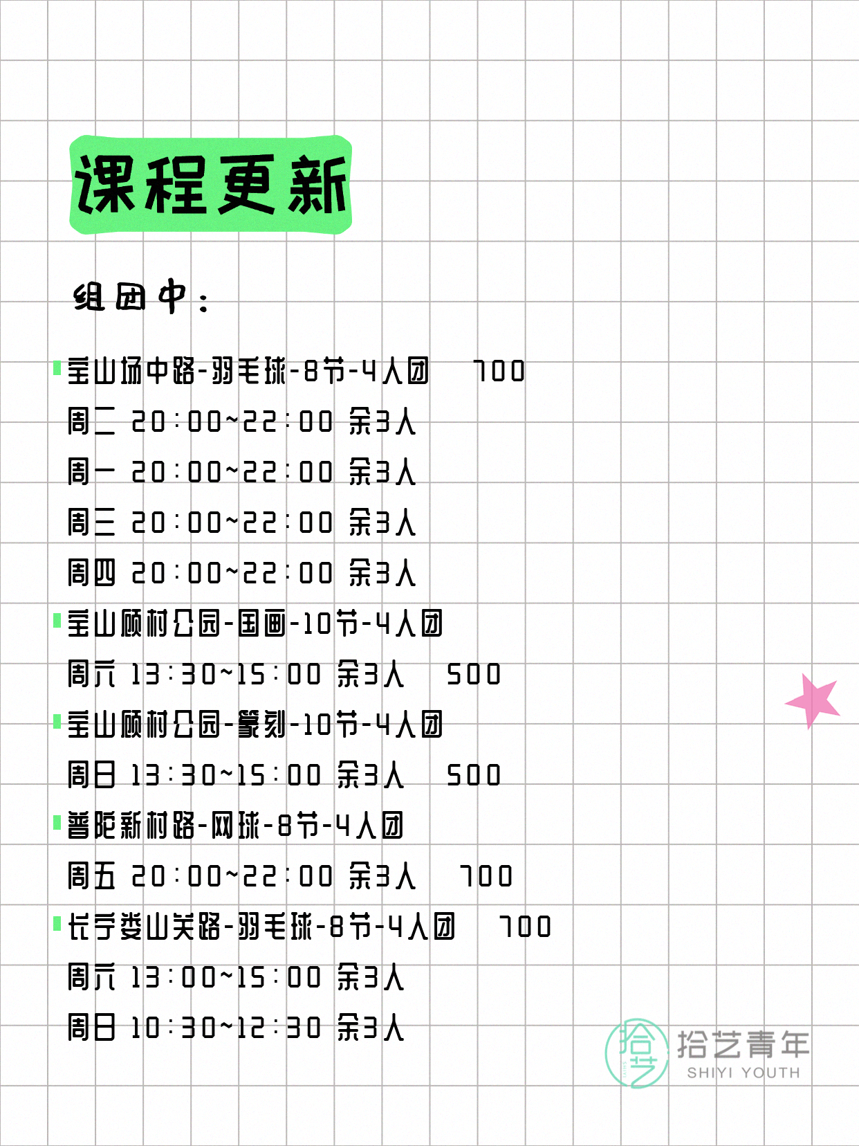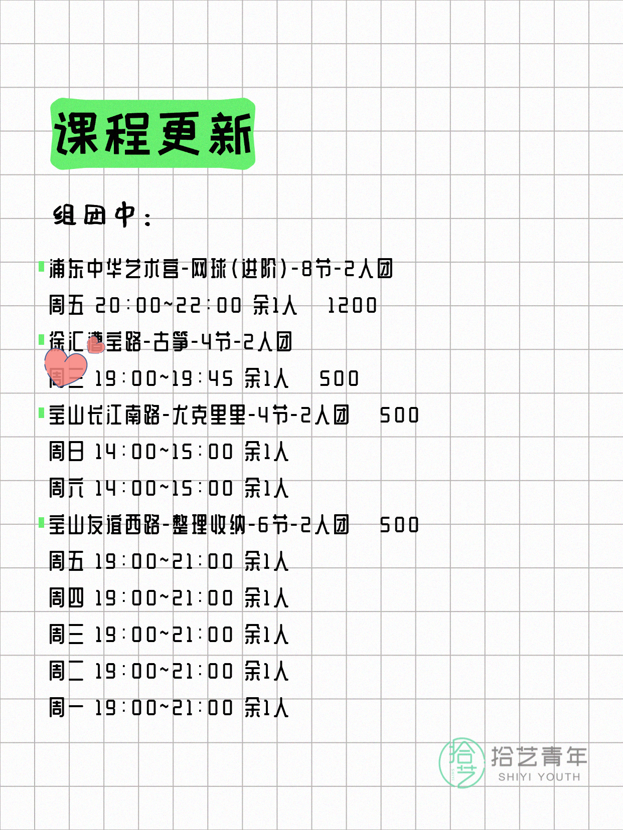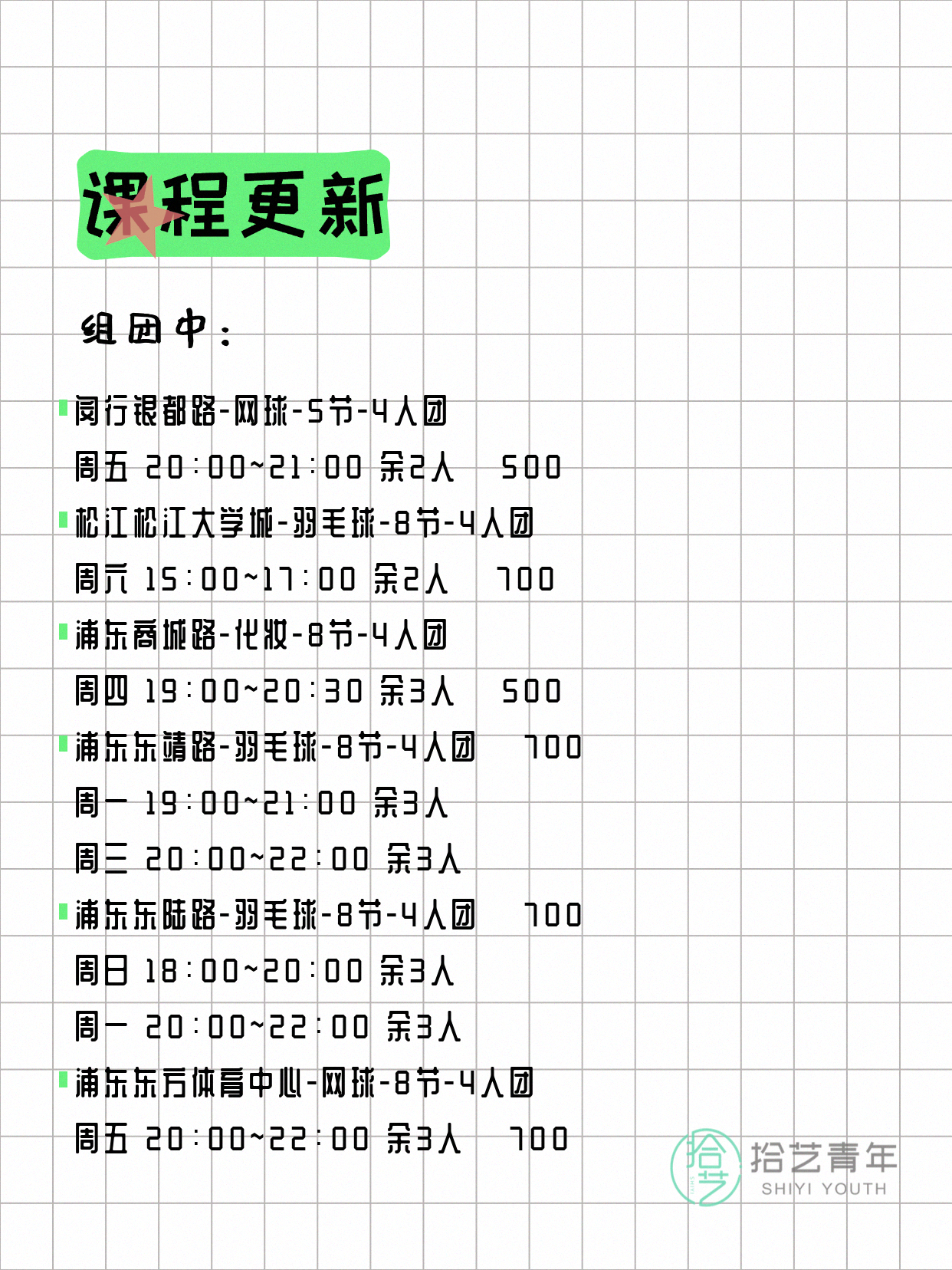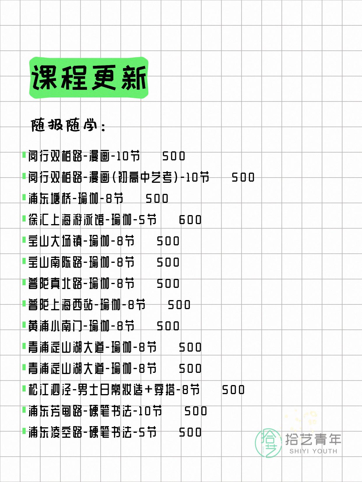 资讯>综合>正文4月8日上海夜校课程合集拾艺青年2026-04-081 / 17📊 本期课程概况• 总课程数:368门• 组团中课程:60门• 覆盖区域:15个区详见图片,欢迎报名咨询。💡 提示:以上课程信息来自拾艺青年小程序,课程可能随报名动态变化,具体以小程序实时信息为准。👉 微信小程序链接:#小程序://拾艺青年/WmfwH22mnQUxZwb