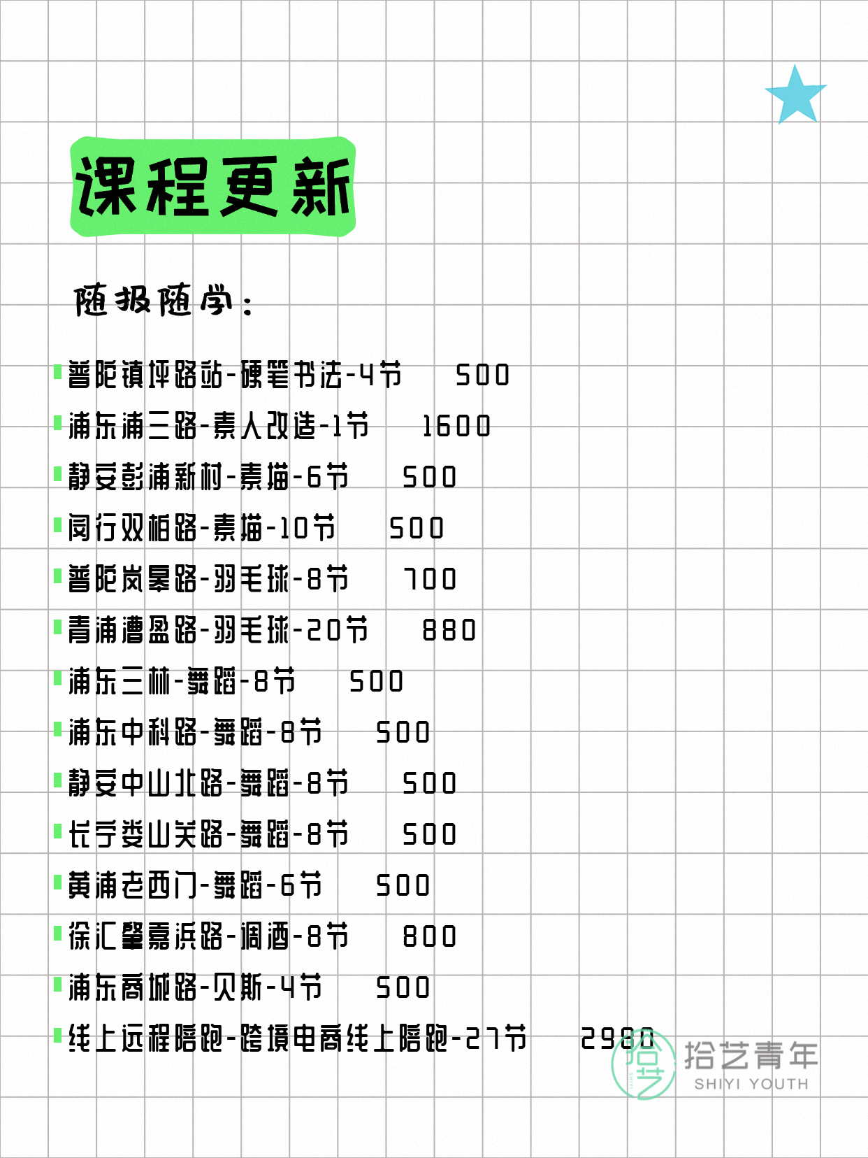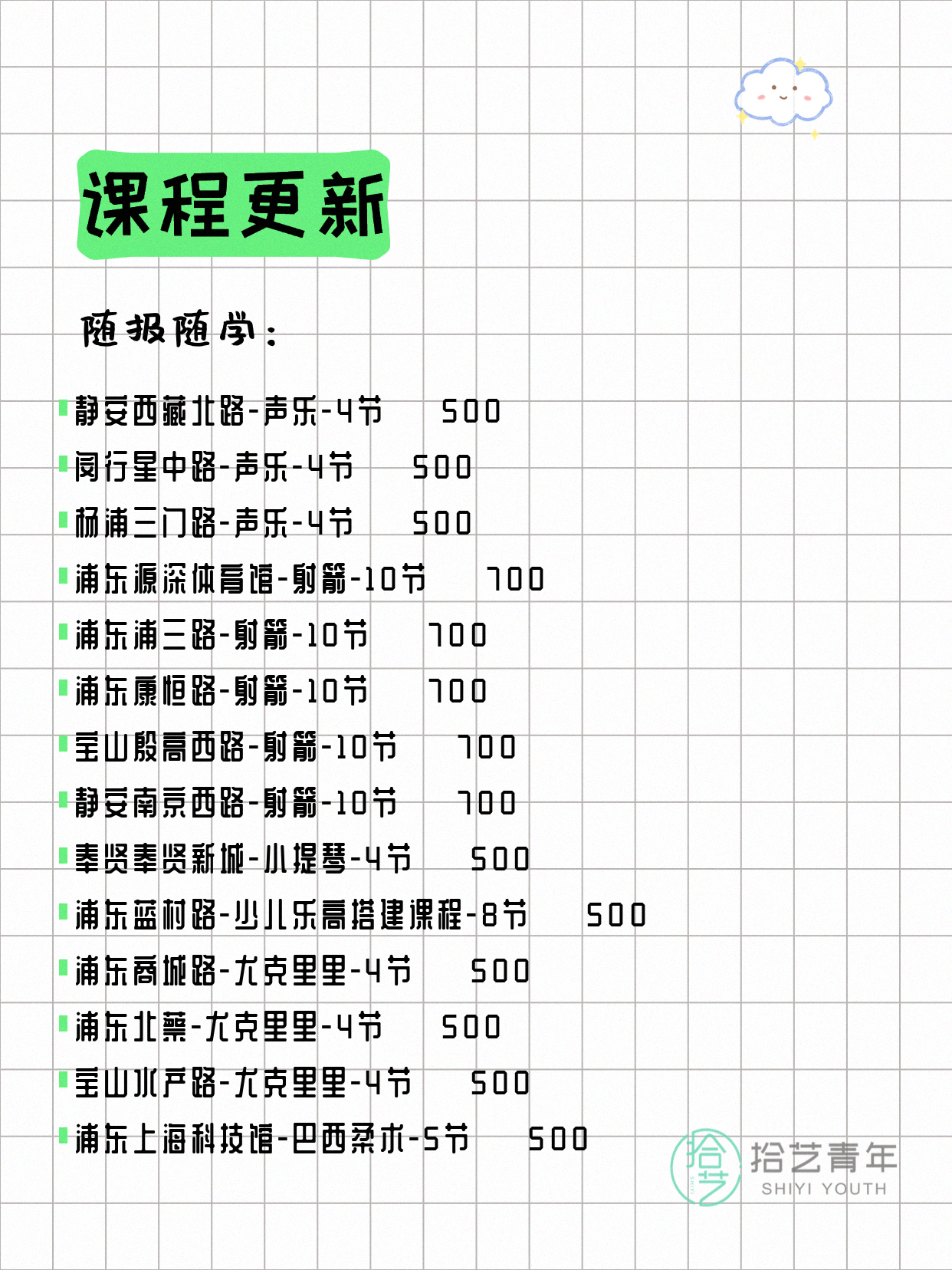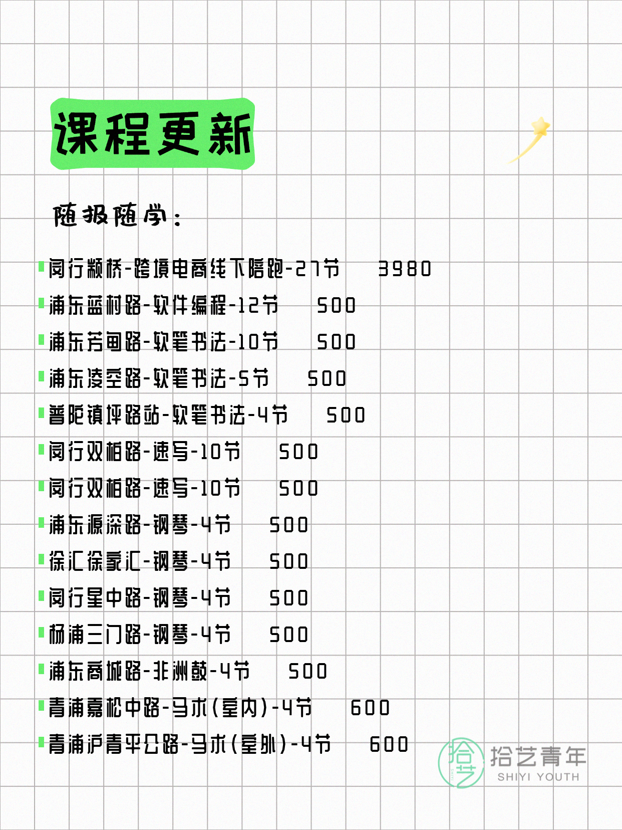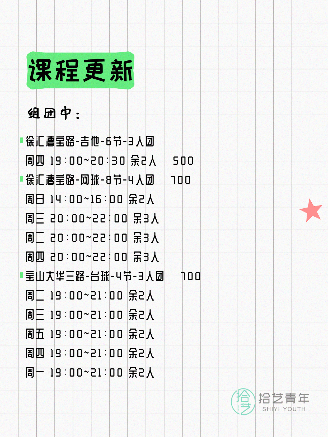 资讯>综合>正文4月8日上海夜校课程合集拾艺青年2026-04-081 / 17📊 本期课程概况• 总课程数:368门• 组团中课程:60门• 覆盖区域:15个区详见图片,欢迎报名咨询。💡 提示:以上课程信息来自拾艺青年小程序,课程可能随报名动态变化,具体以小程序实时信息为准。👉 微信小程序链接:#小程序://拾艺青年/WmfwH22mnQUxZwb