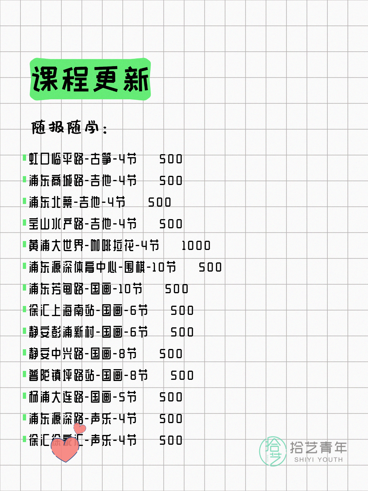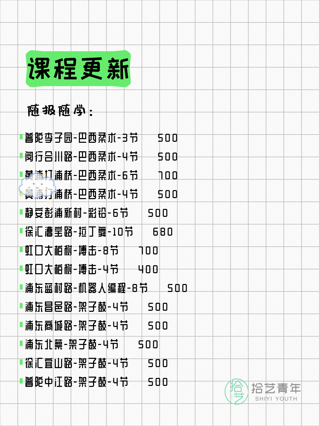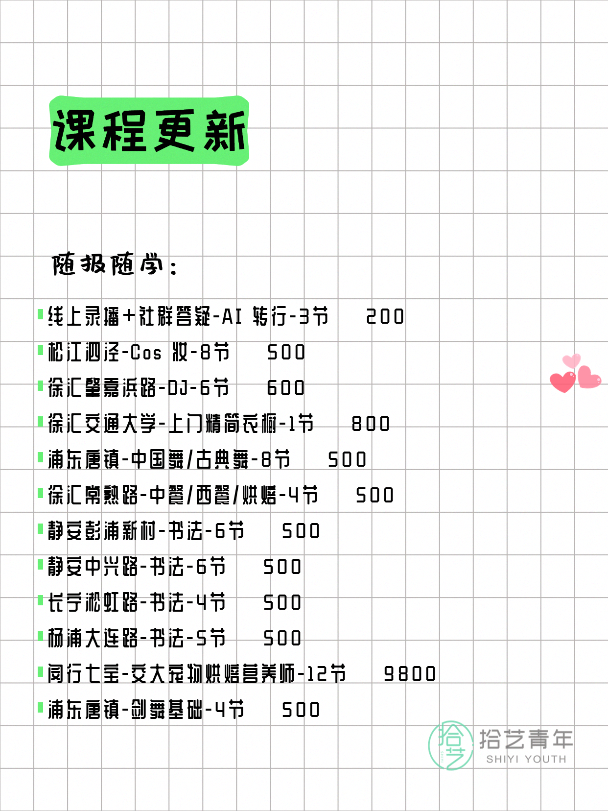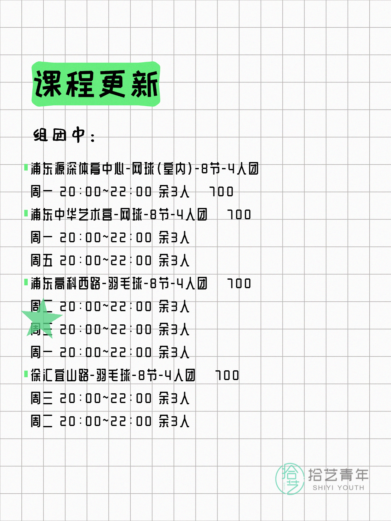资讯>综合>正文4月8日上海夜校课程合集拾艺青年2026-04-081 / 17📊 本期课程概况• 总课程数:368门• 组团中课程:60门• 覆盖区域:15个区详见图片,欢迎报名咨询。💡 提示:以上课程信息来自拾艺青年小程序,课程可能随报名动态变化,具体以小程序实时信息为准。👉 微信小程序链接:#小程序://拾艺青年/WmfwH22mnQUxZwb