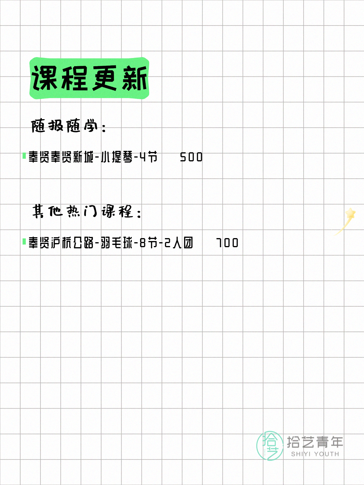 资讯>综合>正文4月8日上海奉贤夜校课程合集拾艺青年2026-04-081 / 2【随报随学】📌 小提琴-奉贤奉贤新城-4节-一人即可 💰500【热门课程推荐】⭐ 羽毛球-奉贤沪杭公路-8节-2人团 💰700详见小程序了解详细信息,欢迎报名咨询。💡 提示:以上课程信息来自拾艺青年小程序,课程可能随报名动态变化,具体以小程序实时信息为准。👉 微信小程序链接:#小程序://拾艺青年/WmfwH22mnQUxZwb