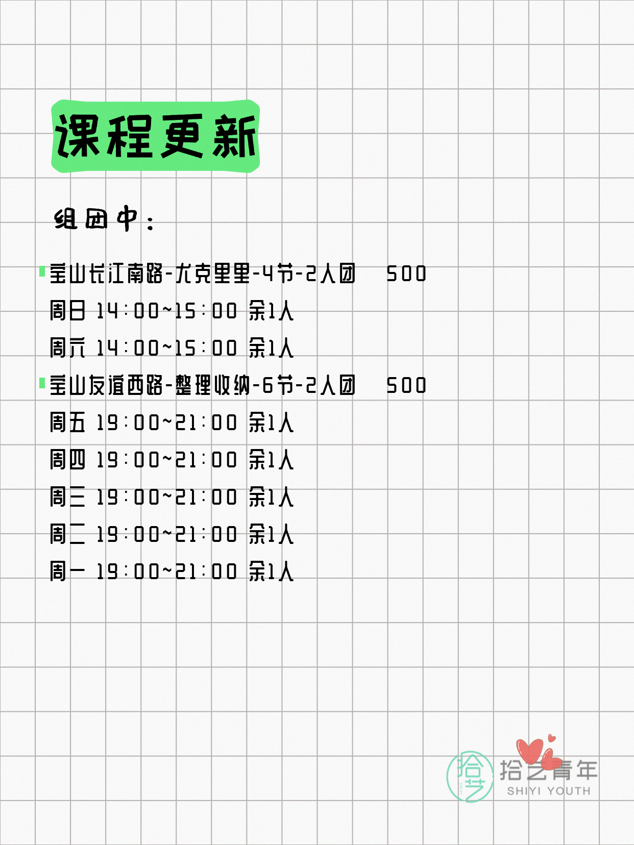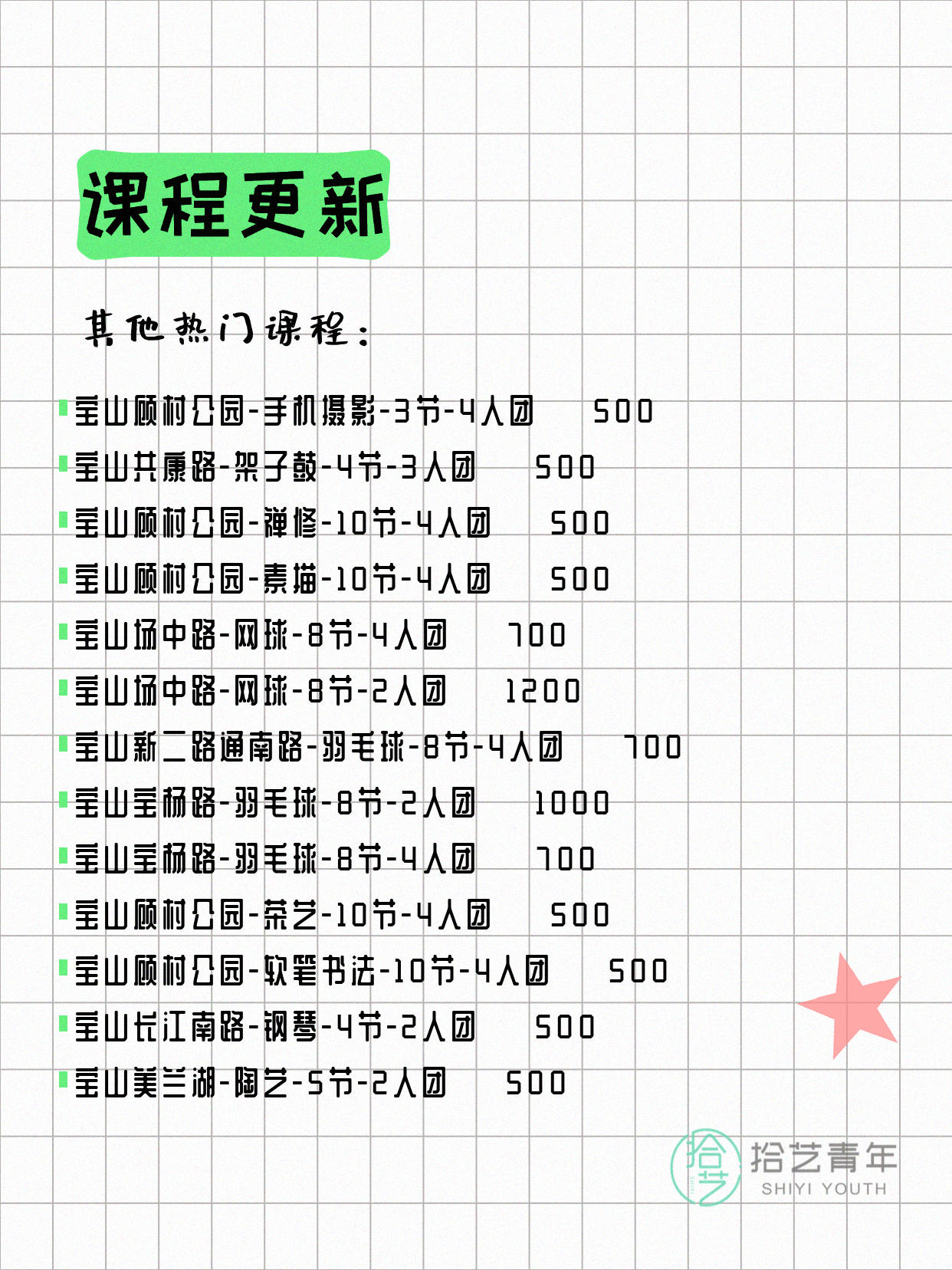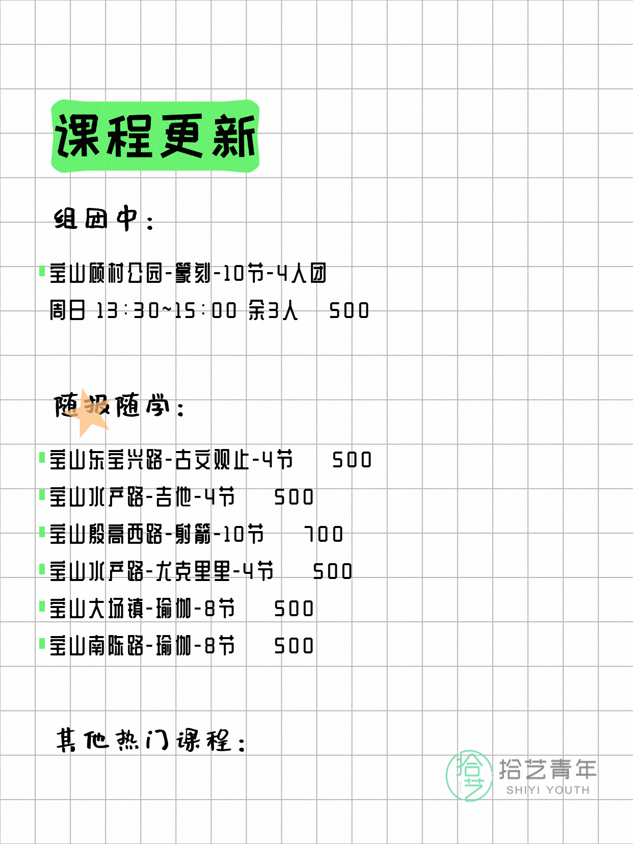 💡 提示:以上课程信息来自拾艺青年小程序,课程可能随报名动态变化,具体以小程序实时信息为准。