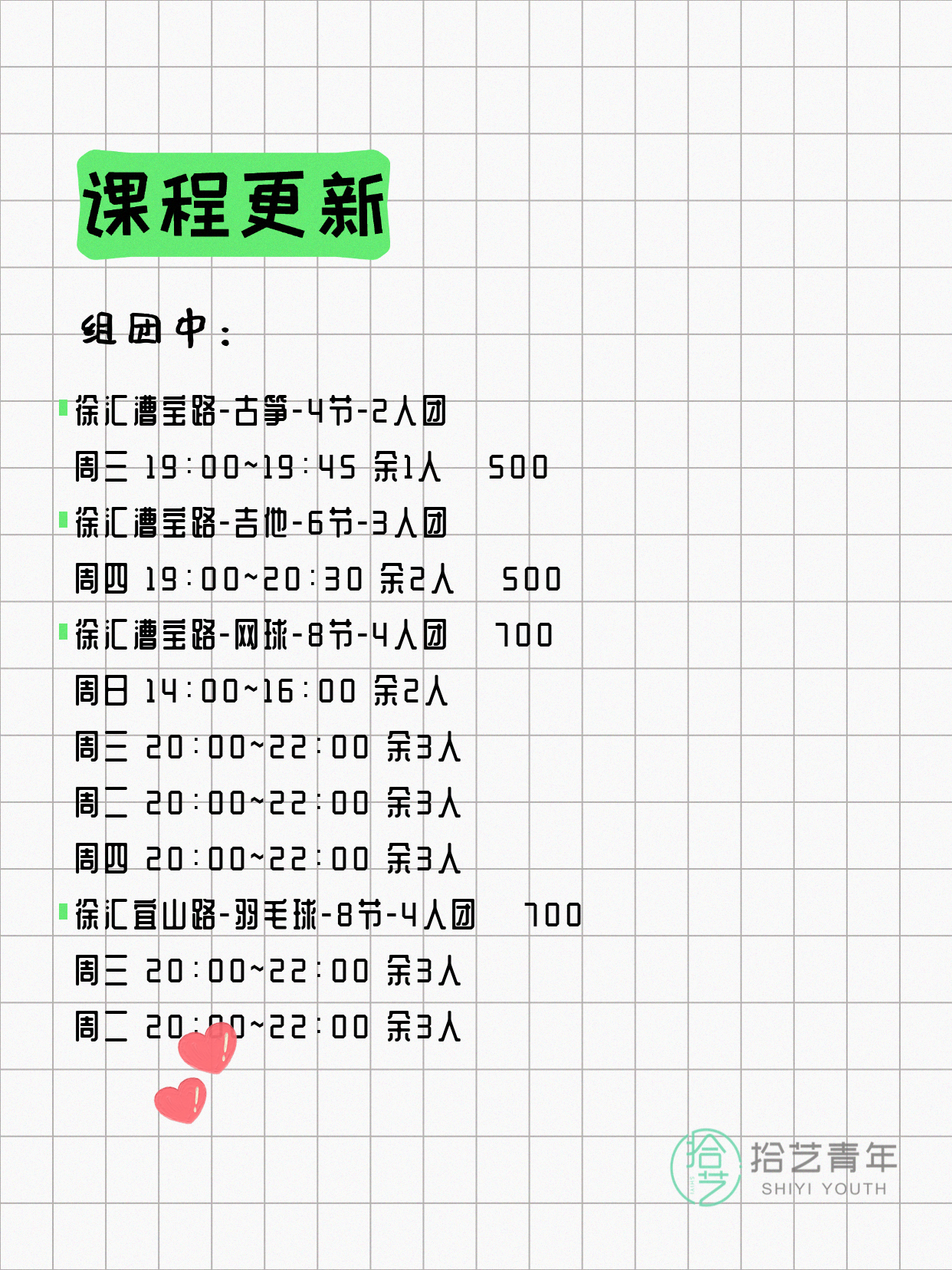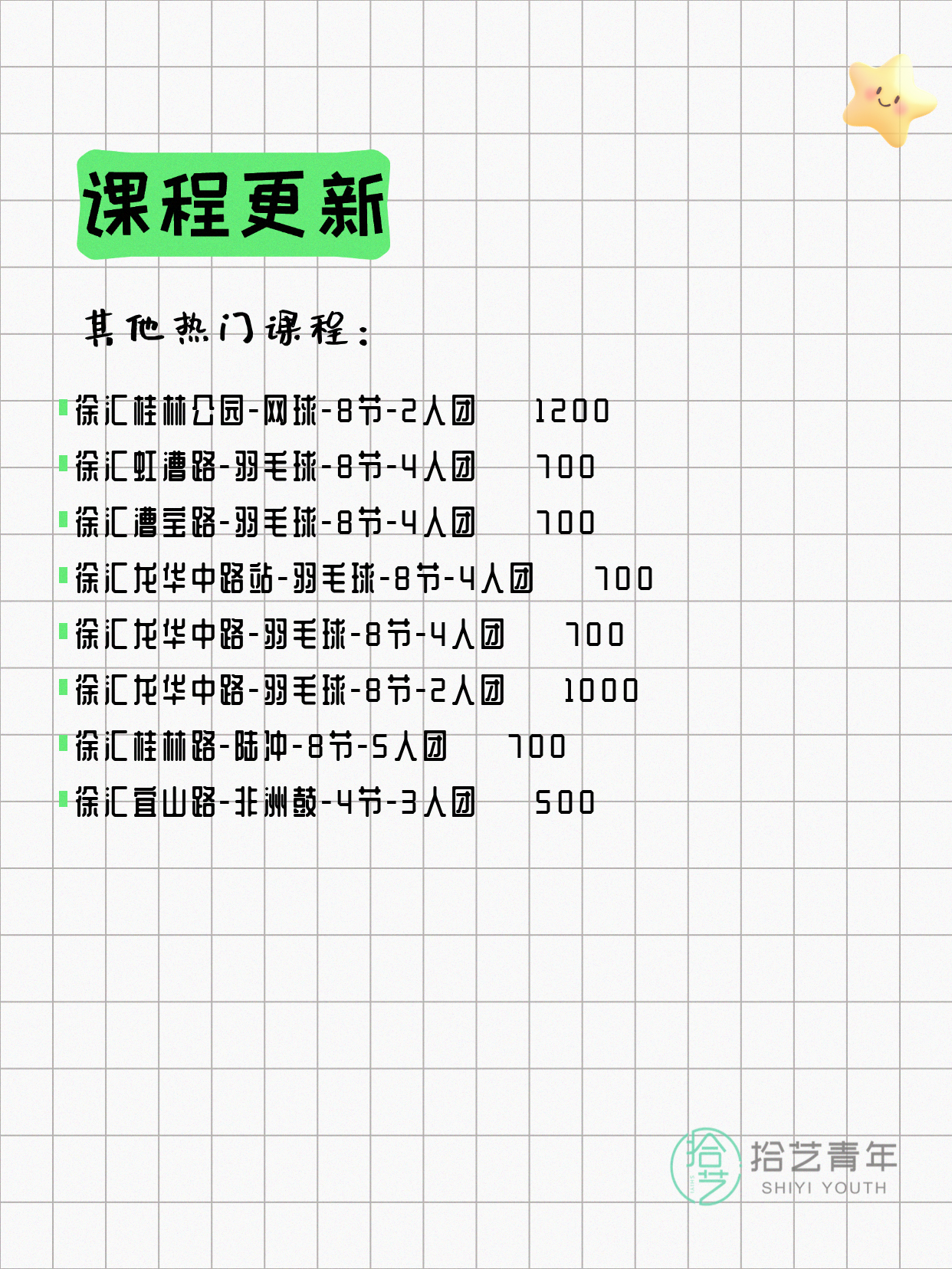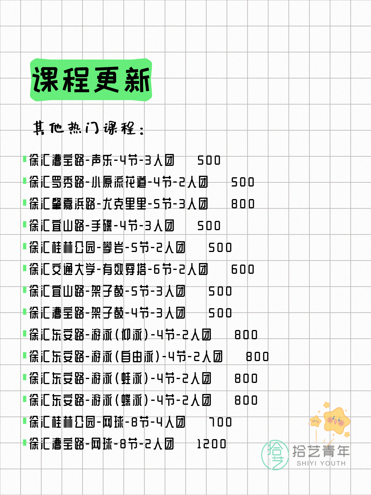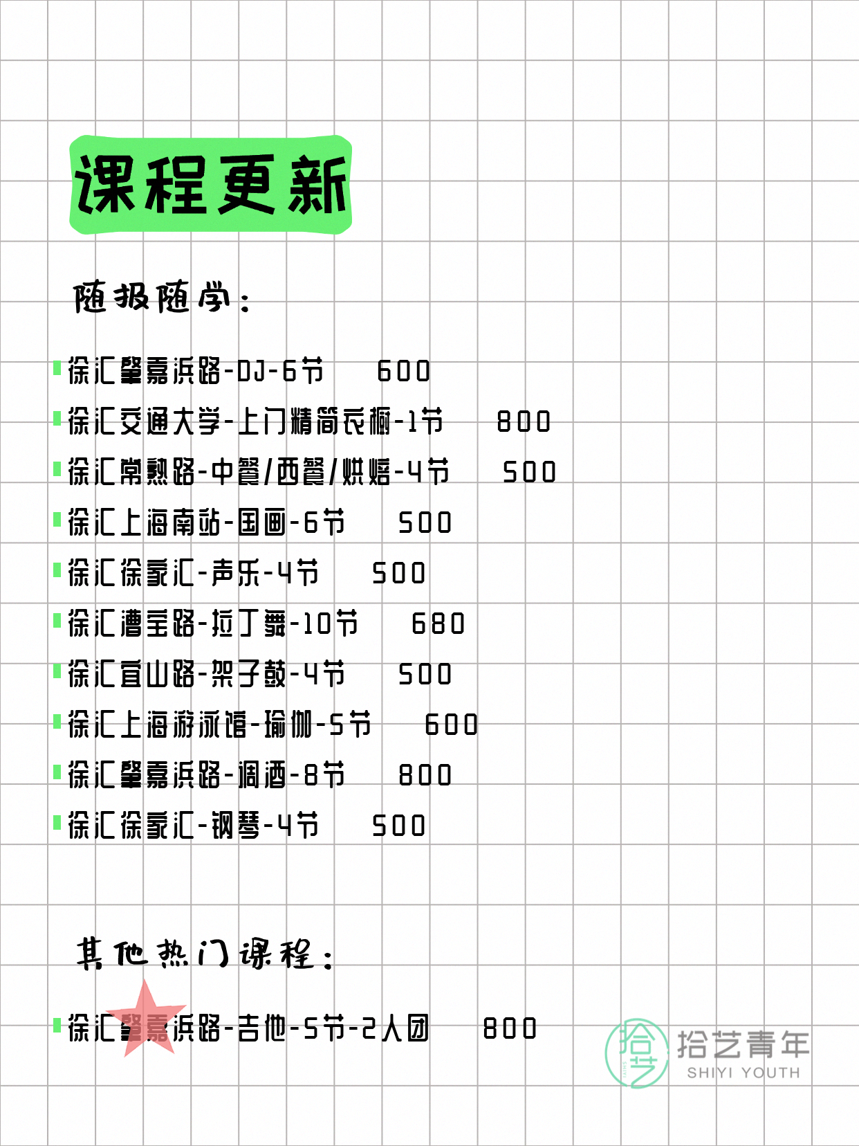 💡 提示:以上课程信息来自拾艺青年小程序,课程可能随报名动态变化,具体以小程序实时信息为准。
