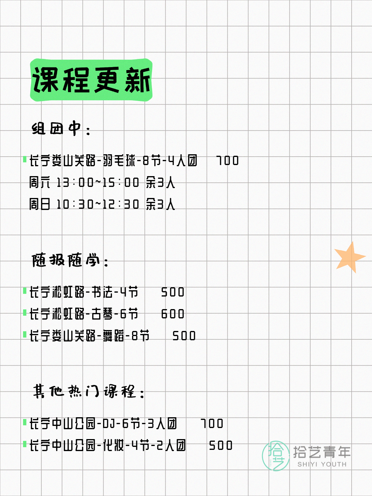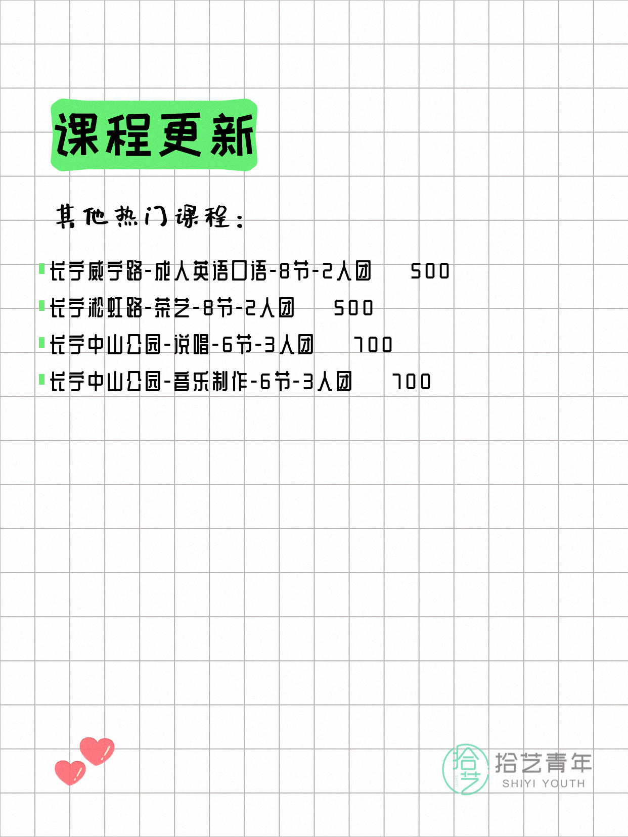 💡 提示:以上课程信息来自拾艺青年小程序,课程可能随报名动态变化,具体以小程序实时信息为准。