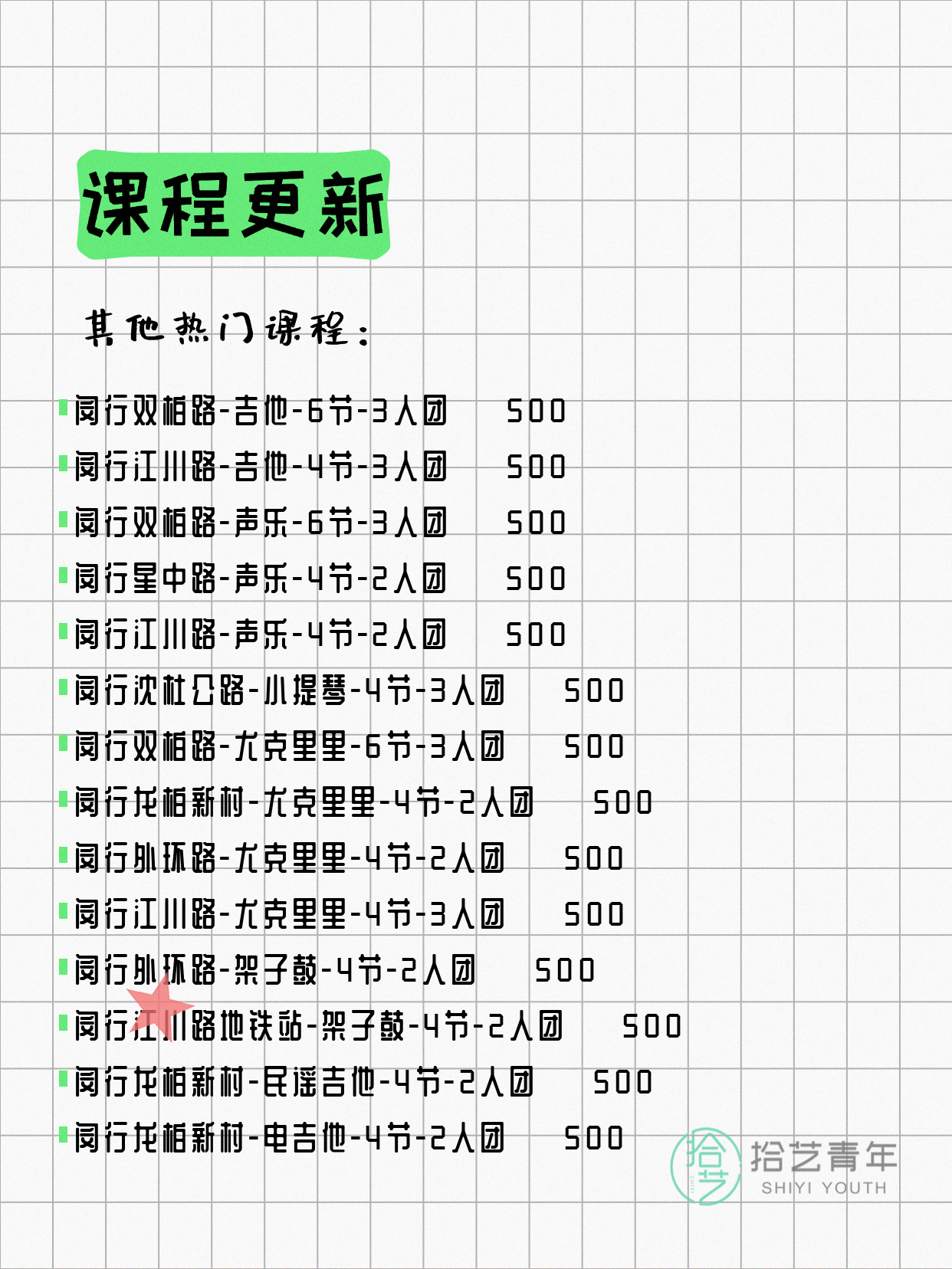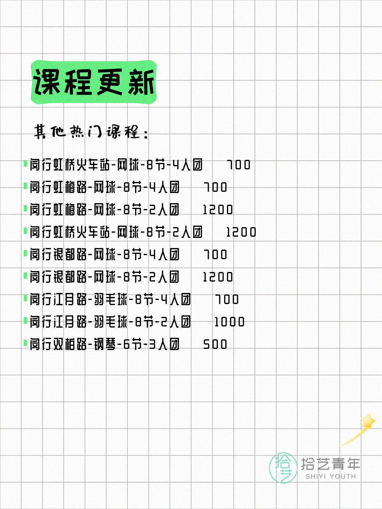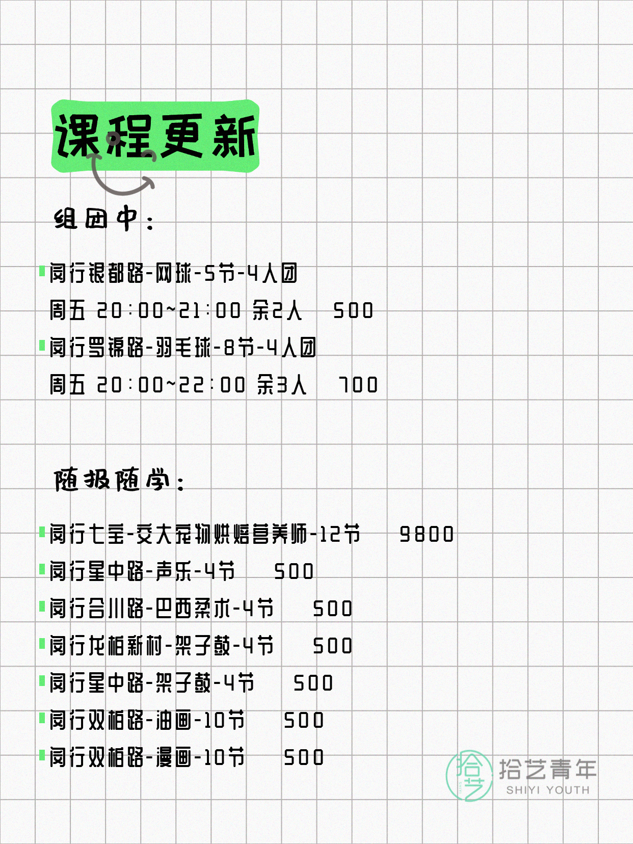 💡 提示:以上课程信息来自拾艺青年小程序,课程可能随报名动态变化,具体以小程序实时信息为准。