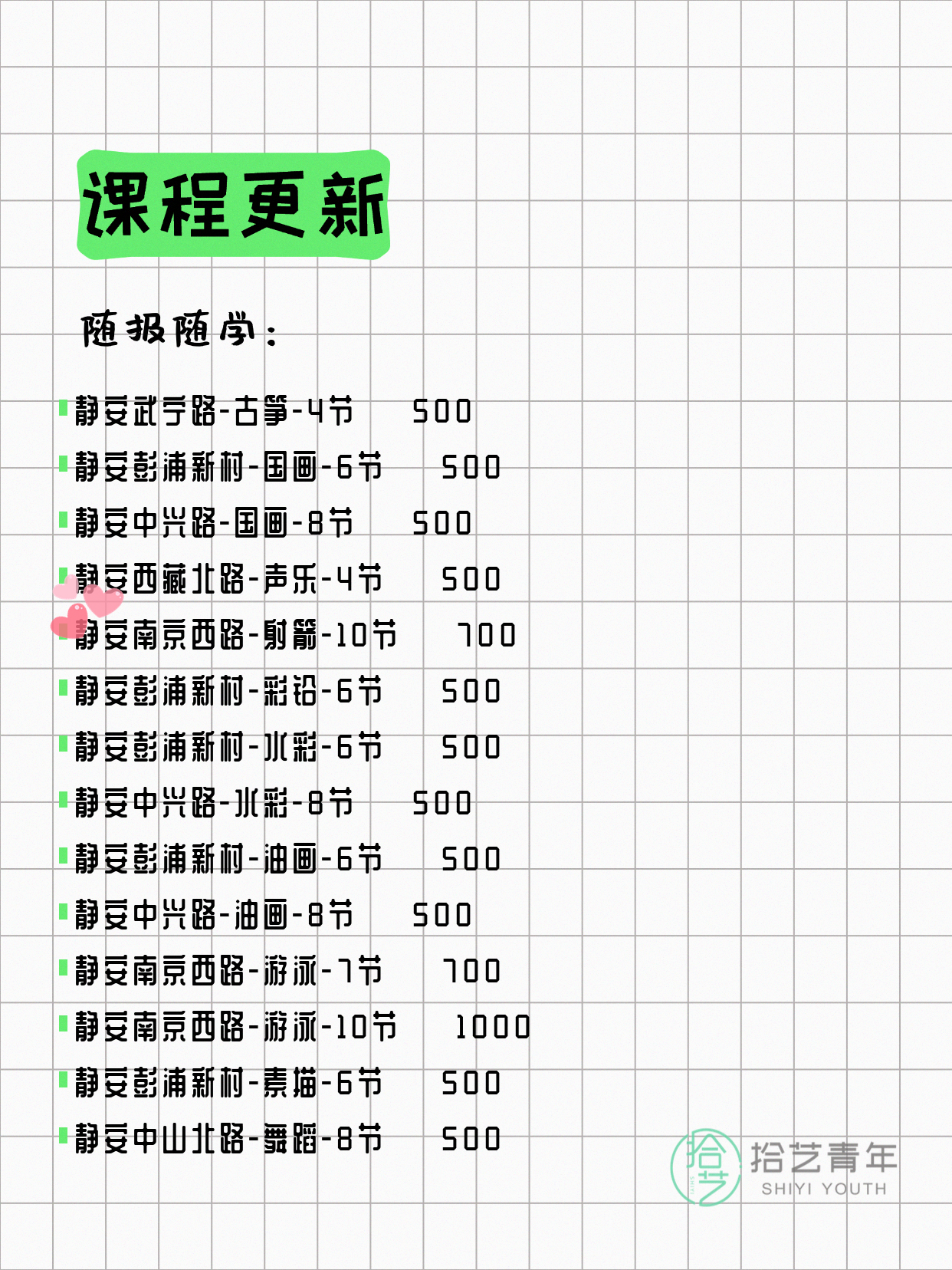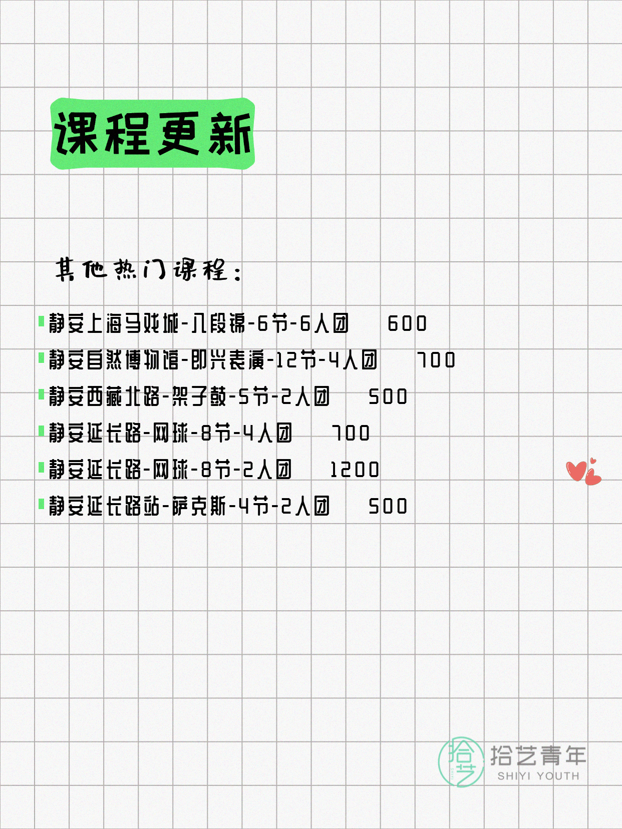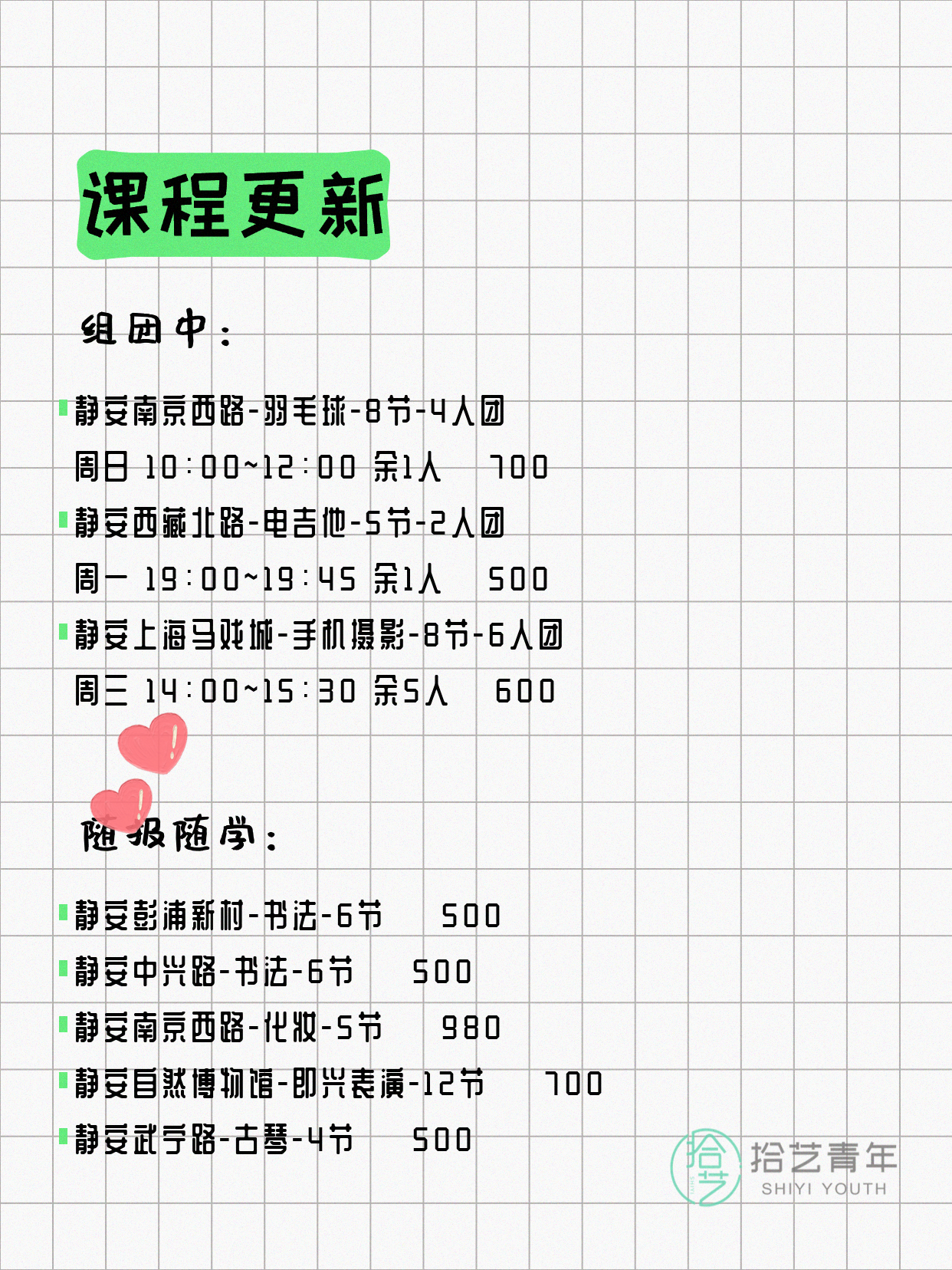 💡 提示:以上课程信息来自拾艺青年小程序,课程可能随报名动态变化,具体以小程序实时信息为准。