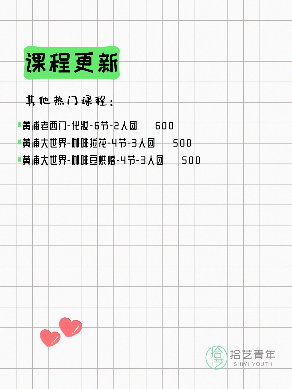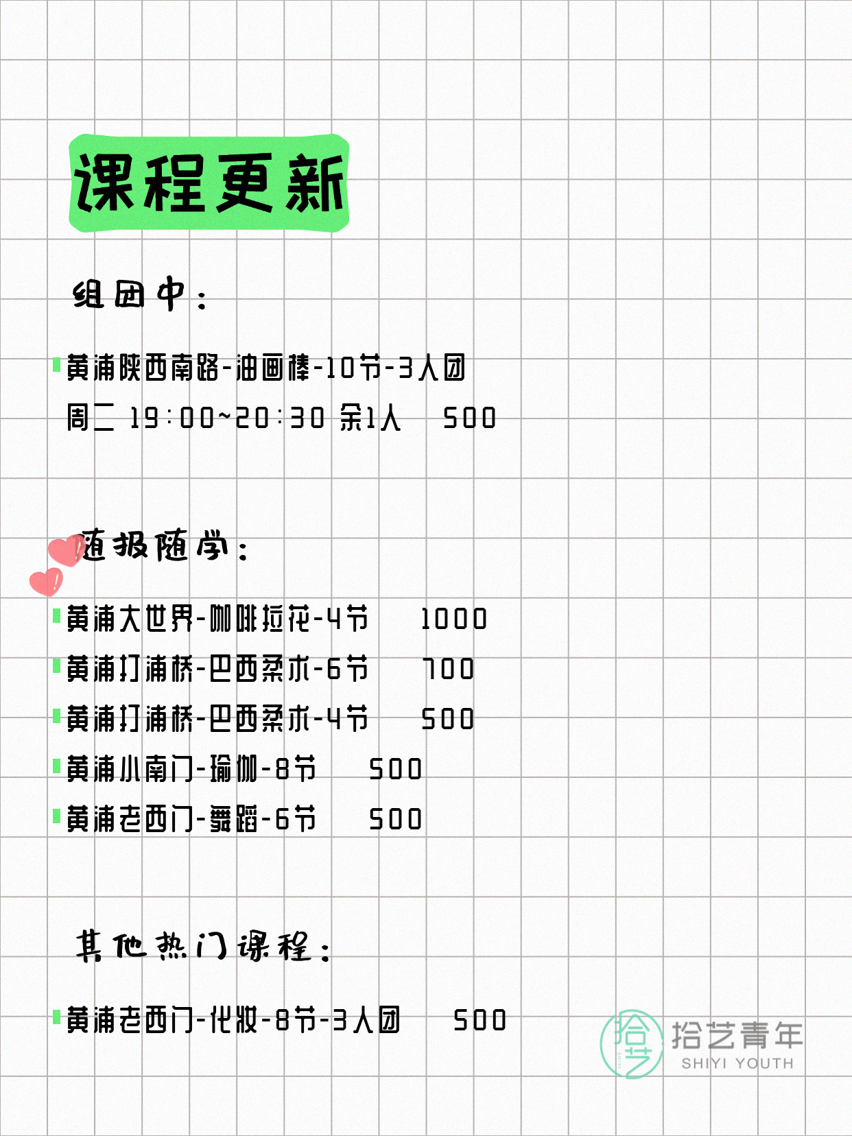 💡 提示:以上课程信息来自拾艺青年小程序,课程可能随报名动态变化,具体以小程序实时信息为准。