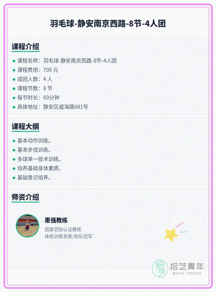 资讯>综合>正文静安南京西路羽毛球差1人 快来拾艺青年2026-04-081 / 2羽毛球课团人差最后1个,早报早开课~🏫 上课地点:静安区威海路681号📅 课程安排:共8节 | 周日 10:00-12:00📖 课程大纲:基本动作训练。基本步伐训练。多球单一技术训练。培养基础身体素质。基础意识培养。👥 4人团 | 已报3人 | 还差1人开课#上海夜校 #静安夜校 #羽毛球课程 #夜校拼团 #上海线下课相关标签#上海夜校#静安夜校#羽毛球课程#夜校拼团#上海线下课