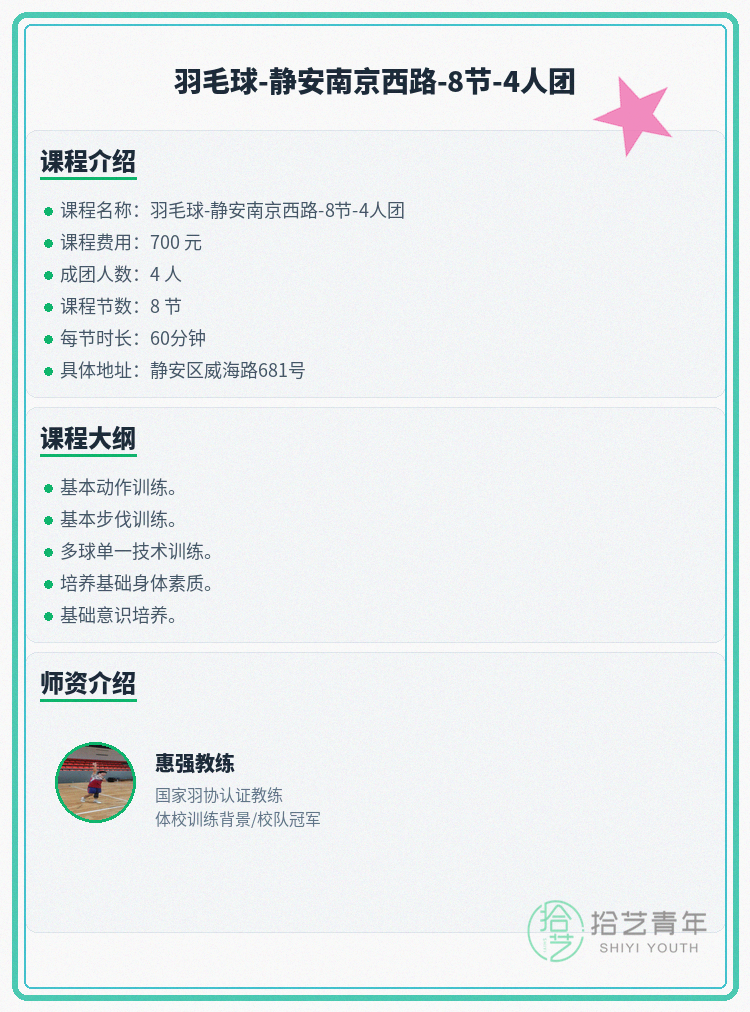 资讯>综合>正文静安羽毛球课差1人即刻开课拾艺青年2026-04-081 / 2南京西路旁羽毛球课就差你!凑齐搭子马上开课🏸🏫 上课地点:静安区威海路681号📅 课程安排:共8节 | 周日 10:00-12:00📖 课程大纲:基本动作训练。基本步伐训练。多球单一技术训练。培养基础身体素质。基础意识培养。👥 4人团 | 已报3人 | 还差1人开课#上海夜校 #静安夜校 #羽毛球课程 #夜校拼团 #上海线下课相关标签#上海夜校#静安夜校#羽毛球课程#夜校拼团#上海线下课
