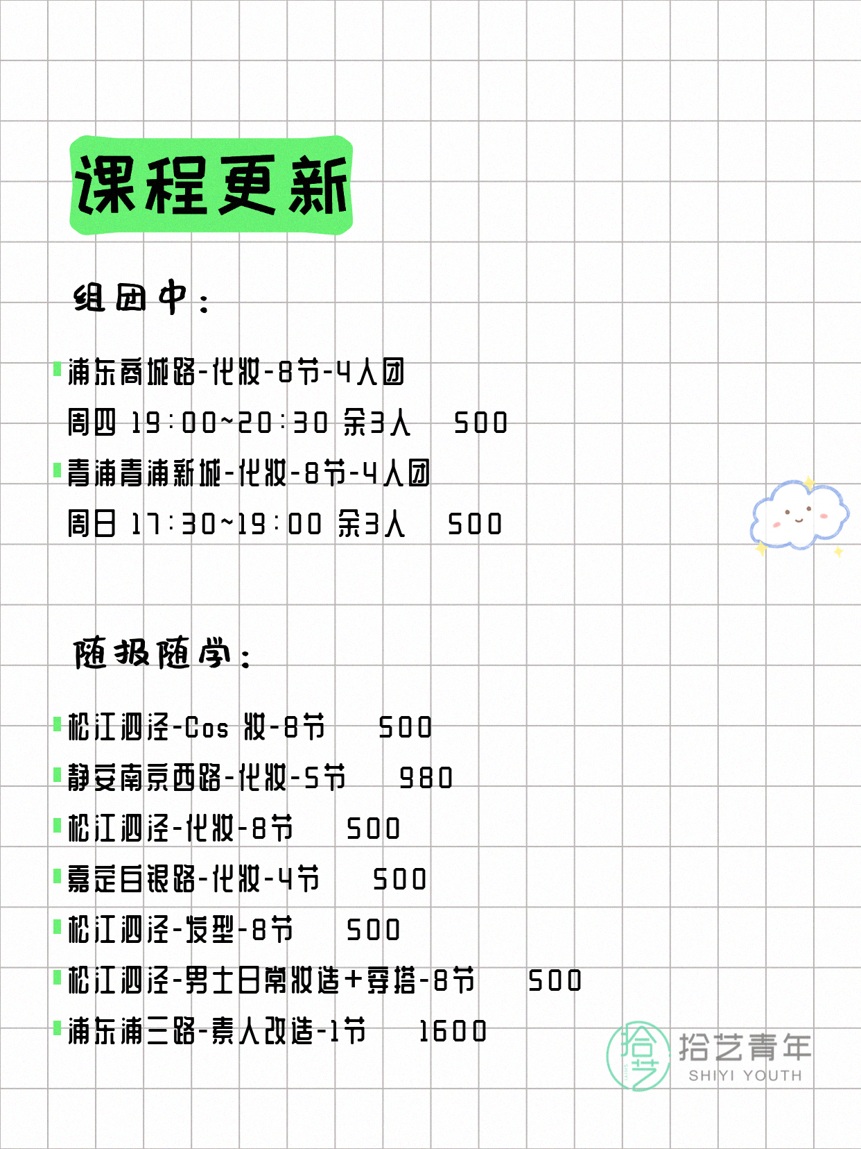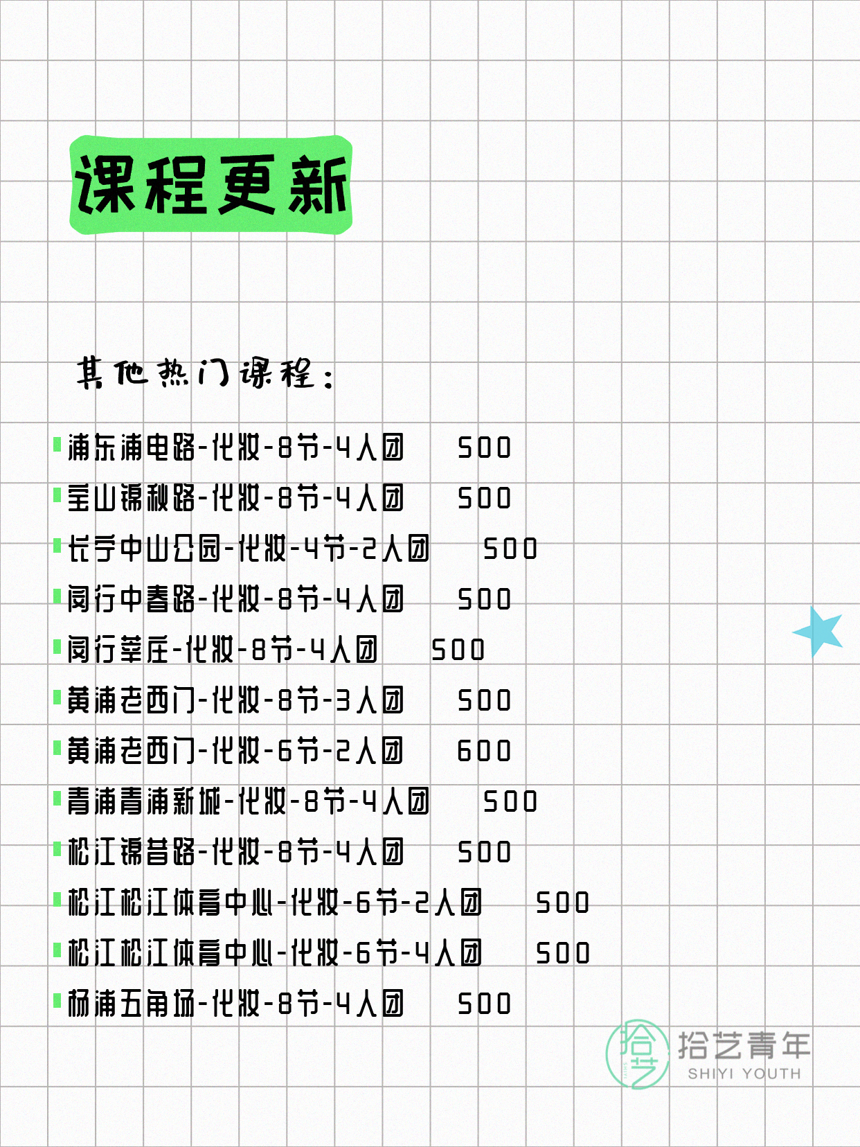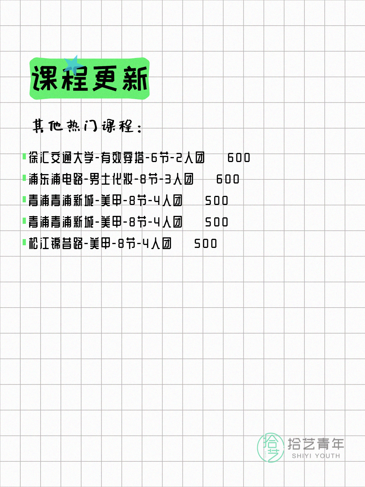 💡 提示:以上课程信息来自拾艺青年小程序,课程可能随报名动态变化,具体以小程序实时信息为准。